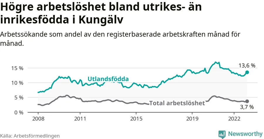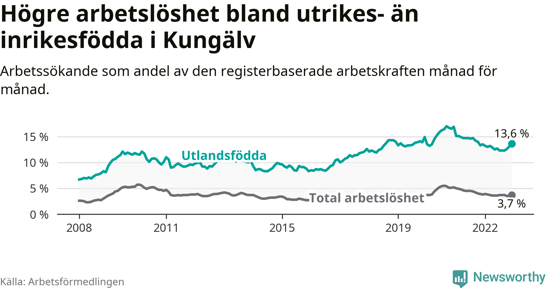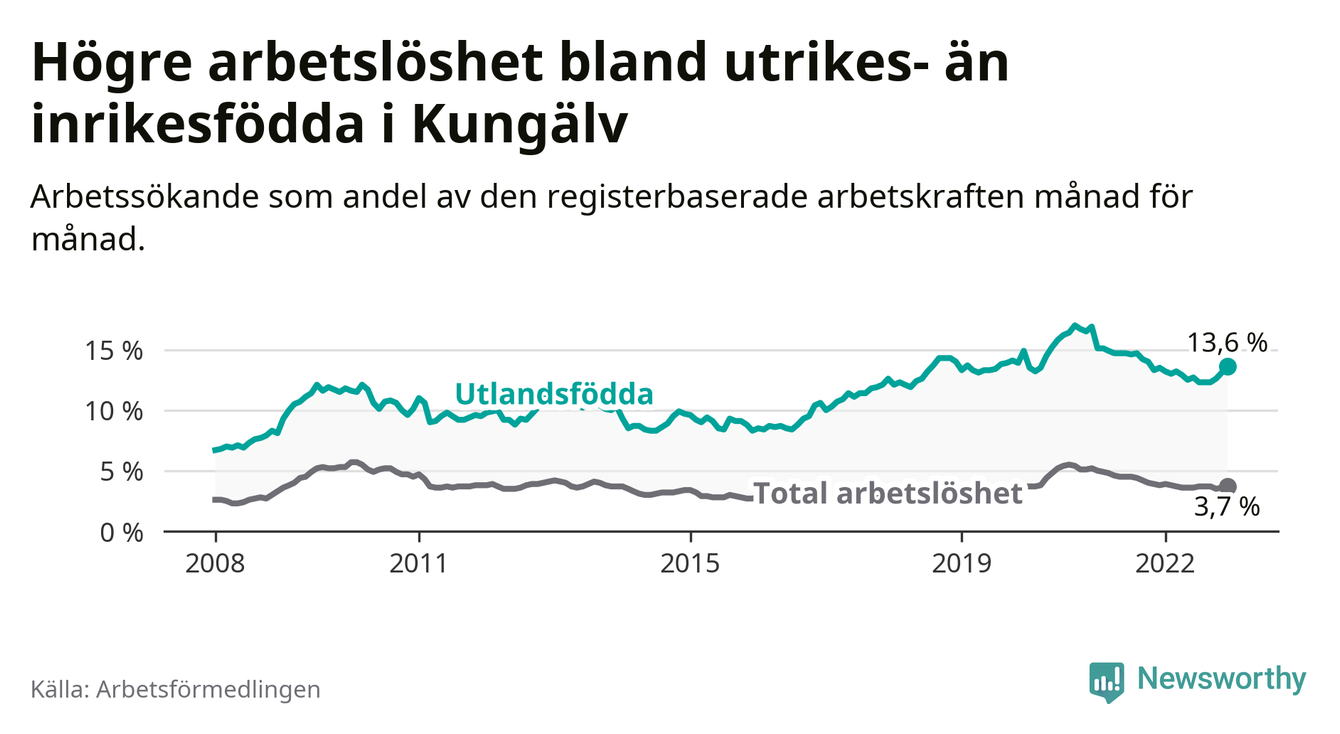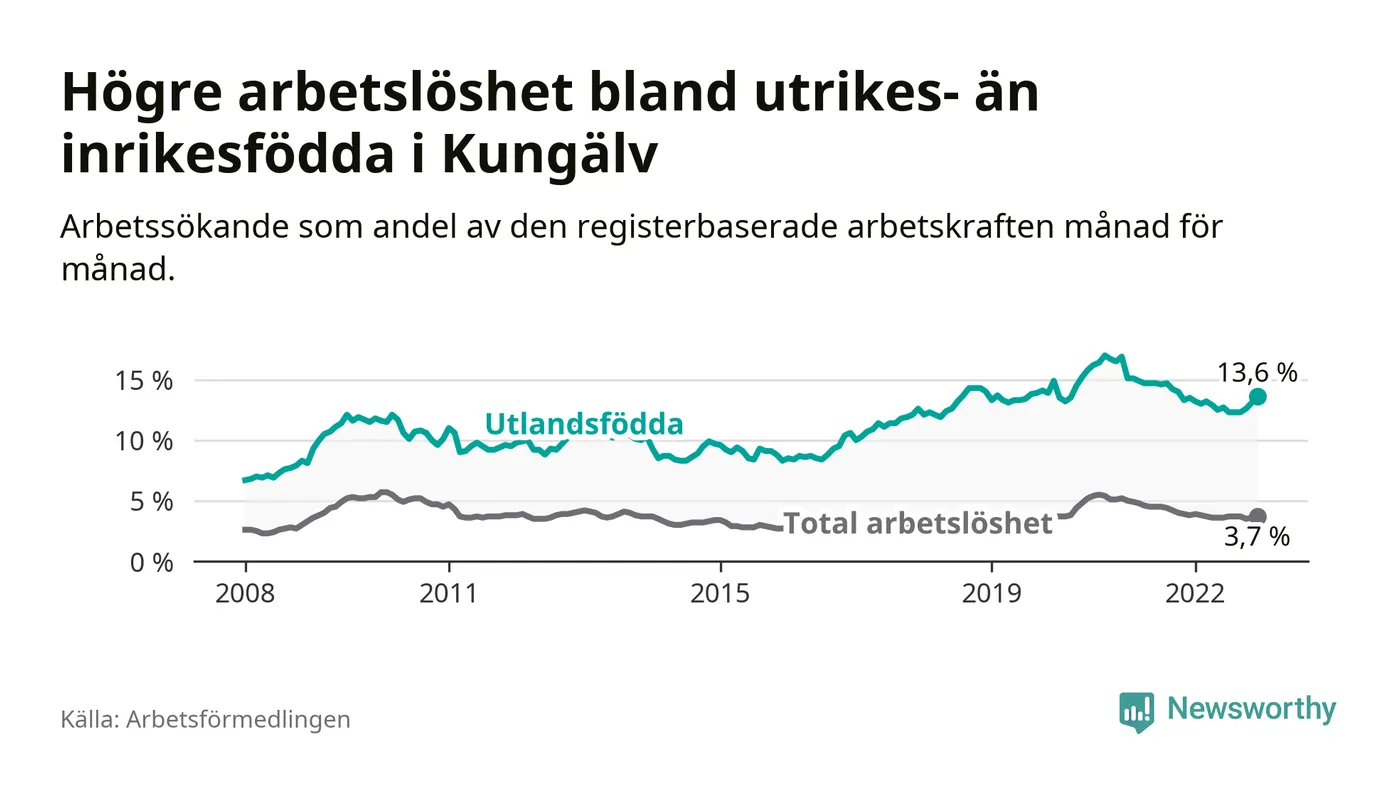 Arbetslösheten bland utlandsfödda var 13,6 procent i Kungälv under december månad, motsvarande 417 av 3 066 personer. Det är 0,1 procentenheter fler än vid samma tidpunkt i fjol (+20 om man räknar personer). Den senaste månadens uppgång innebär ett trendbrott. Under de 19 föregående månaderna hade arbetslösheten bland utlandsfödda varit lägre än motsvarande tidpunkt året innan.