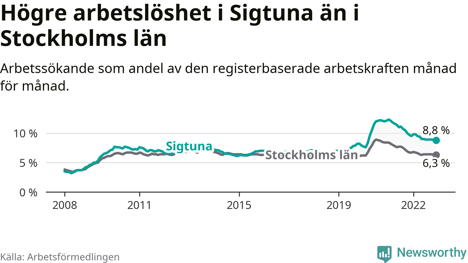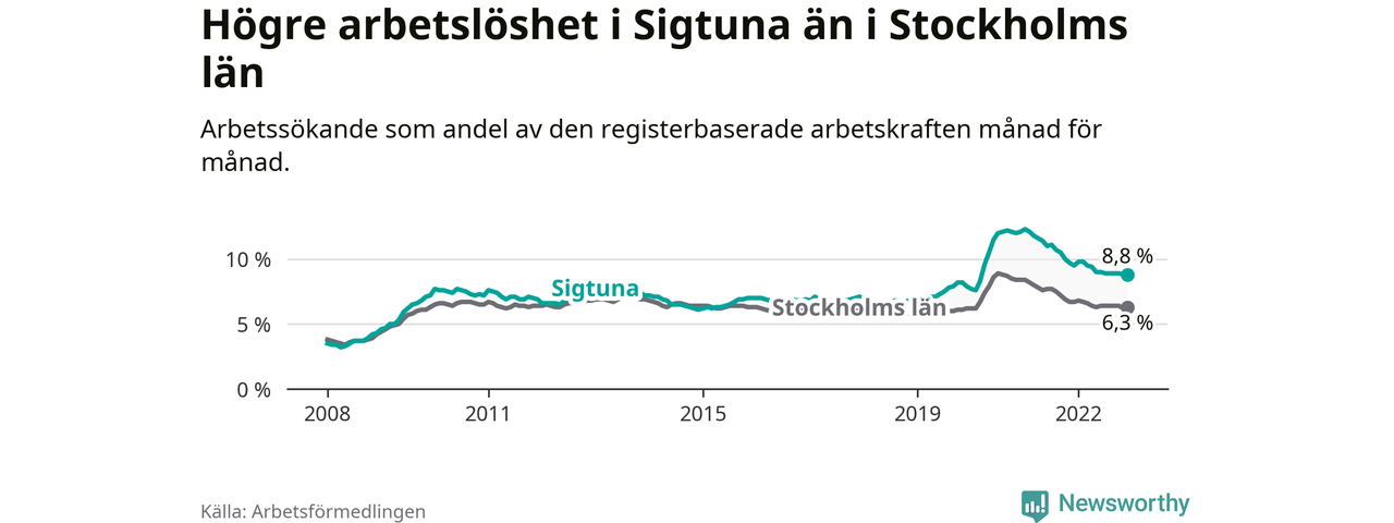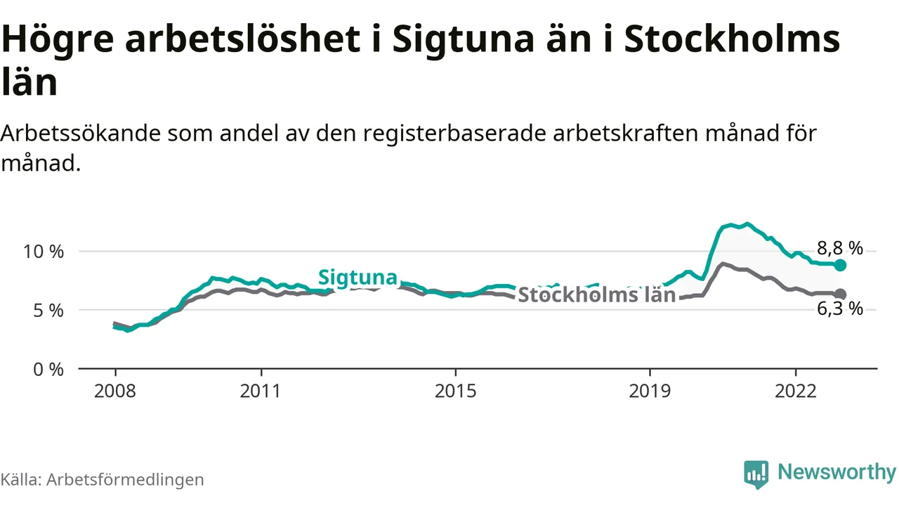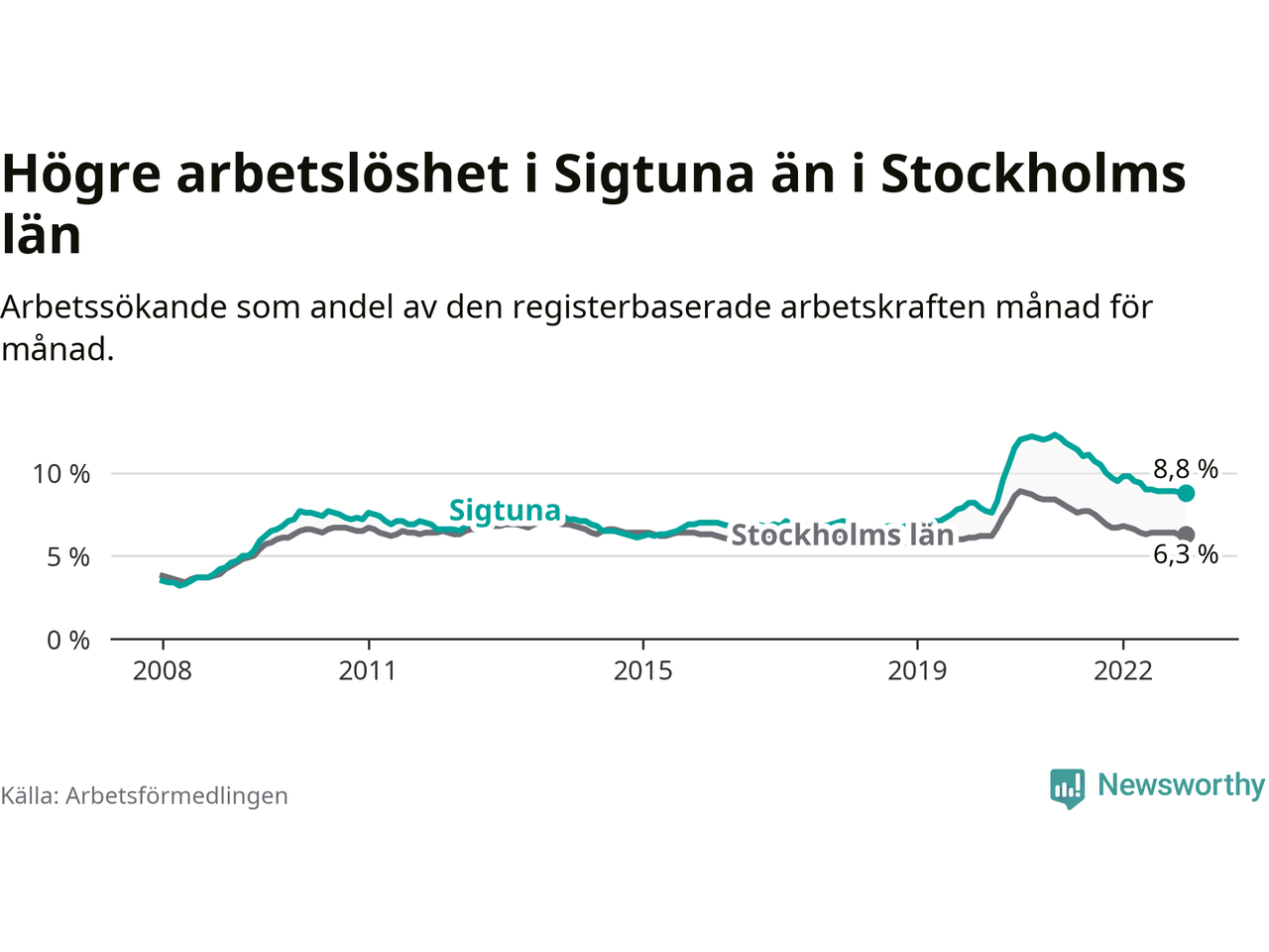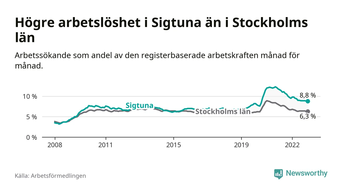 Även om arbetslösheten i Sigtuna alltså minskar, så ligger den fortfarande över snittet i hela Stockholms län (8,8 procent i kommunen, jämfört med 6,3 procent i hela länet). Ekerö och Vaxholm har den lägsta arbetslösheten i länet (3,2 procent), medan Botkyrka har den högsta (11,1 procent). För att Sigtuna skulle komma ner i samma arbetslöshetsnivå som Ekerö och Vaxholm skulle 1 386 personer behöva sysselsättas.
