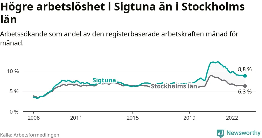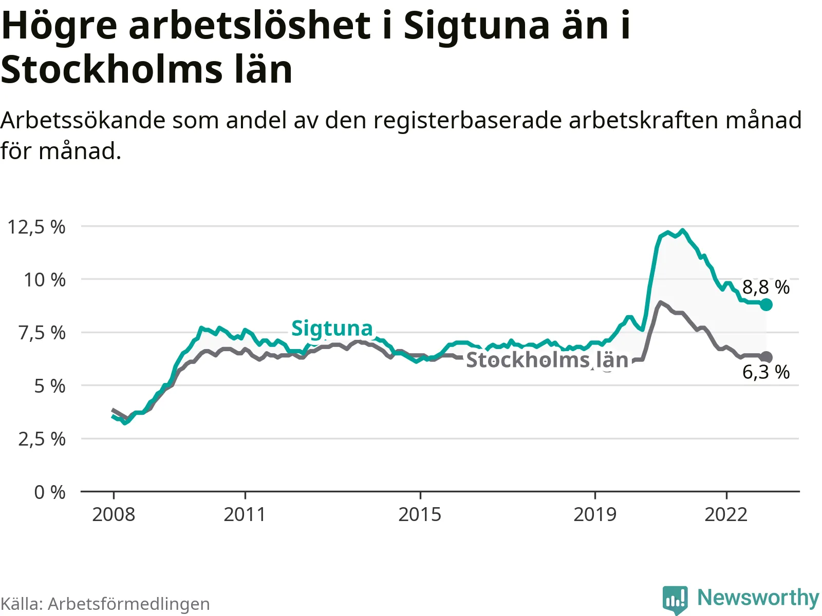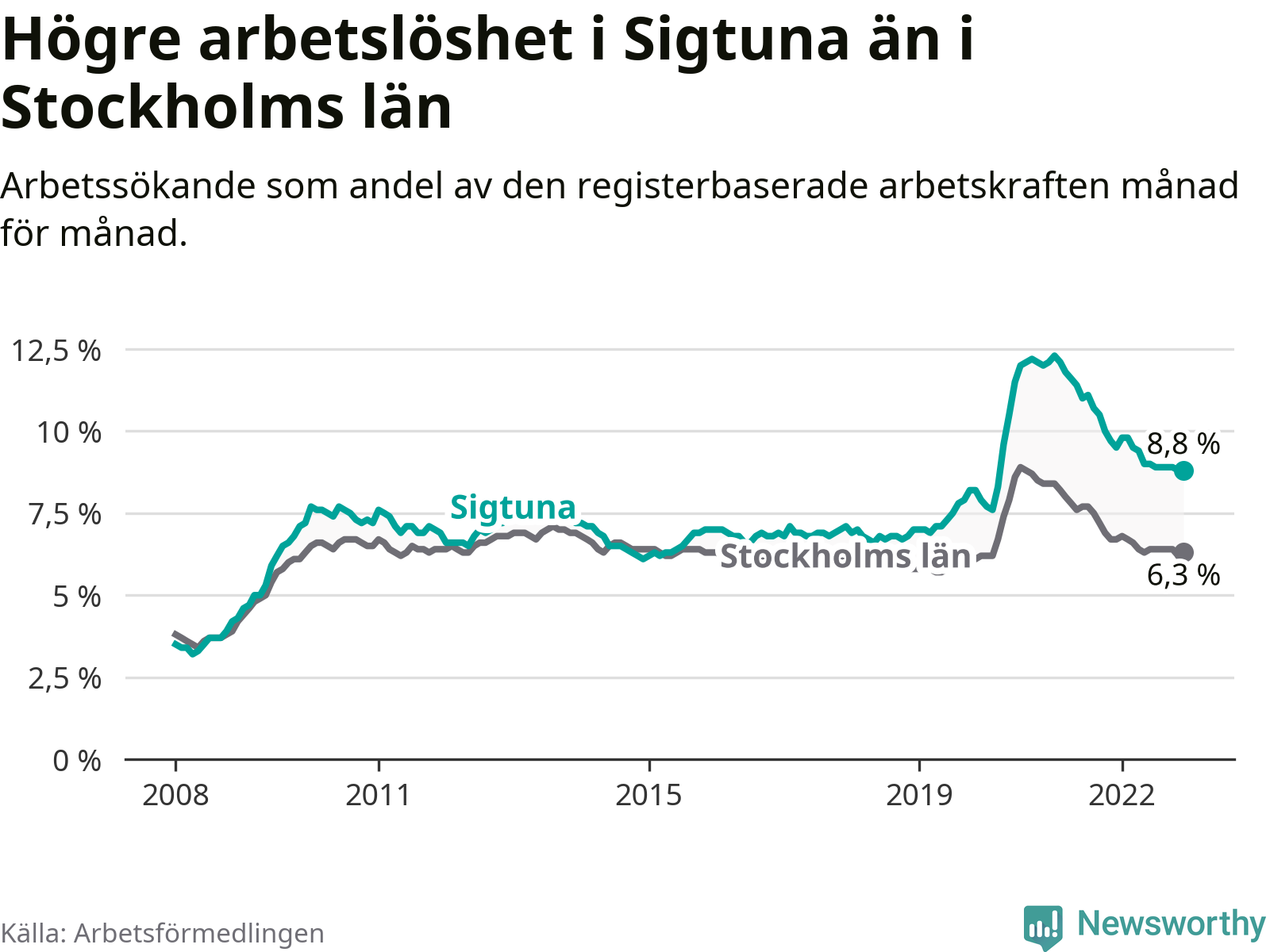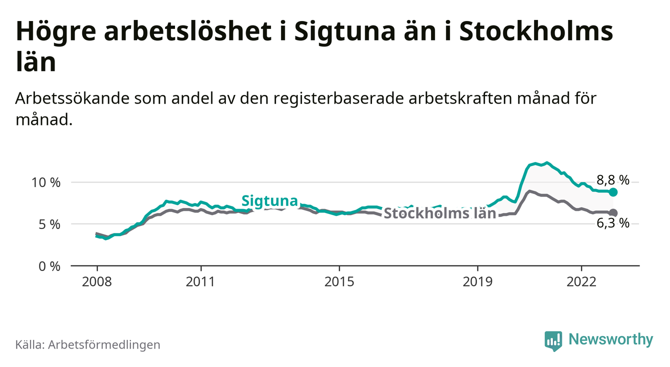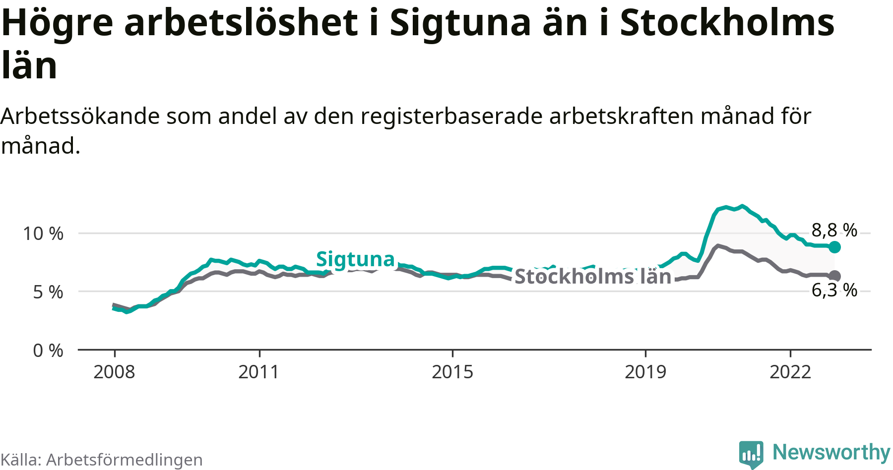 Även om arbetslösheten i Sigtuna alltså minskar, så ligger den fortfarande över snittet i hela Stockholms län (8,8 procent i kommunen, jämfört med 6,3 procent i hela länet). Ekerö och Vaxholm har den lägsta arbetslösheten i länet (3,2 procent), medan Botkyrka har den högsta (11,1 procent). För att Sigtuna skulle komma ner i samma arbetslöshetsnivå som Ekerö och Vaxholm skulle 1 386 personer behöva sysselsättas.