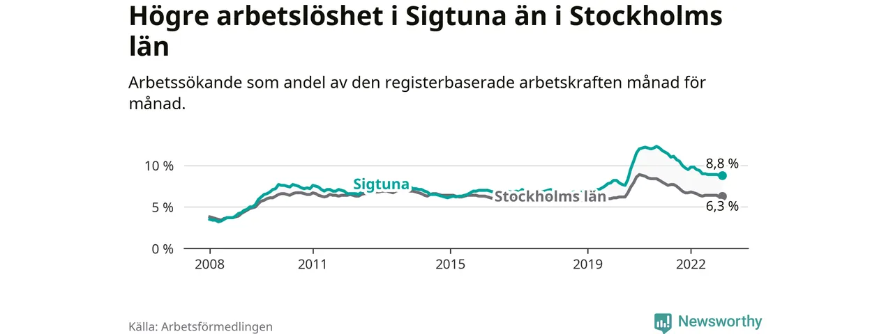 Det är 19:e månaden i följd som arbetslösheten i Sigtuna är lägre än den var under samma tidpunkt året innan. Sedan maj 2021 har arbetslösheten gått ner från 11,4 till 8,8 procent.