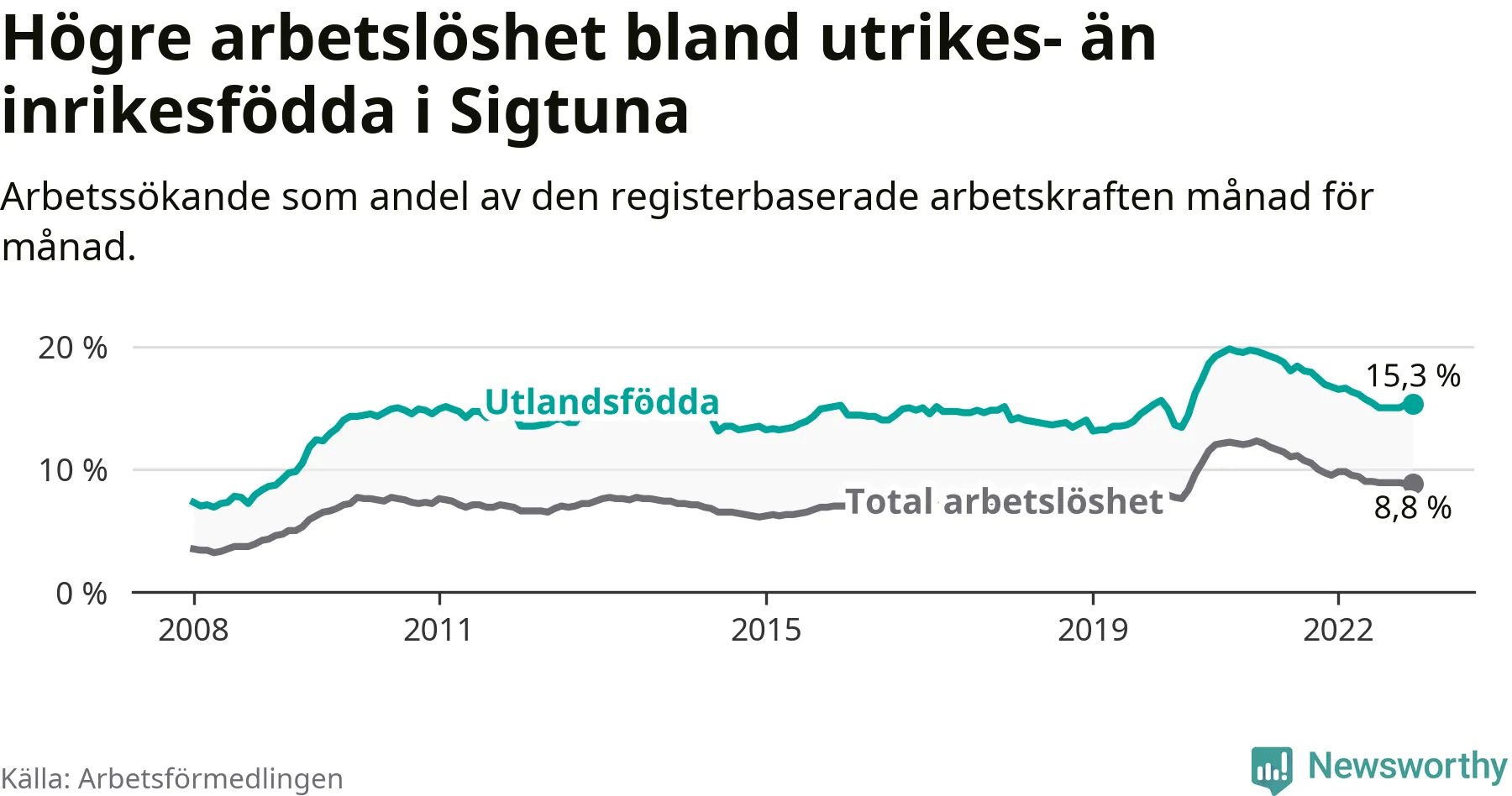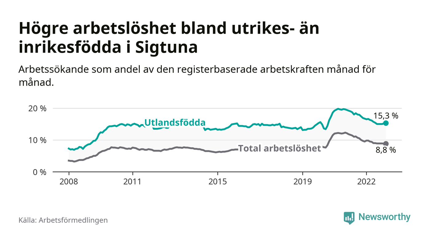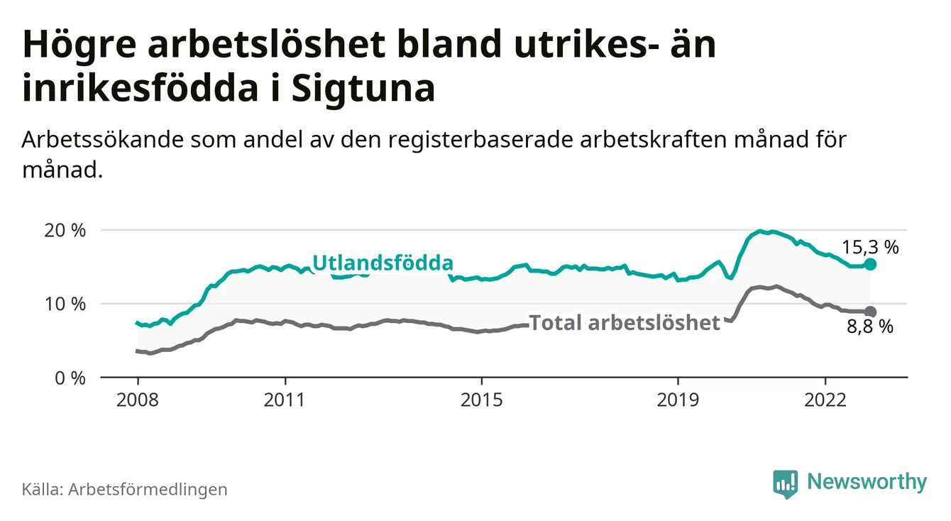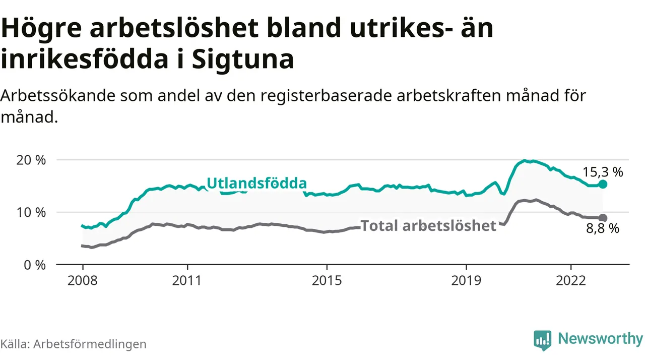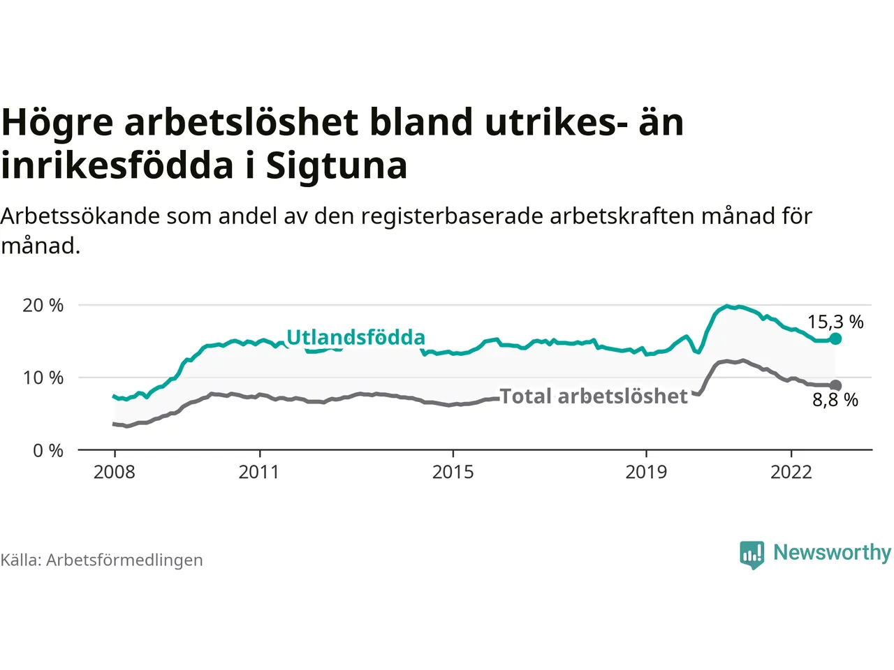 Skillnaden i arbetslöshet mellan utrikesfödda och hela befolkningen är 6,5 procentenheter i Sigtuna. Det är en mindre skillnad än för ett år sedan (−0,7 procentenheter).