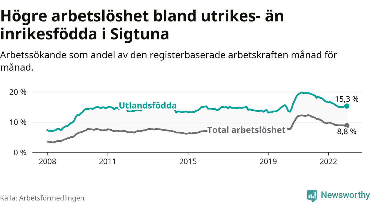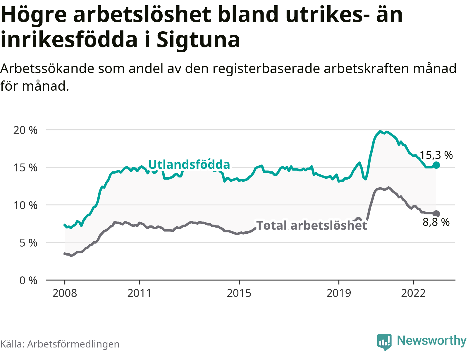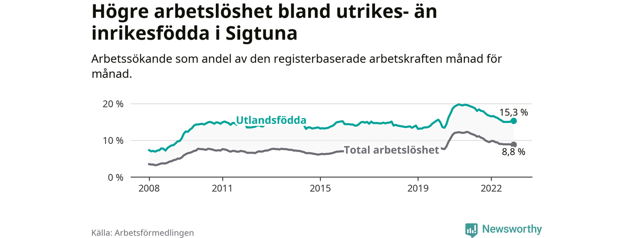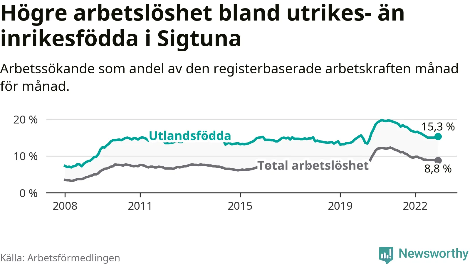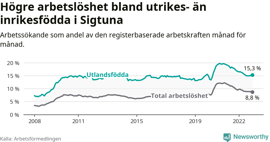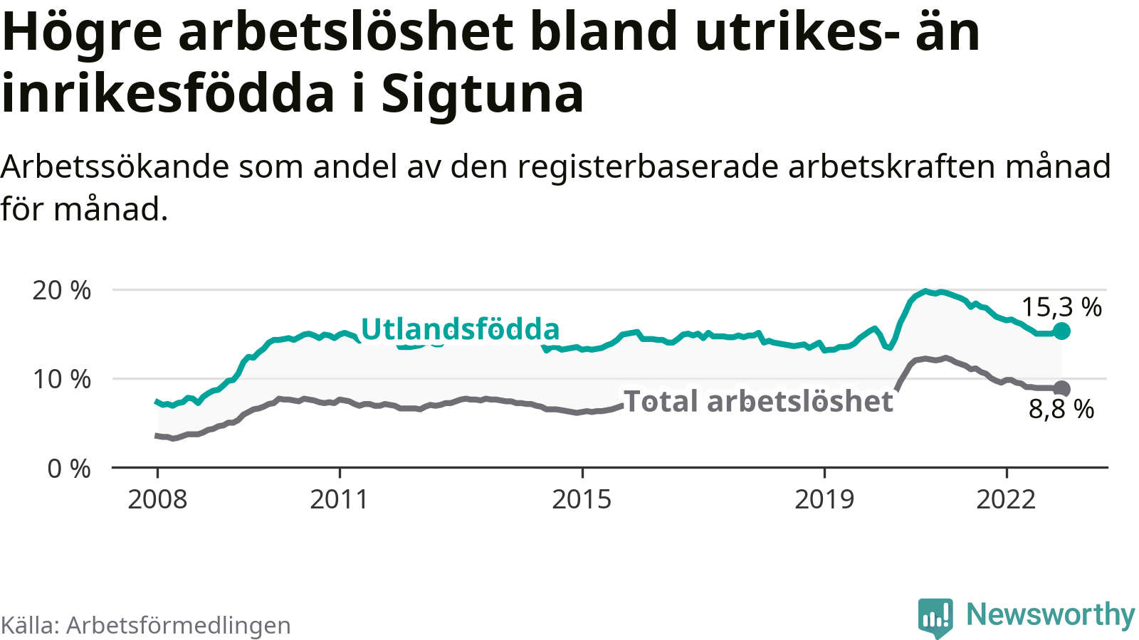 Skillnaden i arbetslöshet mellan utrikesfödda och hela befolkningen är 6,5 procentenheter i Sigtuna. Det är en mindre skillnad än för ett år sedan (−0,7 procentenheter).