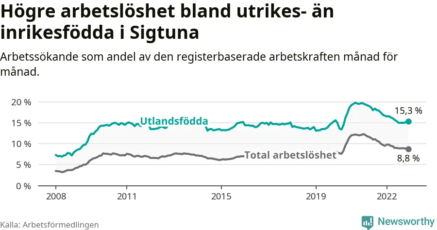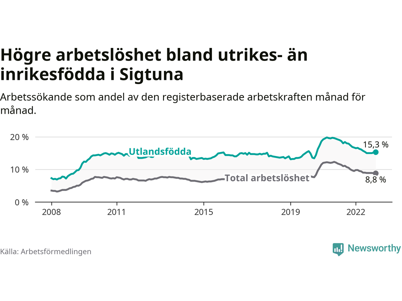 Arbetslösheten bland utlandsfödda var 15,3 procent i Sigtuna under december månad, motsvarande 1 659 av 10 843 personer. Det är 1,4 procentenheter färre än vid samma tidpunkt i fjol (−189 om man räknar personer). Därmed är de utlandsföddas arbetslöshet lägre än vid samma tidpunkt i fjol för 19:e månaden i följd. Sedan maj 2021 har arbetslösheten bland utlandsfödda minskat från 18,7 till 15,3 procent.
