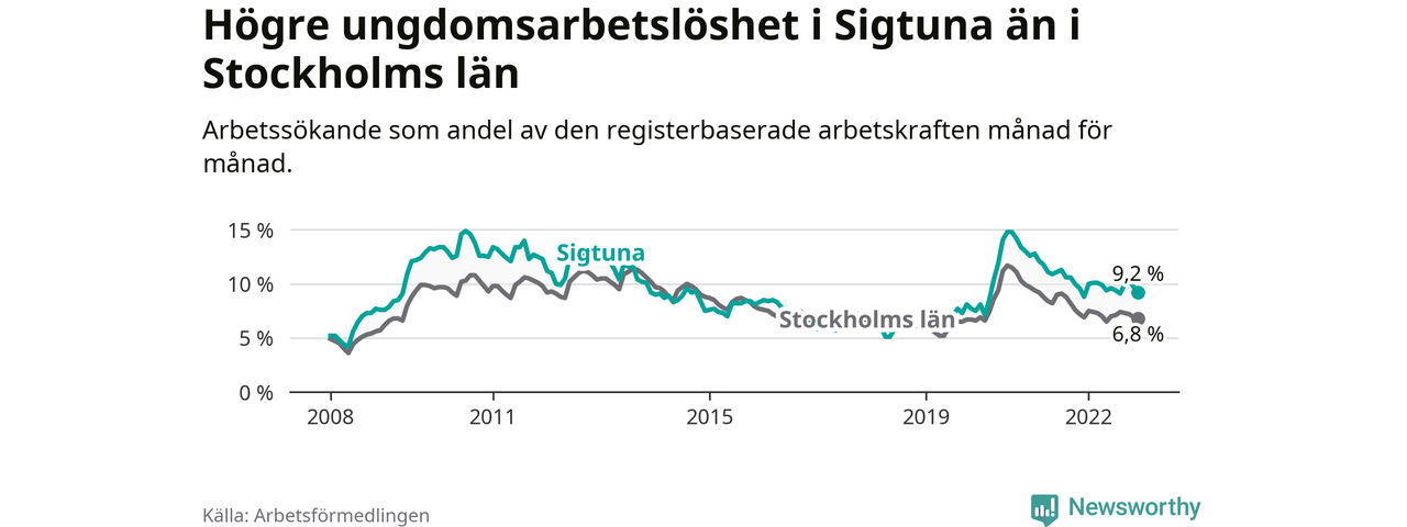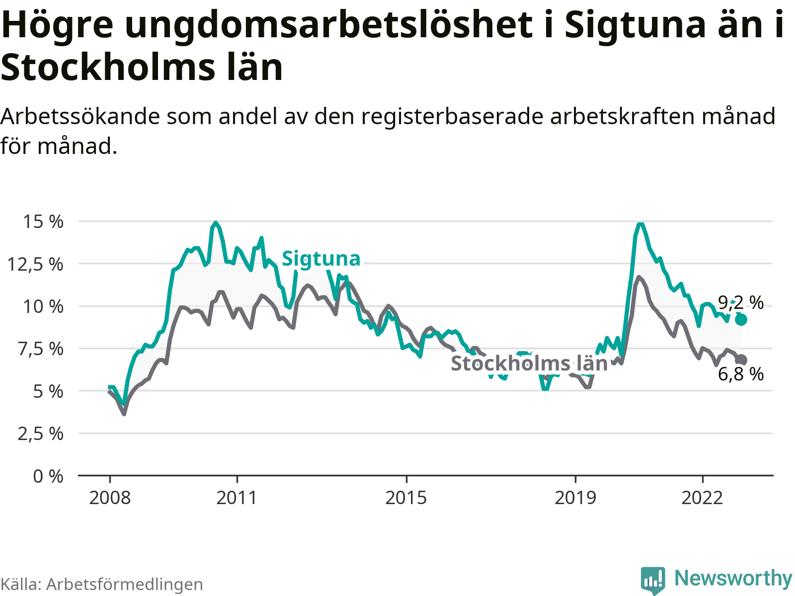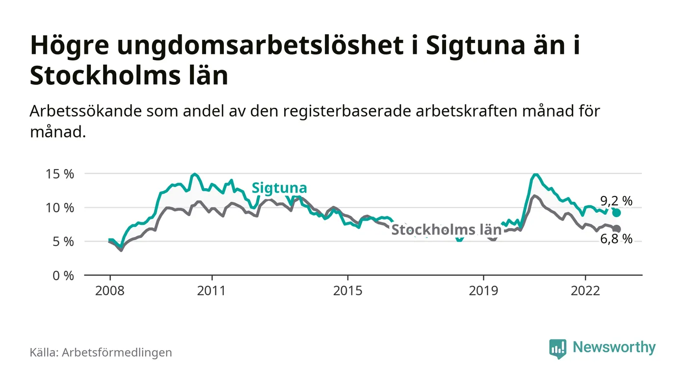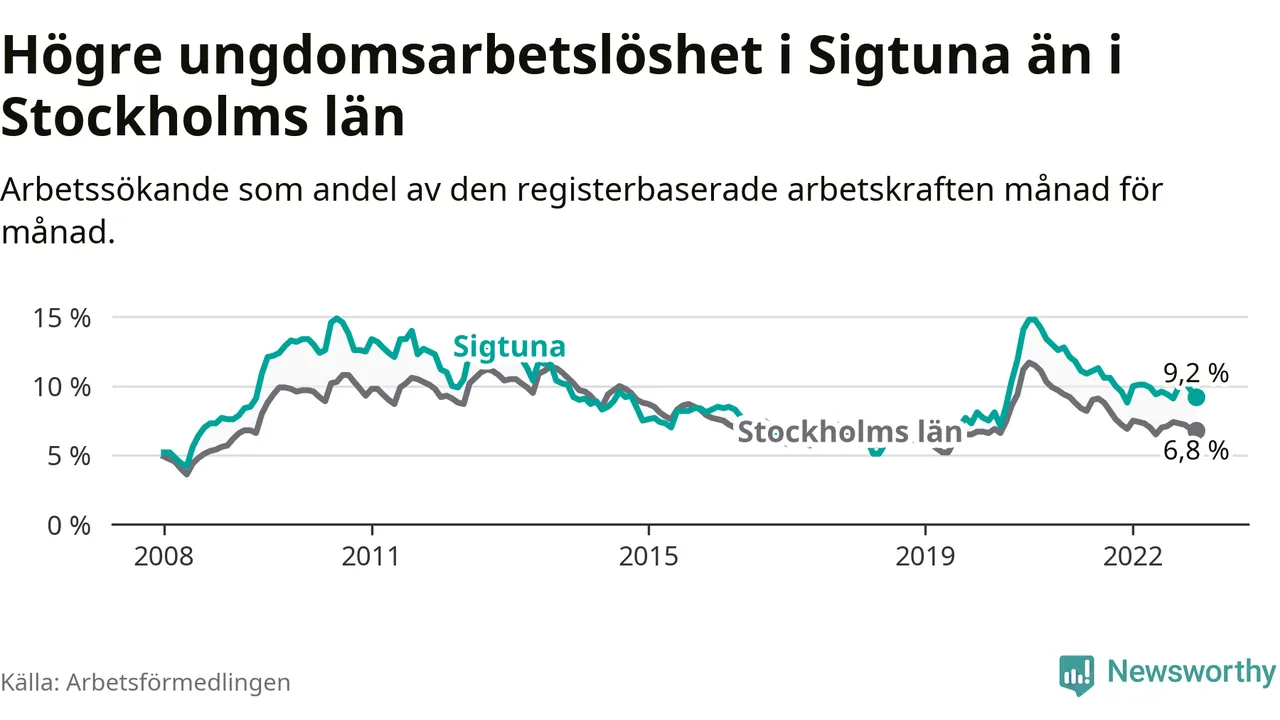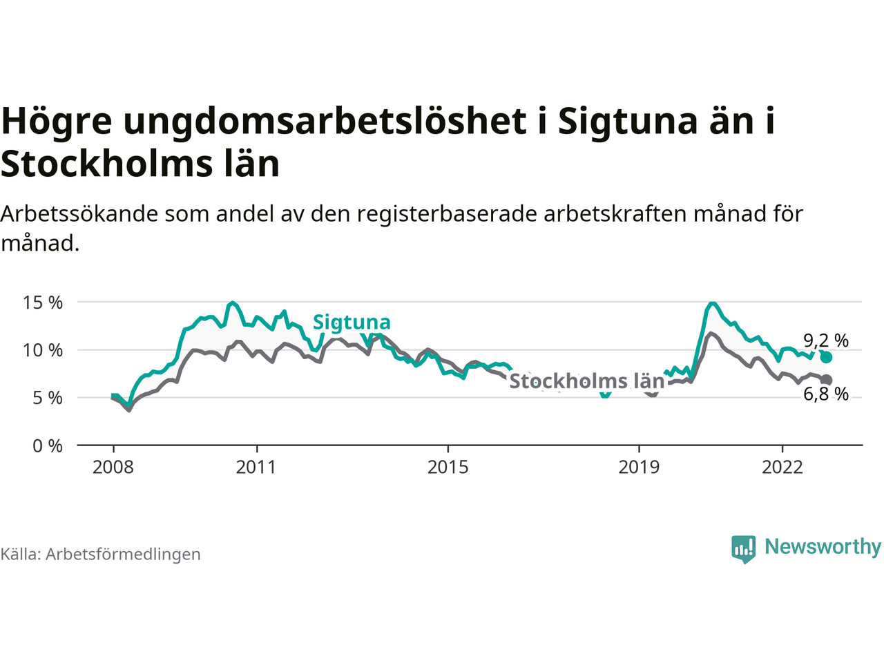 Precis som den totala arbetslösheten ligger ungdomsarbetslösheten i Sigtuna högre än i Stockholms län som helhet. Skillnaden mellan kommunen och länet är 2,4 procentenheter.