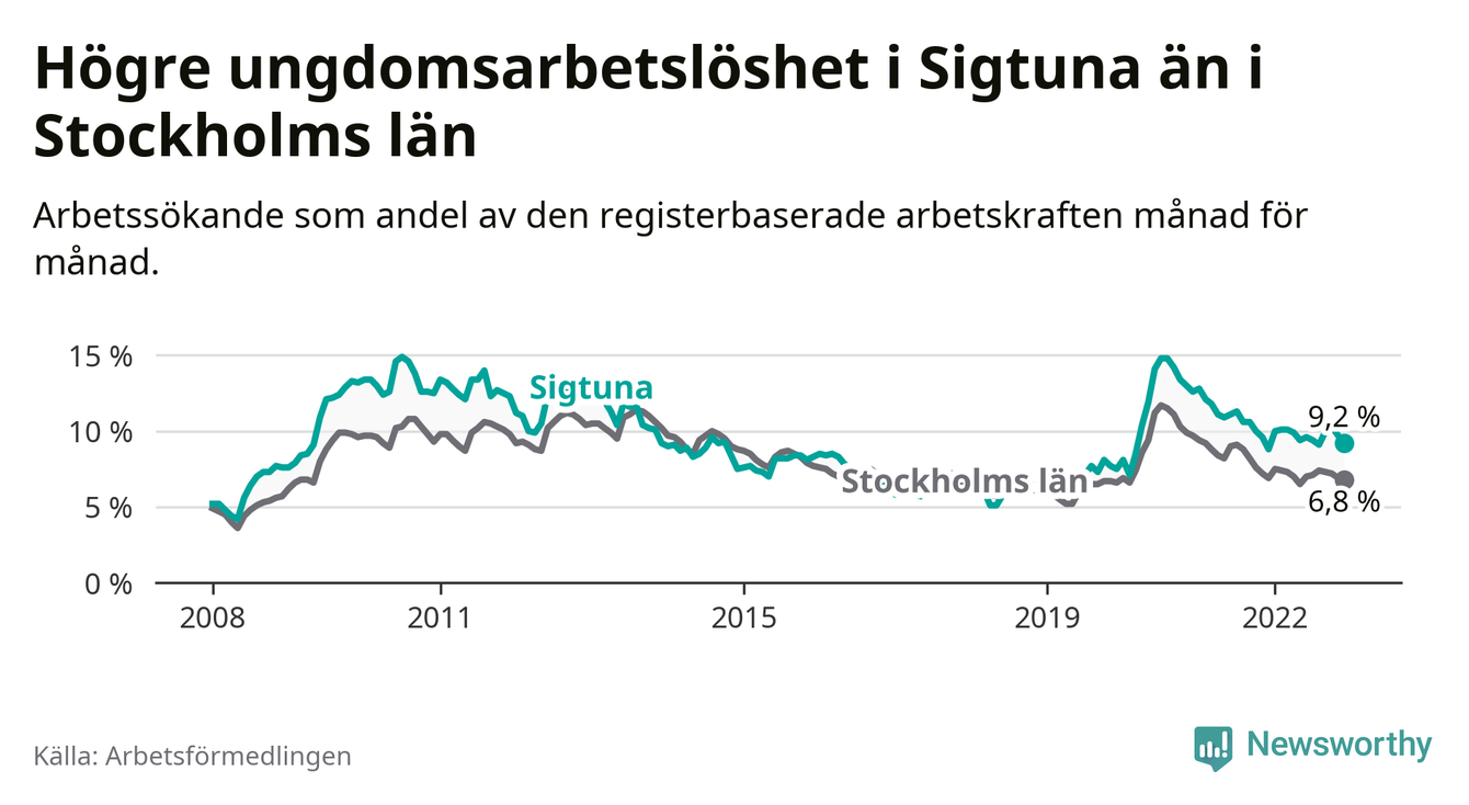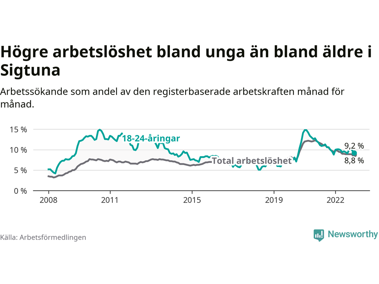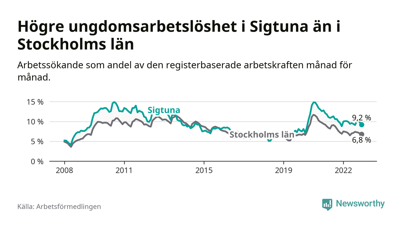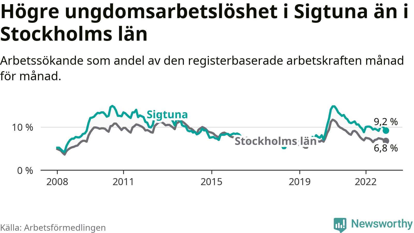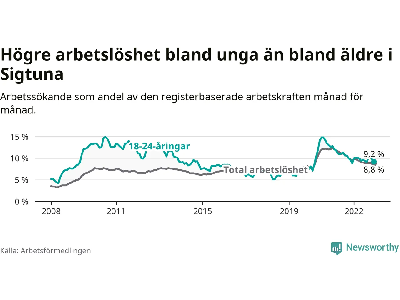 Precis som den totala arbetslösheten ligger ungdomsarbetslösheten i Sigtuna högre än i Stockholms län som helhet. Skillnaden mellan kommunen och länet är 2,4 procentenheter.