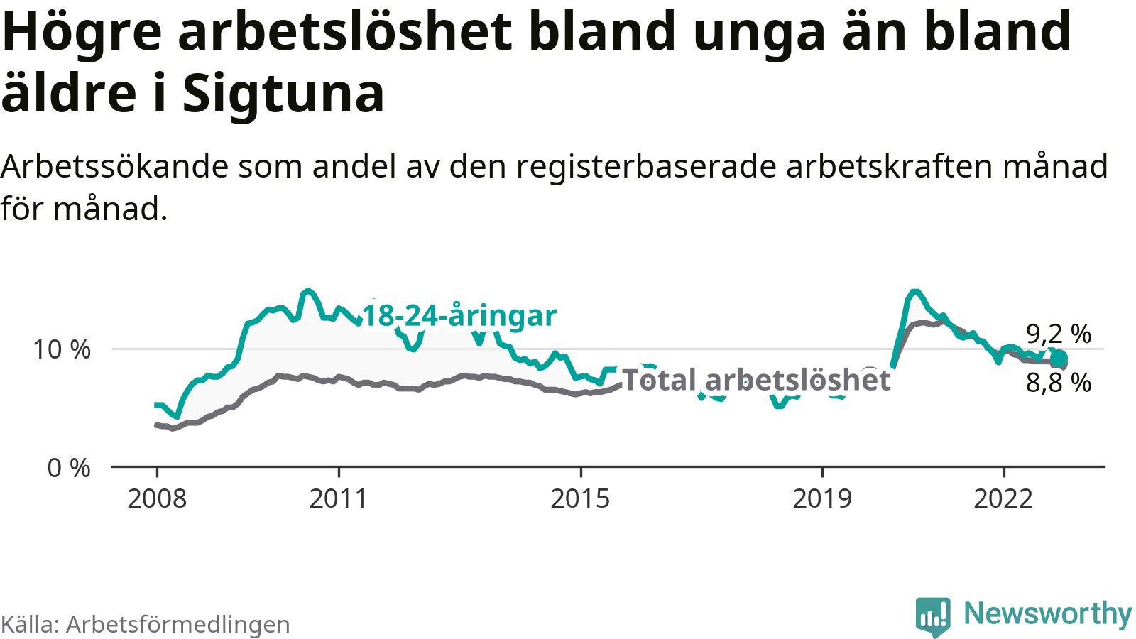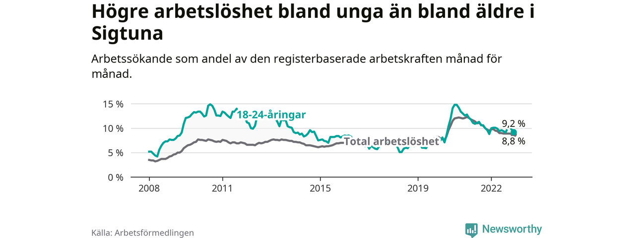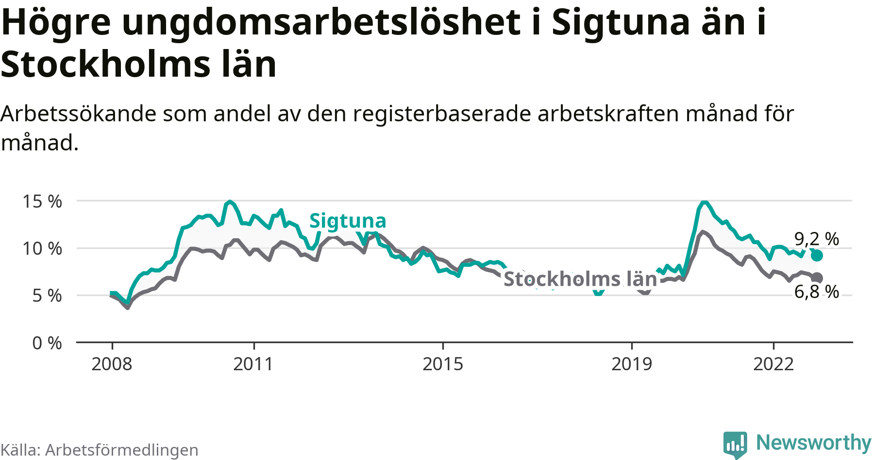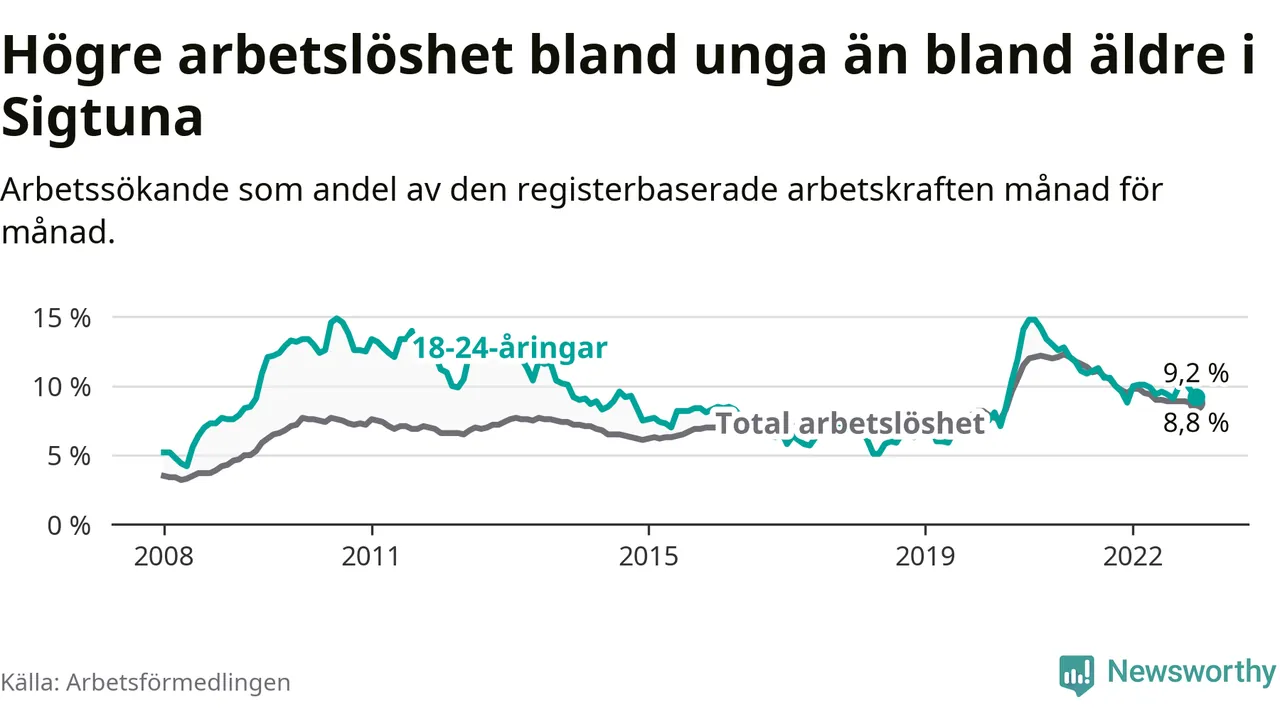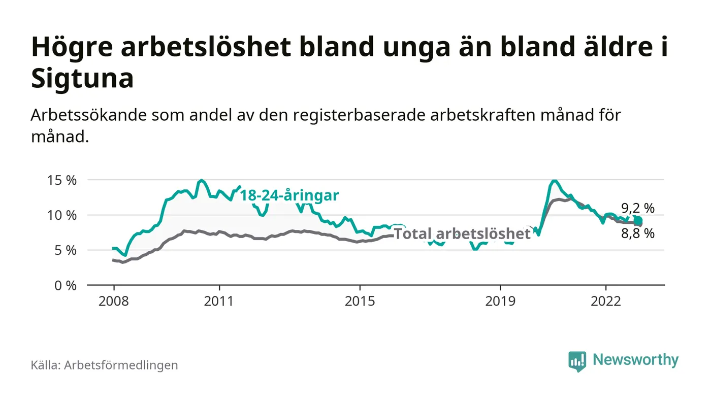 Precis som den totala arbetslösheten ligger ungdomsarbetslösheten i Sigtuna högre än i Stockholms län som helhet. Skillnaden mellan kommunen och länet är 2,4 procentenheter.