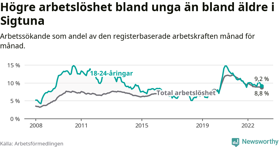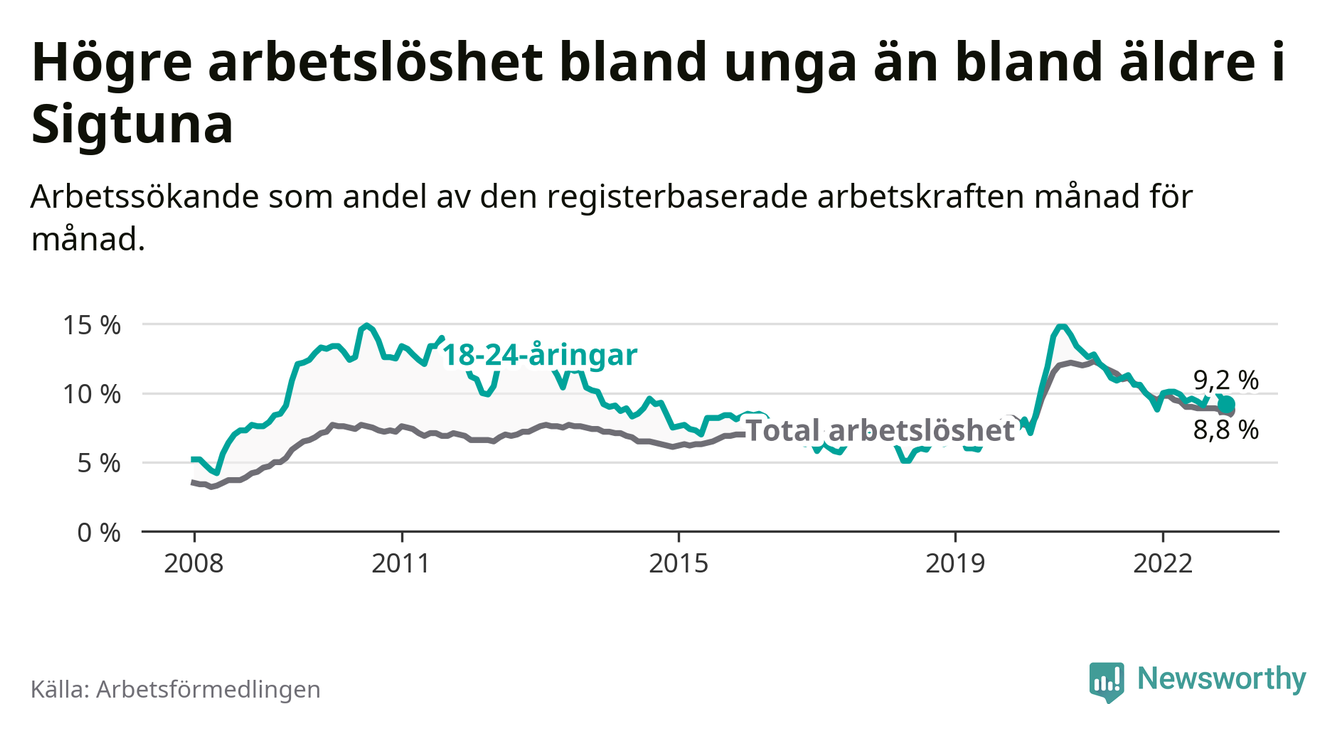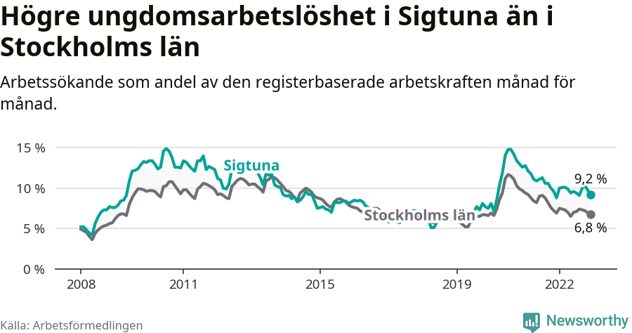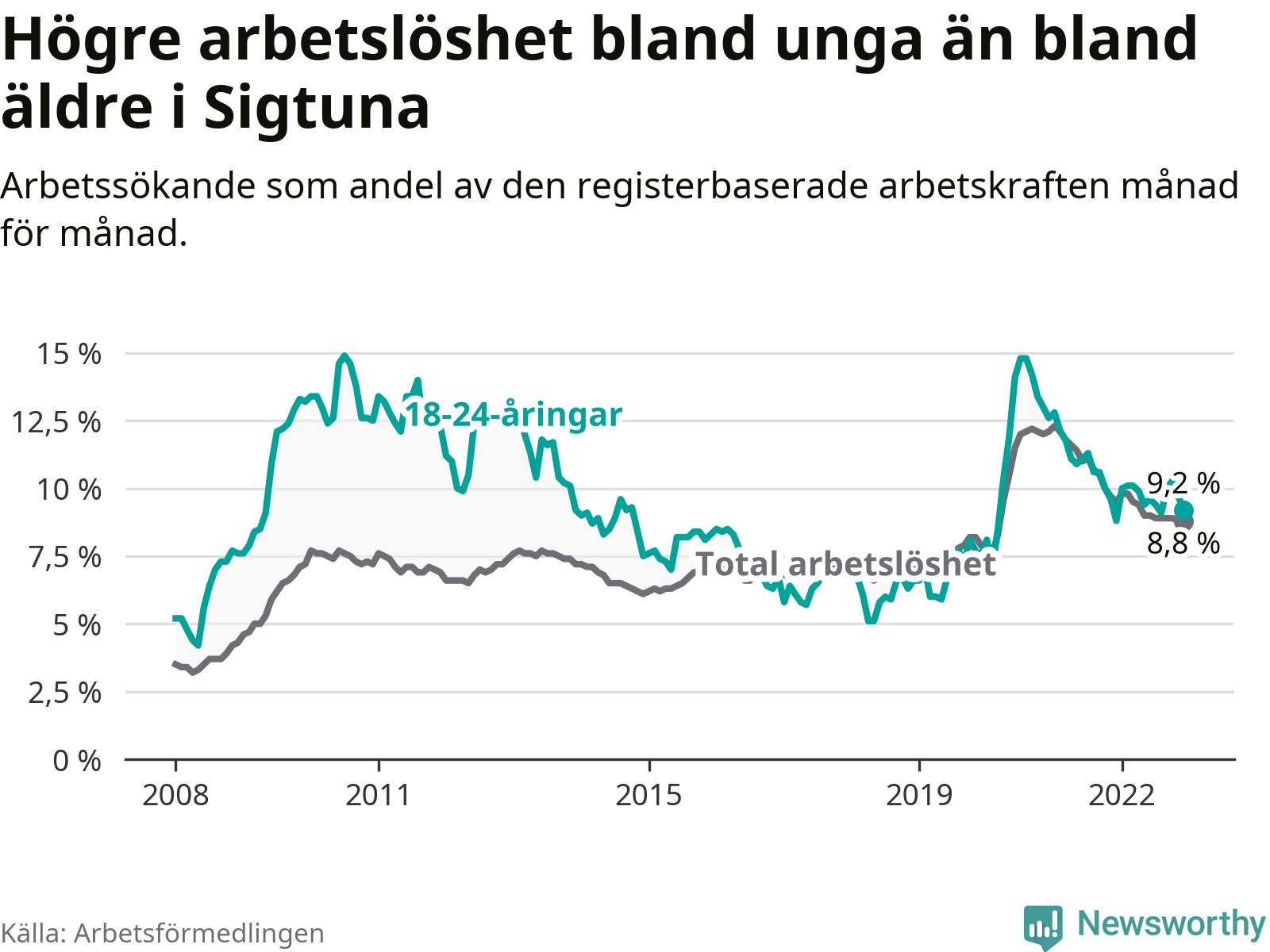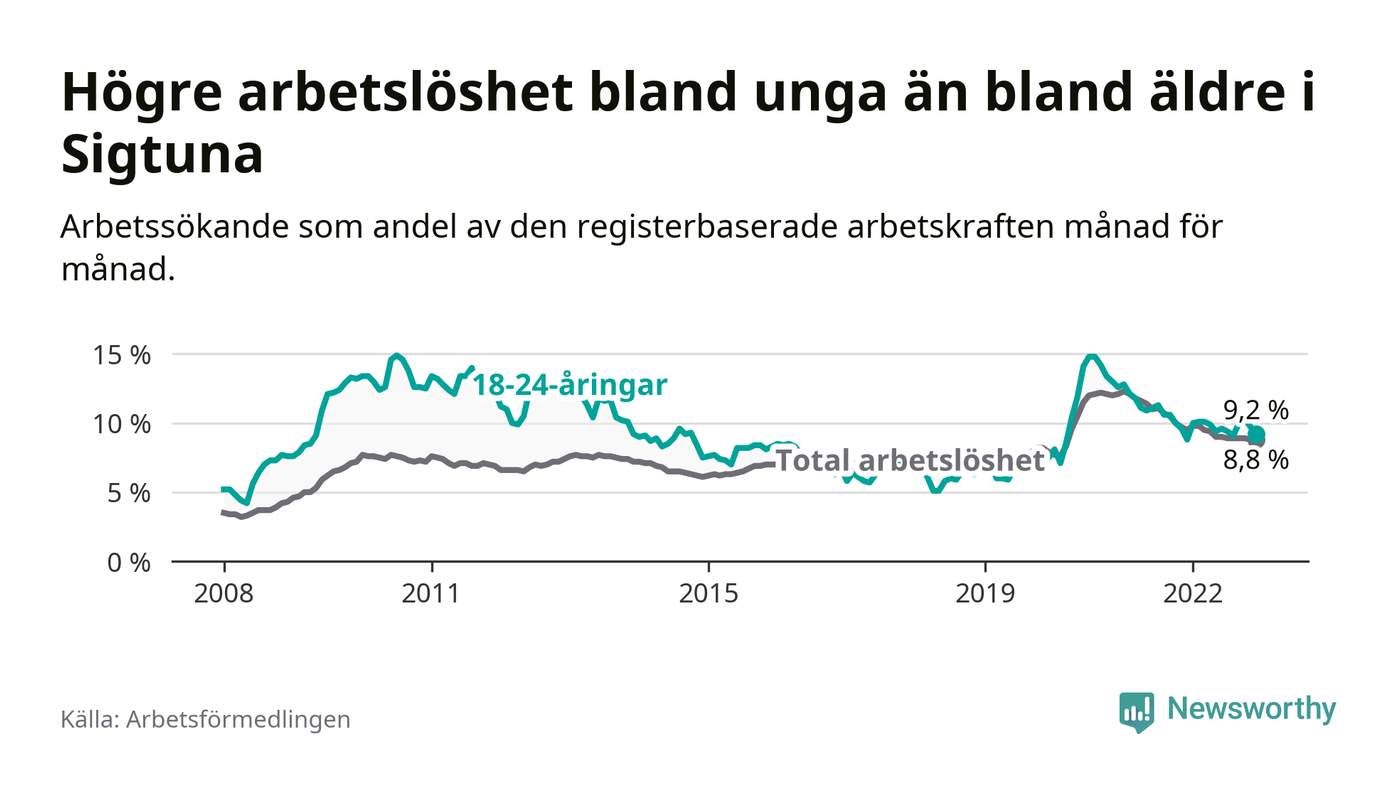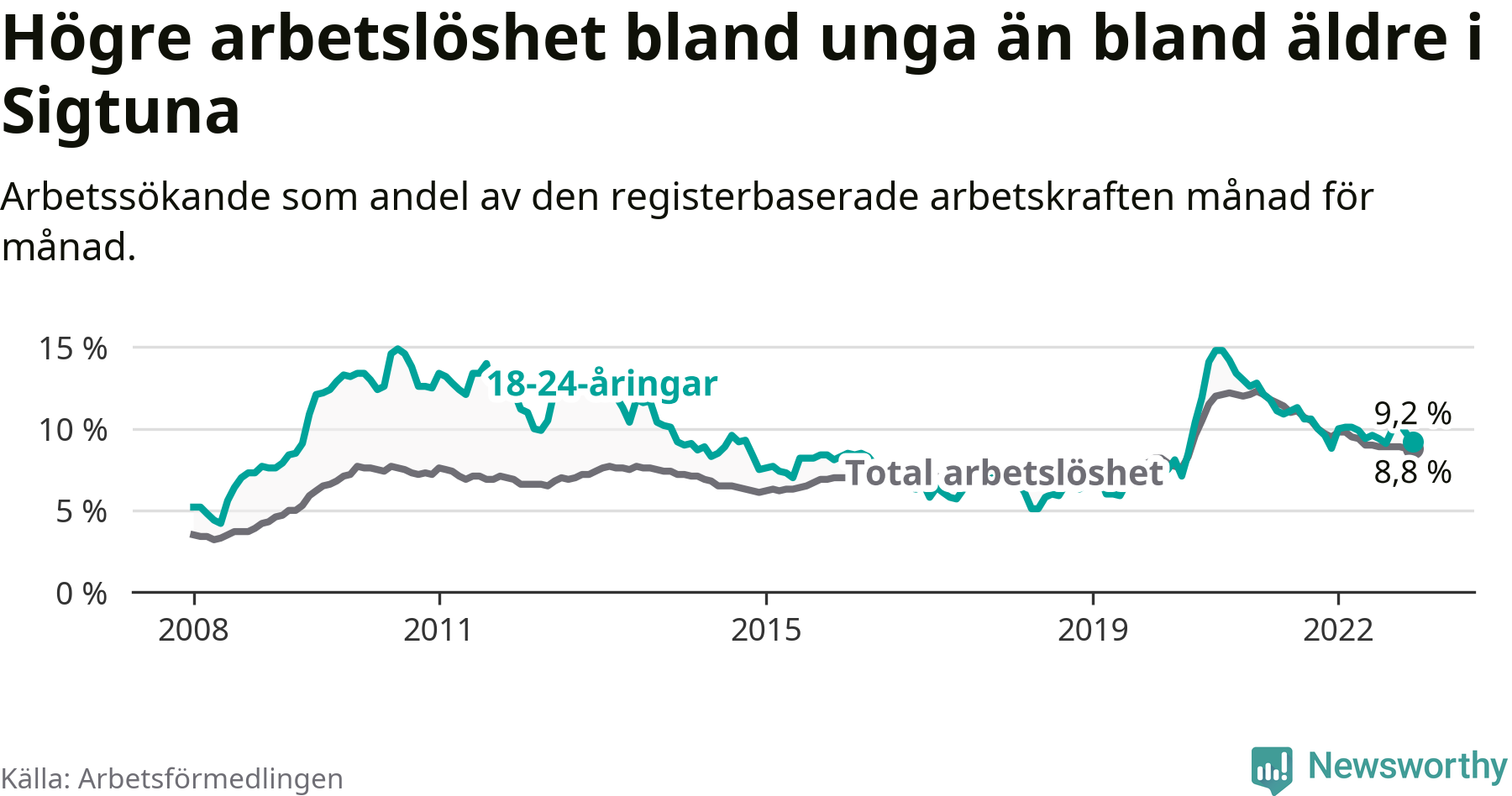 Precis som den totala arbetslösheten ligger ungdomsarbetslösheten i Sigtuna högre än i Stockholms län som helhet. Skillnaden mellan kommunen och länet är 2,4 procentenheter.