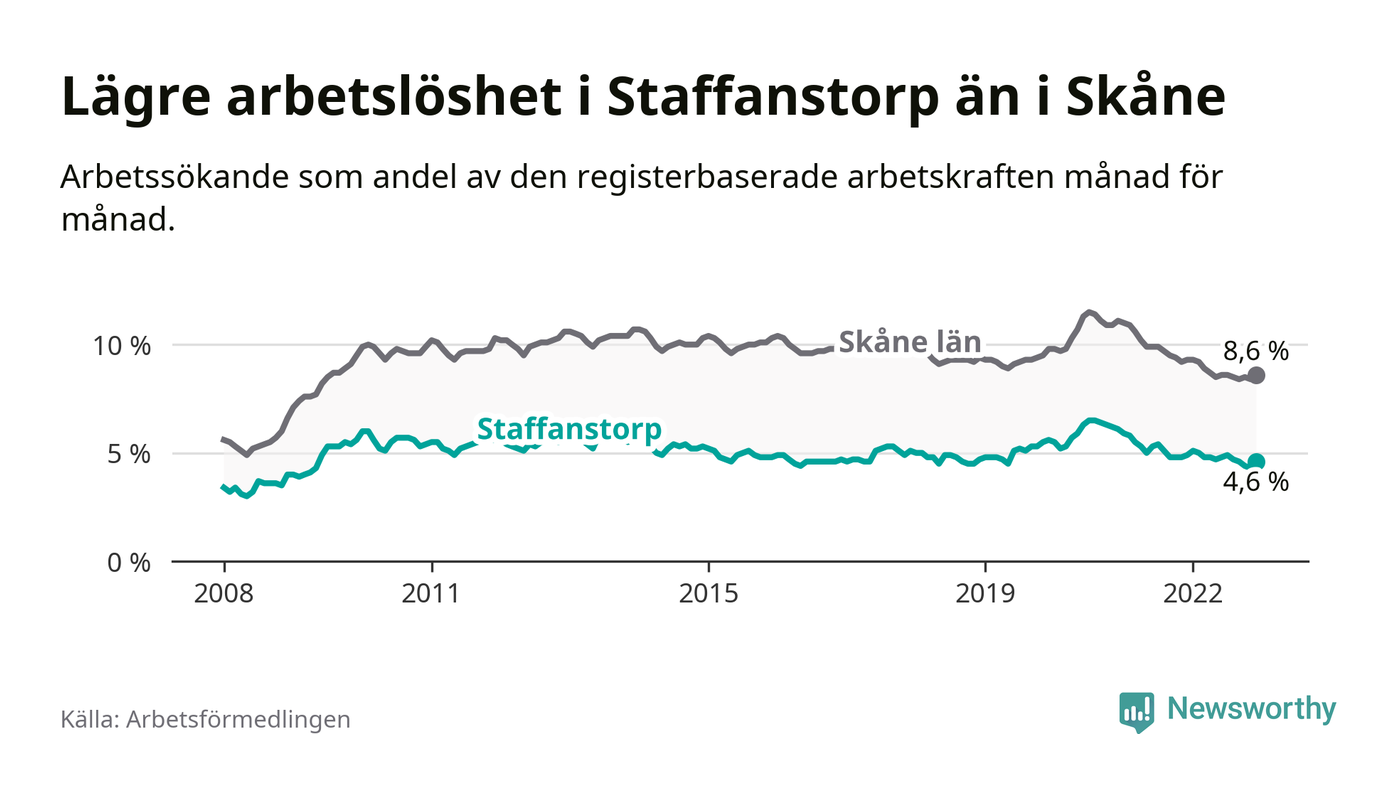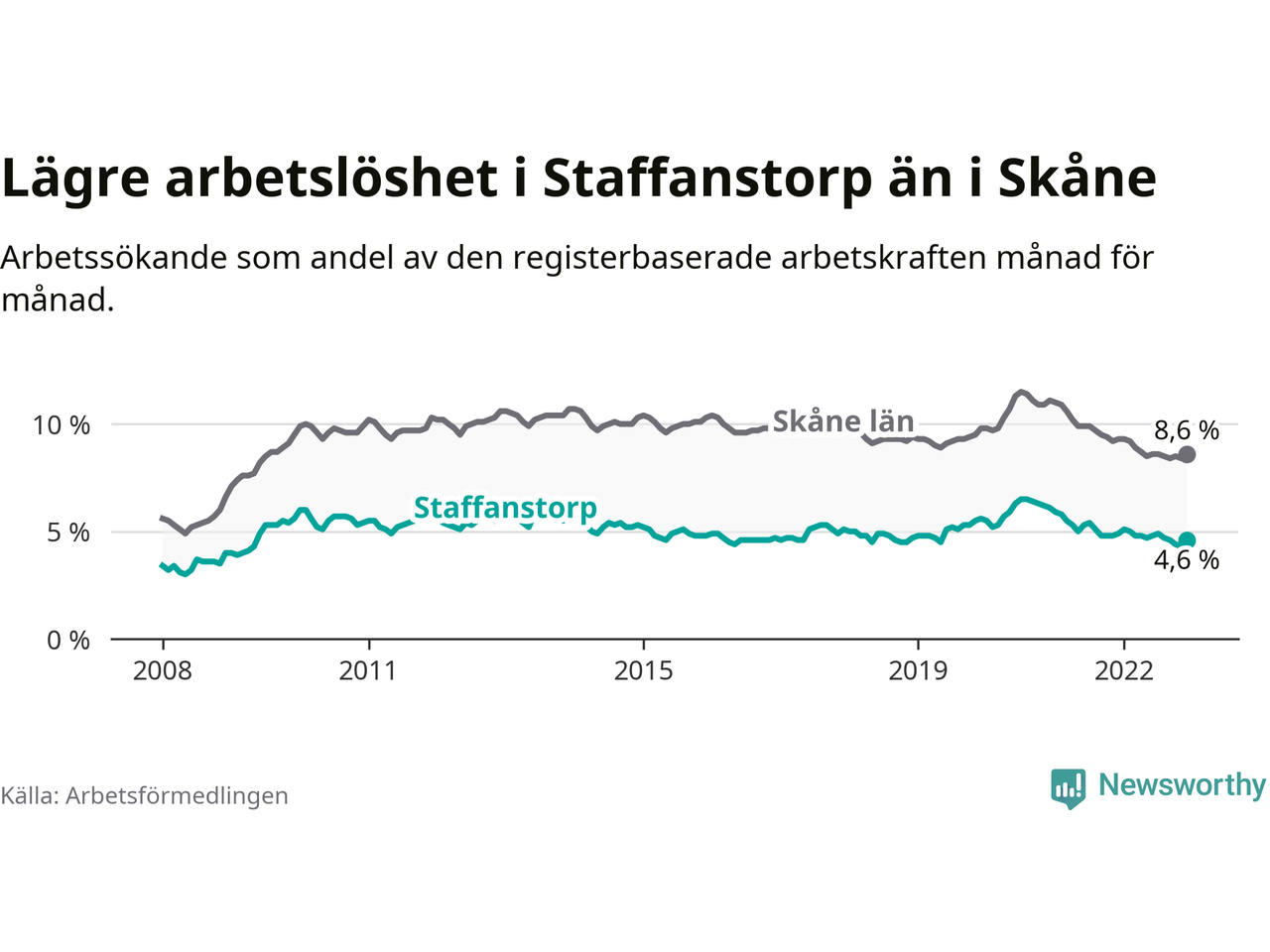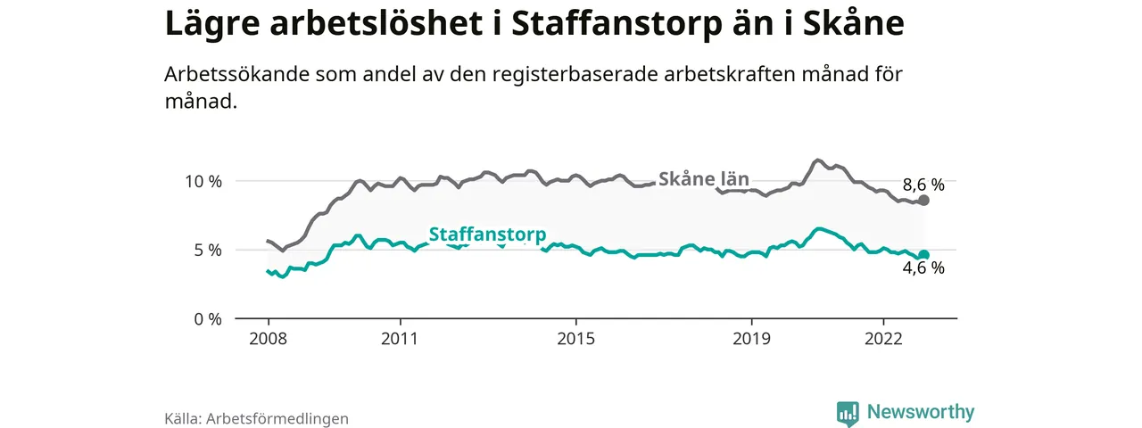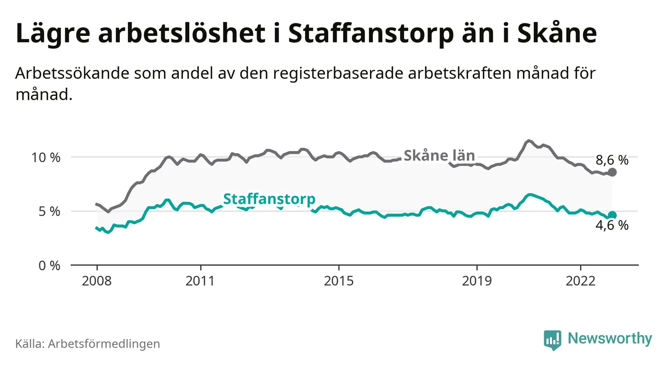 Graf: Arbetslöshet i Staffanstorps kommun och Skåne län