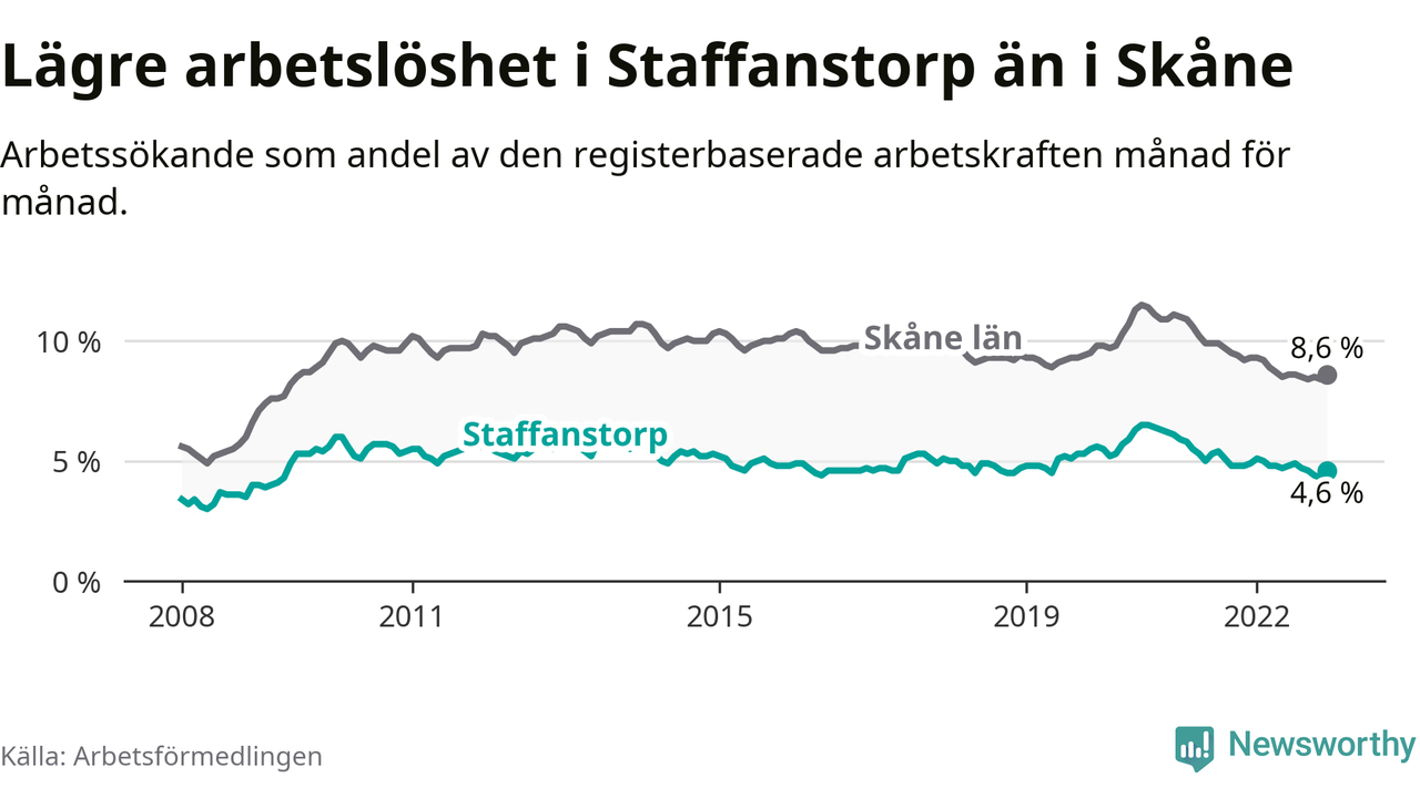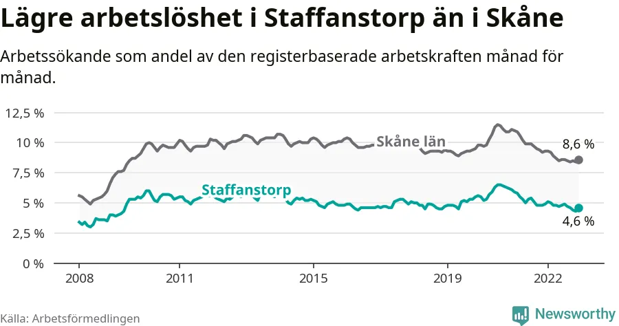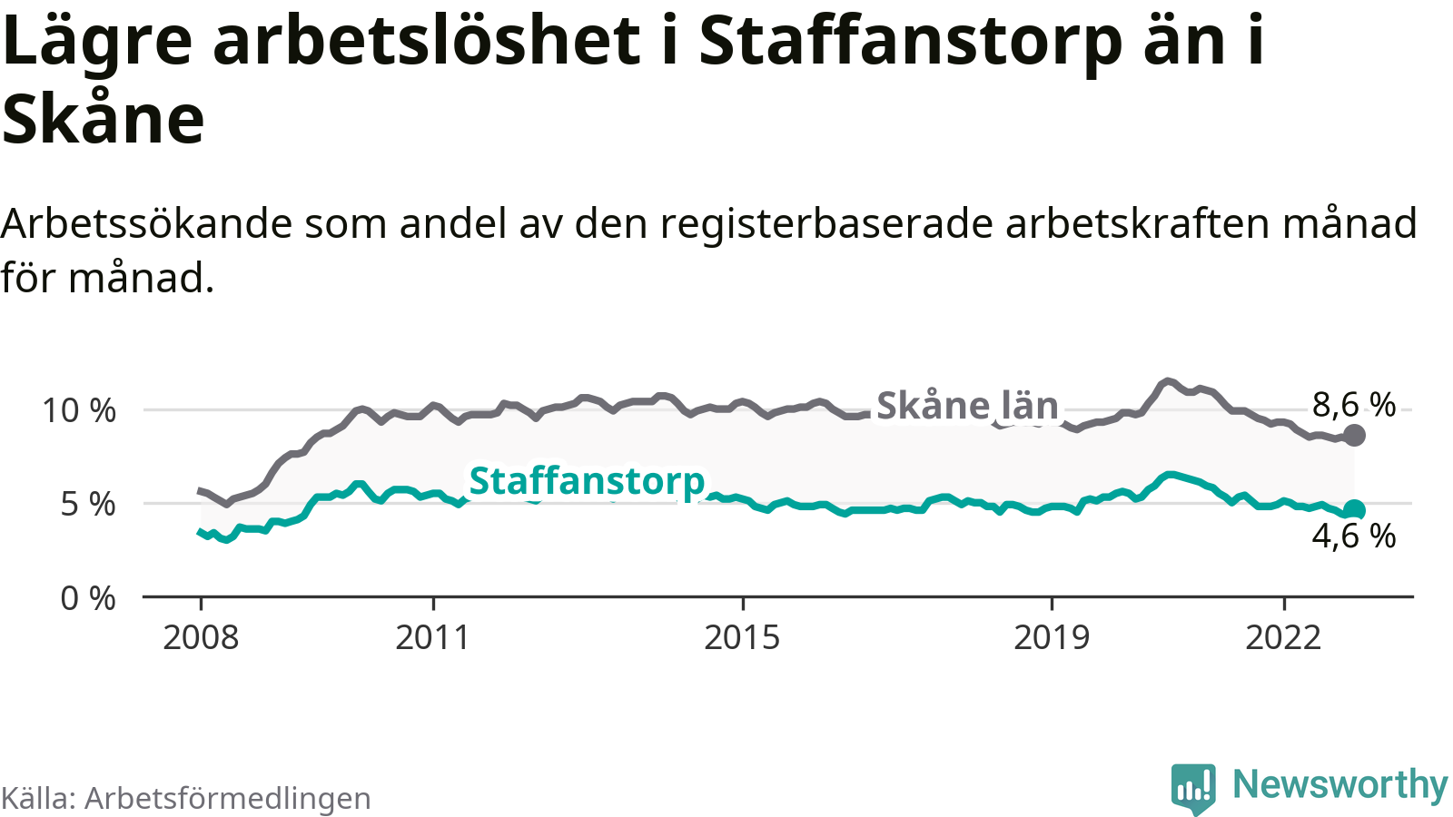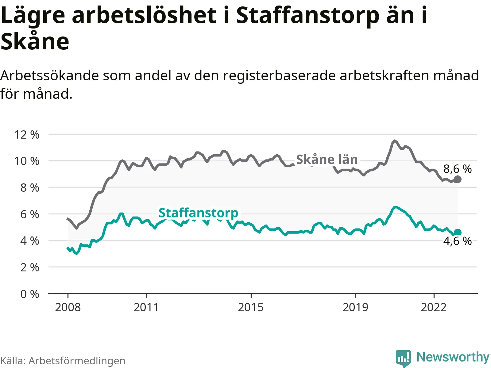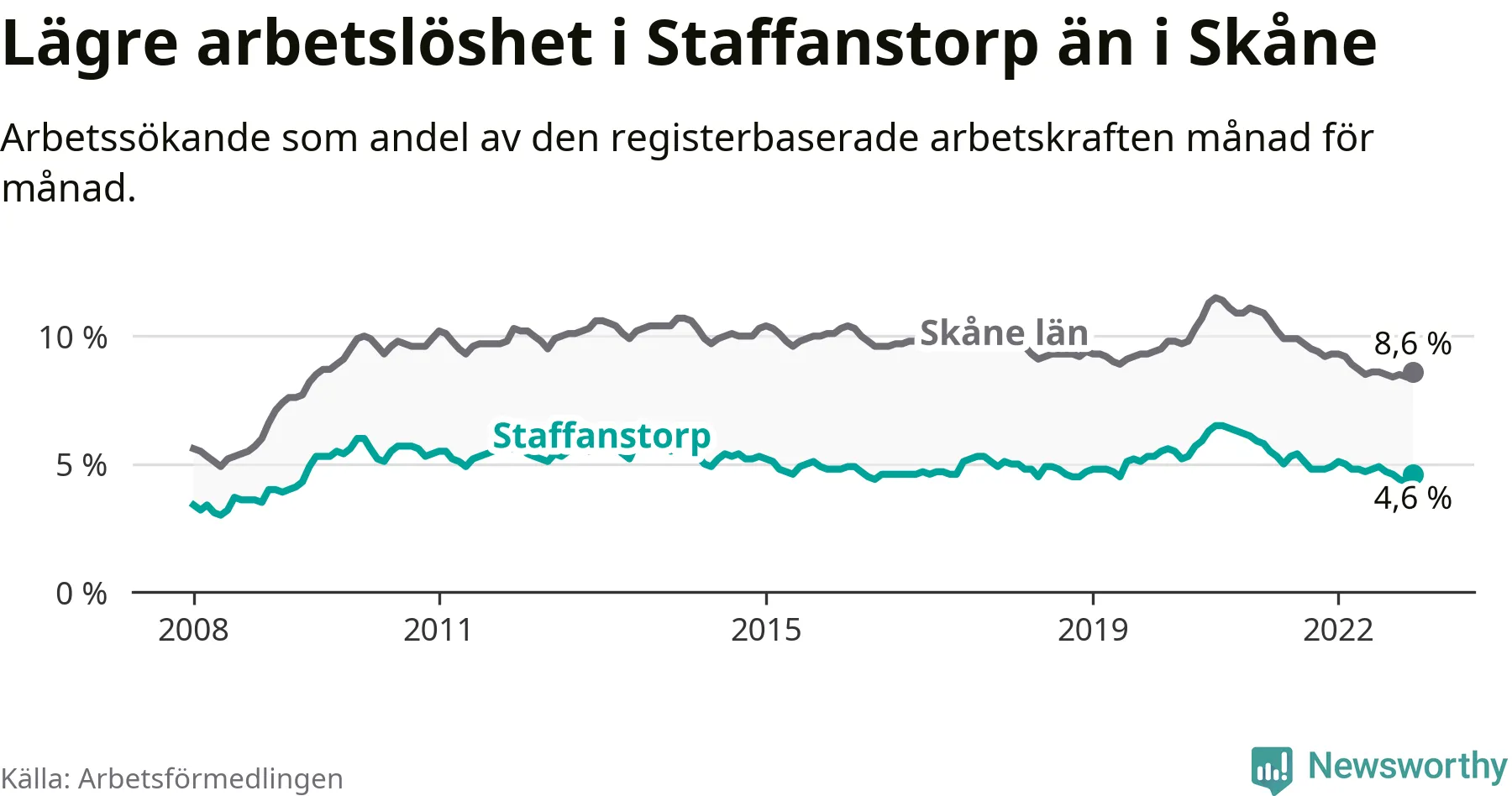 Graf: Arbetslöshet i Staffanstorps kommun och Skåne län