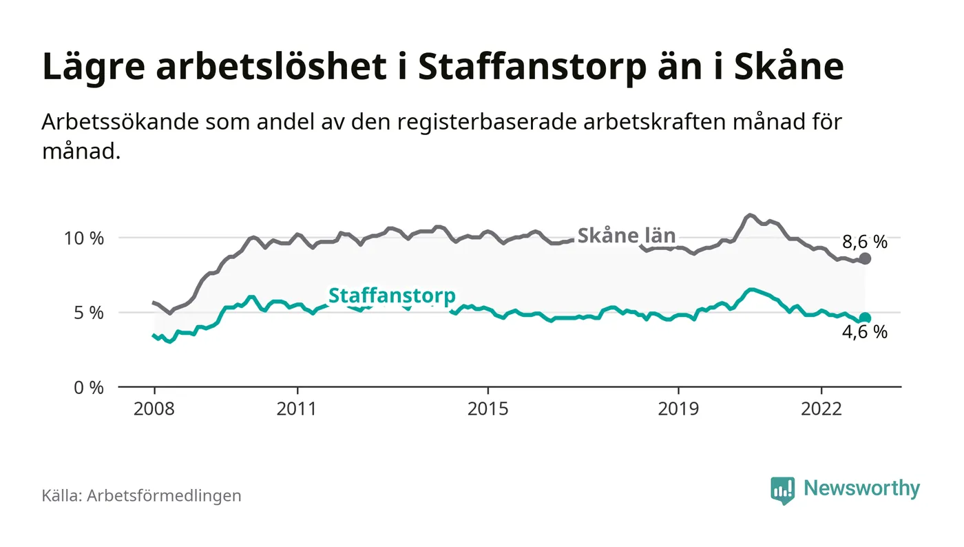 Staffanstorp hade redan tidigare lägre arbetslöshet än snittet i hela Skåne län och nu växer klyftan (4,6 procent i kommunen, jämfört med 8,6 procent i hela länet). Lomma har den lägsta arbetslösheten i länet (3,2 procent), medan Perstorp har den högsta (13,2 procent). För att Staffanstorp skulle komma ner i samma arbetslöshetsnivå som Lomma skulle 174 personer behöva sysselsättas.