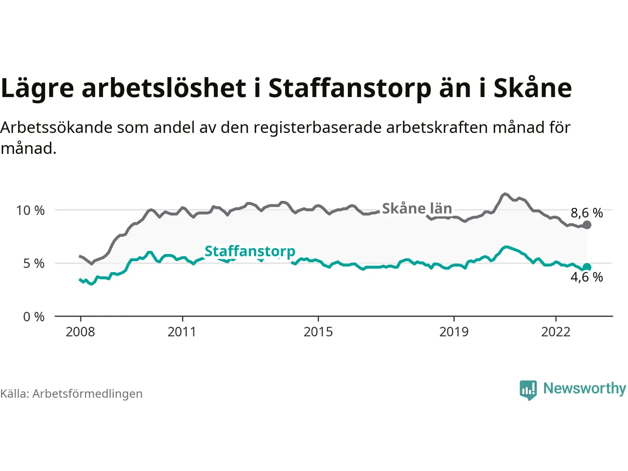 Under december månad rapporterade Staffanstorps kommun en total arbetslöshet på 4,6 procent. Det är en minskning jämfört med samma tidpunkt i fjol (−0,3 procentenheter). Även i Skåne län sjunker arbetslösheten .