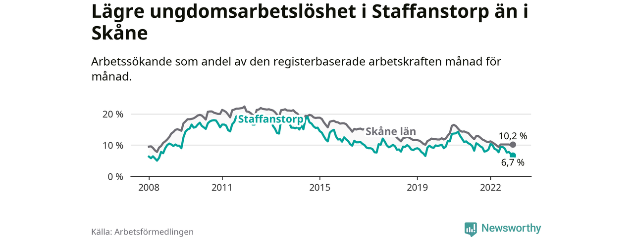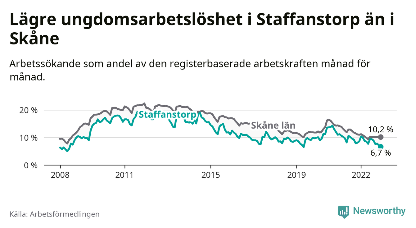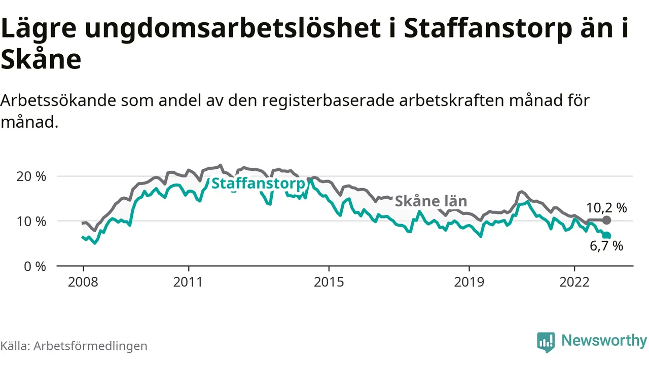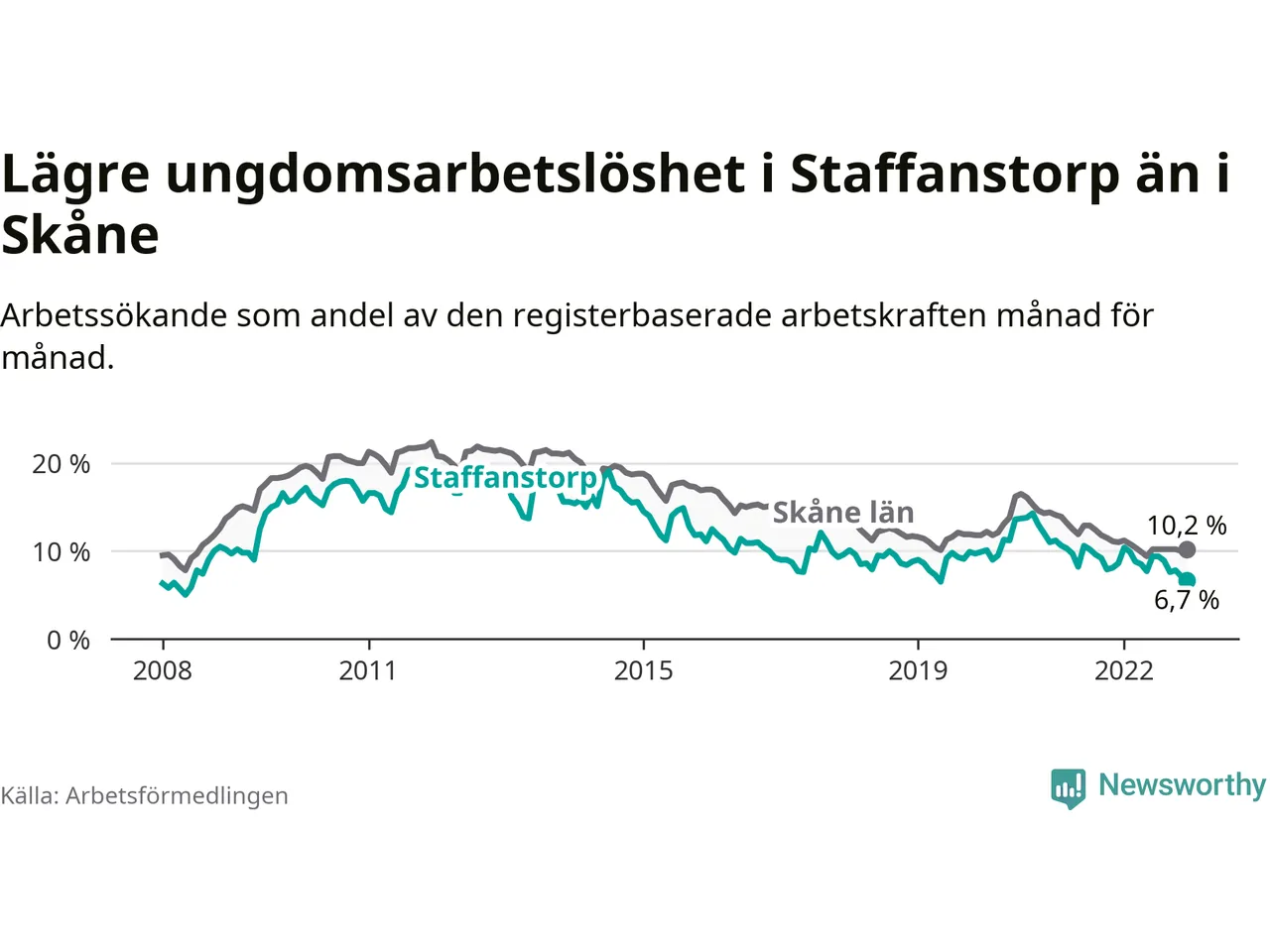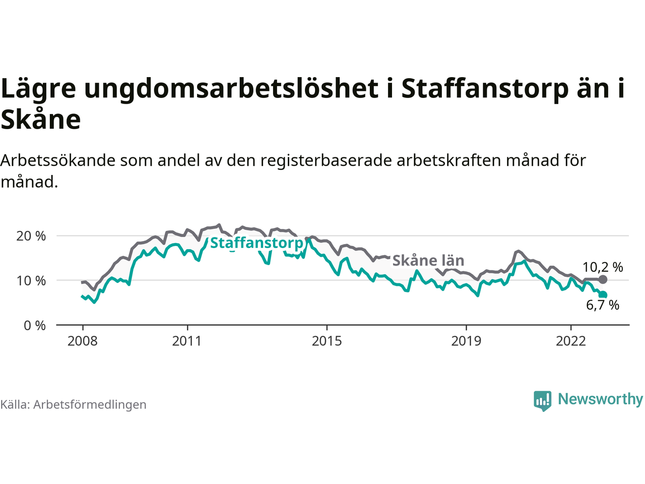 Precis som den totala arbetslösheten ligger ungdomsarbetslösheten i Staffanstorp lägre än i Skåne som helhet. Skillnaden mellan kommunen och länet är 3,5 procentenheter.