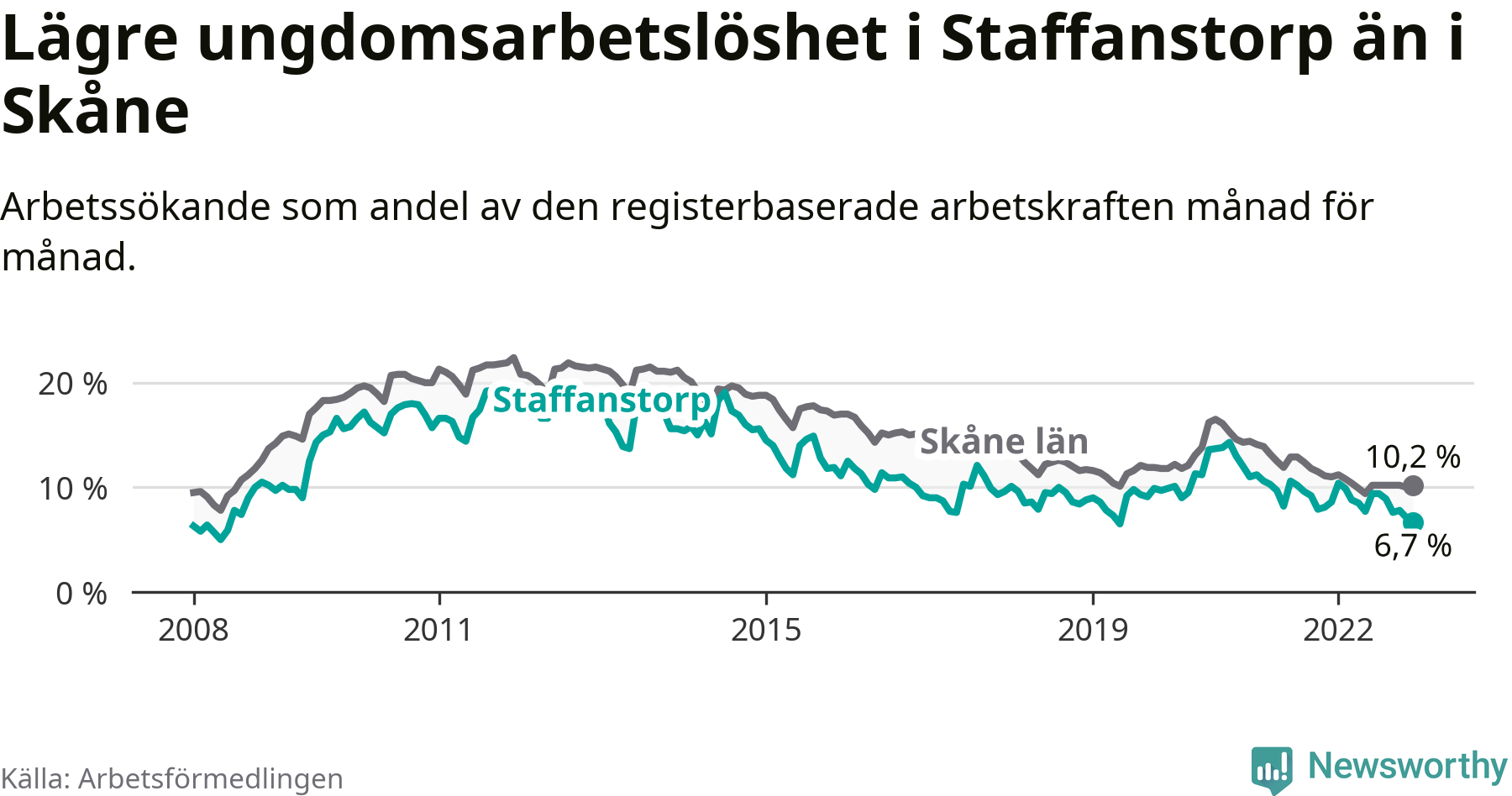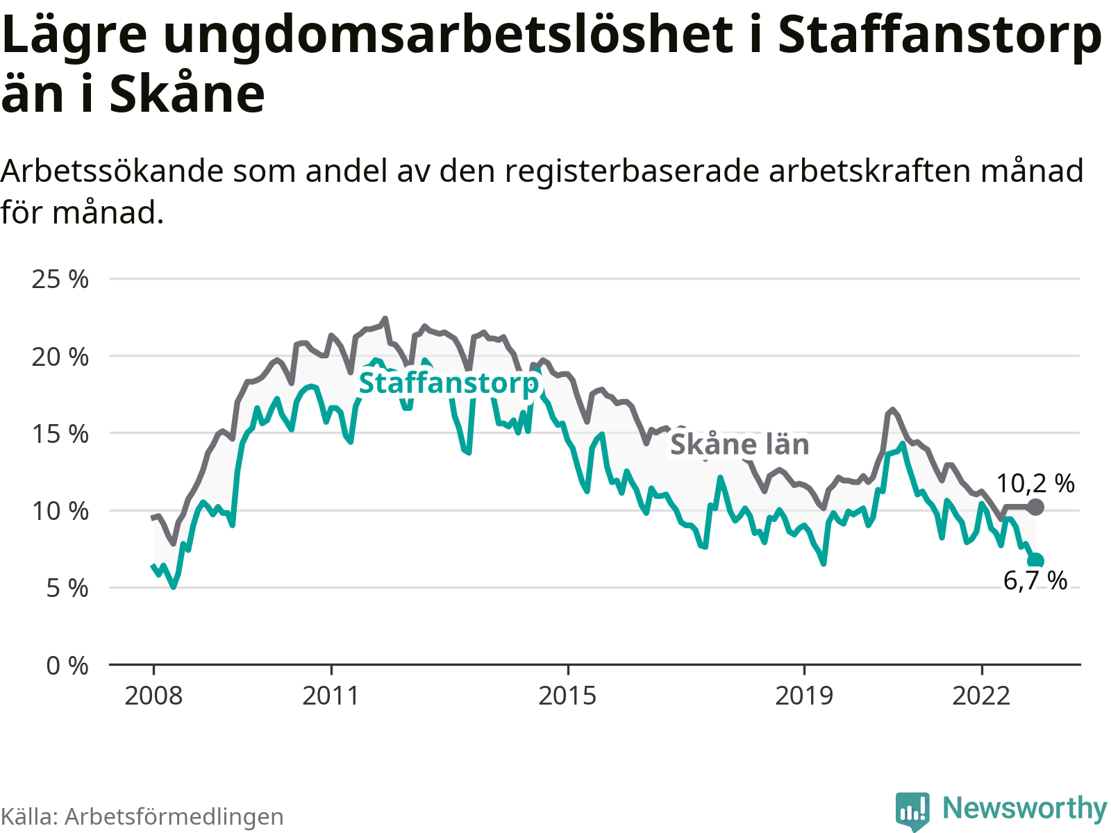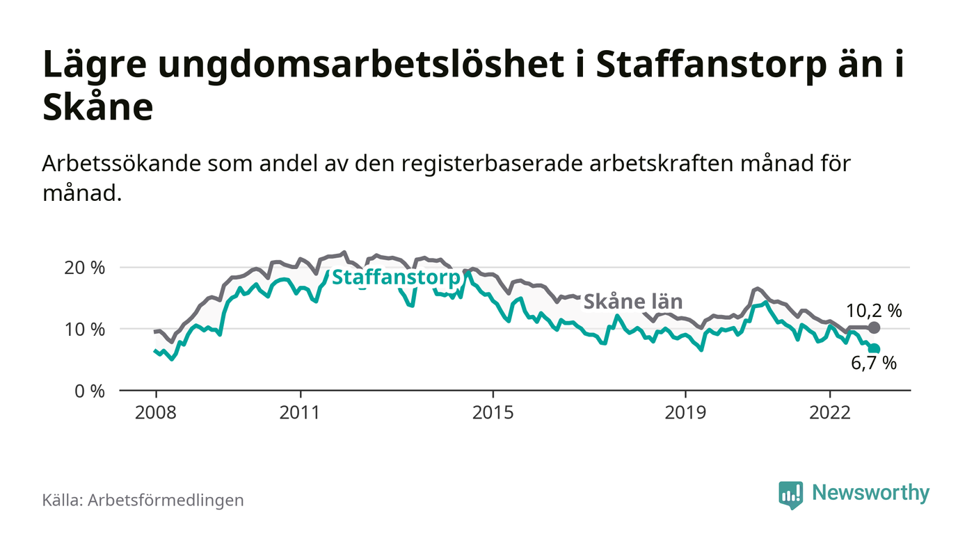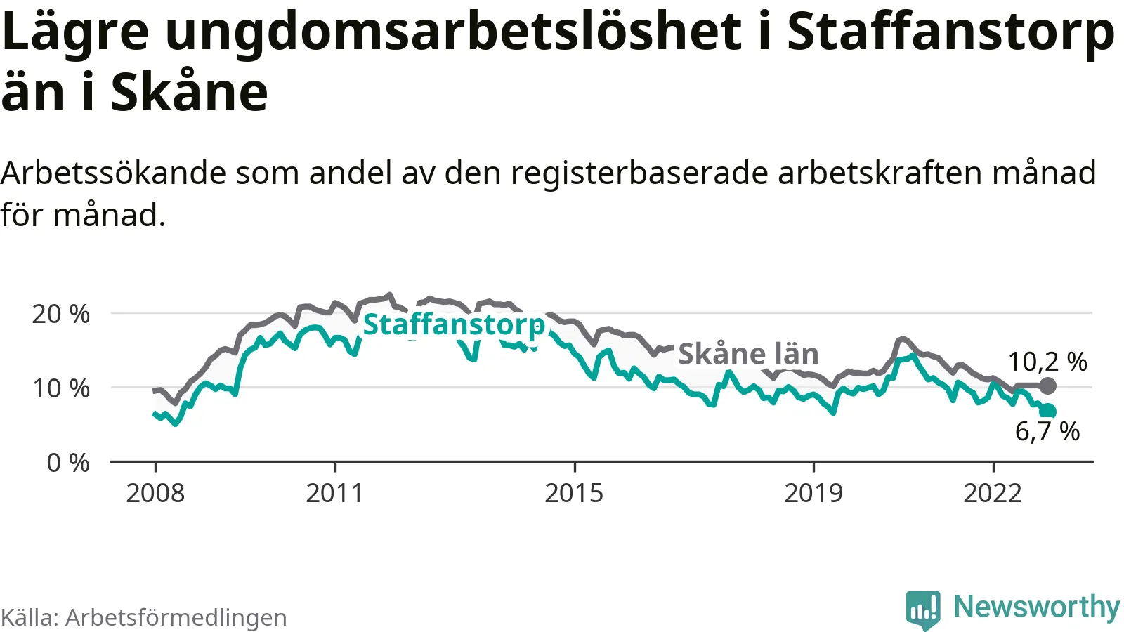 Precis som den totala arbetslösheten ligger ungdomsarbetslösheten i Staffanstorp lägre än i Skåne som helhet. Skillnaden mellan kommunen och länet är 3,5 procentenheter.