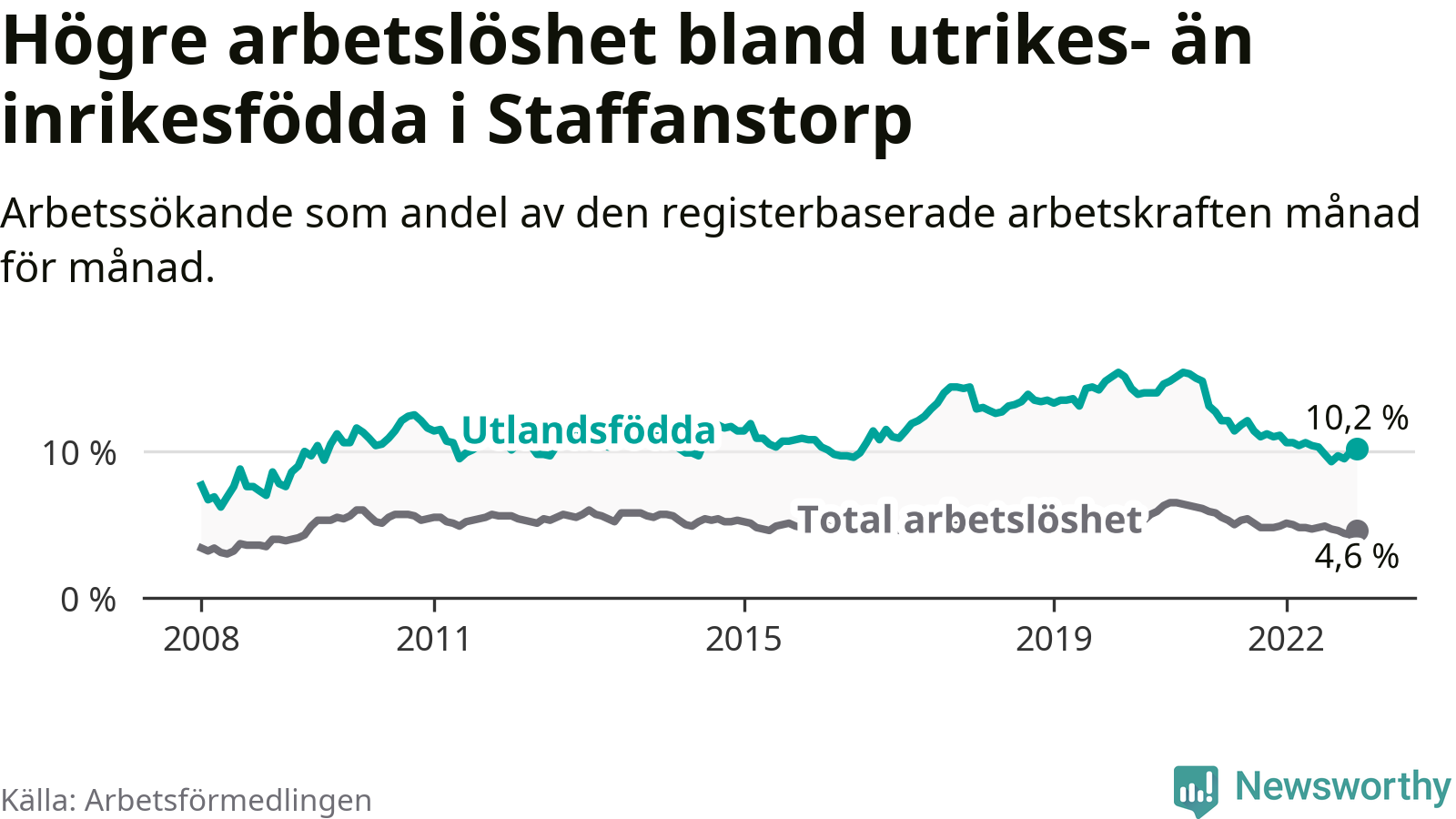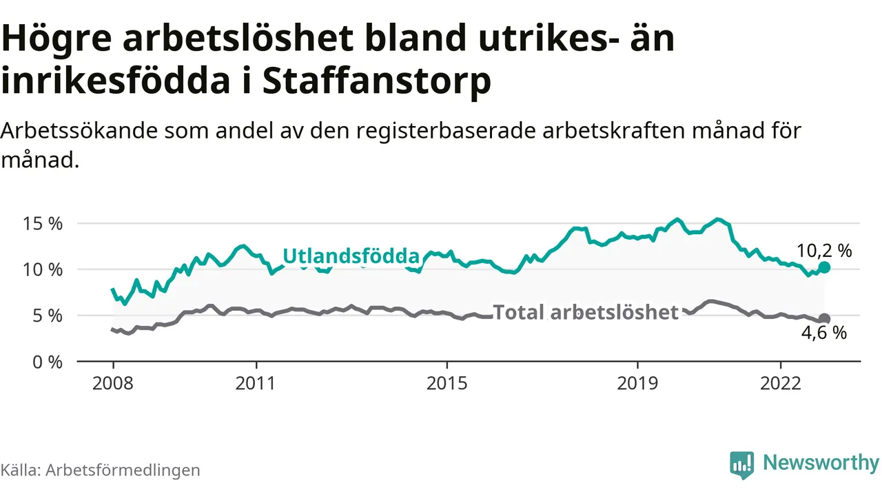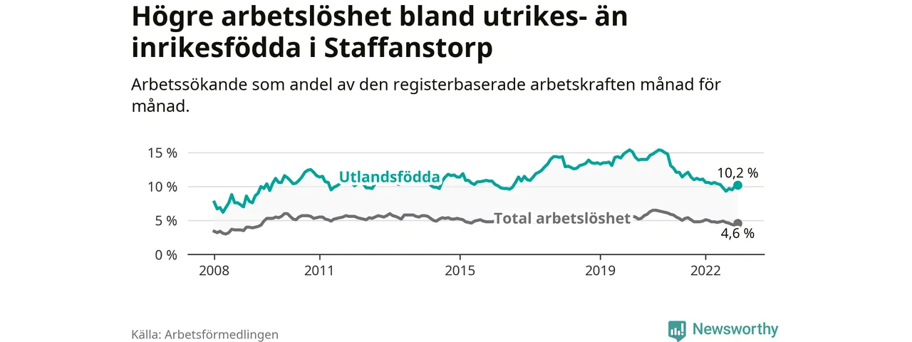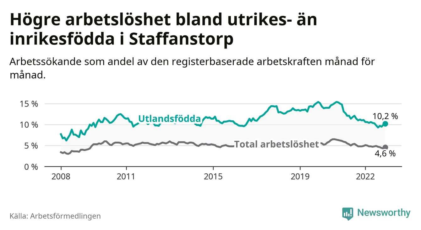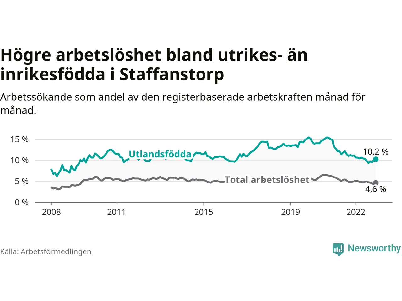 Skillnaden i arbetslöshet mellan utrikesfödda och hela befolkningen är 5,6 procentenheter i Staffanstorp. Det är en mindre skillnad än för ett år sedan (−0,6 procentenheter).