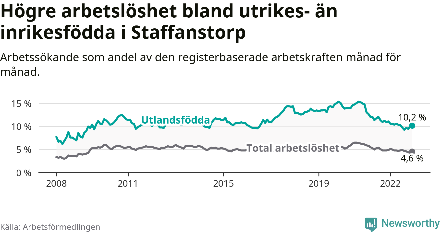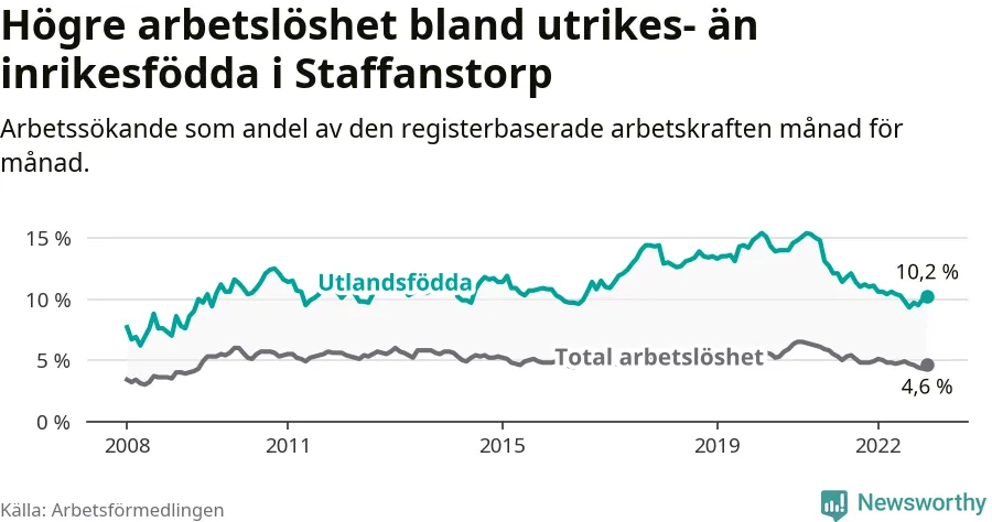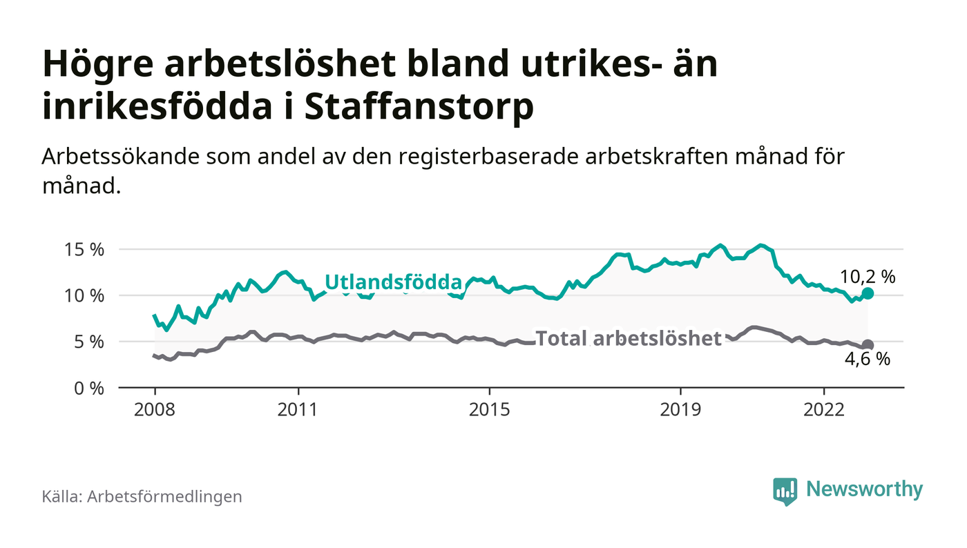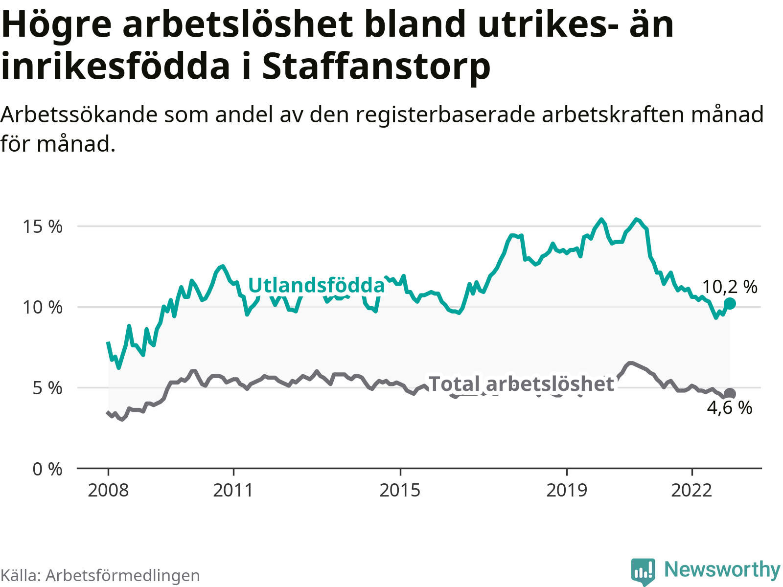 Skillnaden i arbetslöshet mellan utrikesfödda och hela befolkningen är 5,6 procentenheter i Staffanstorp. Det är en mindre skillnad än för ett år sedan (−0,6 procentenheter).