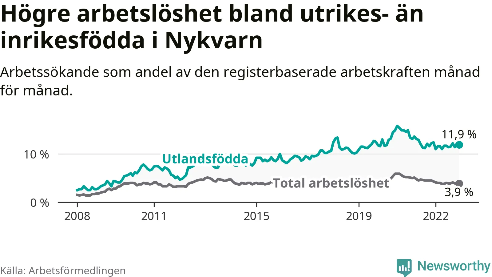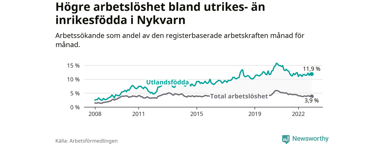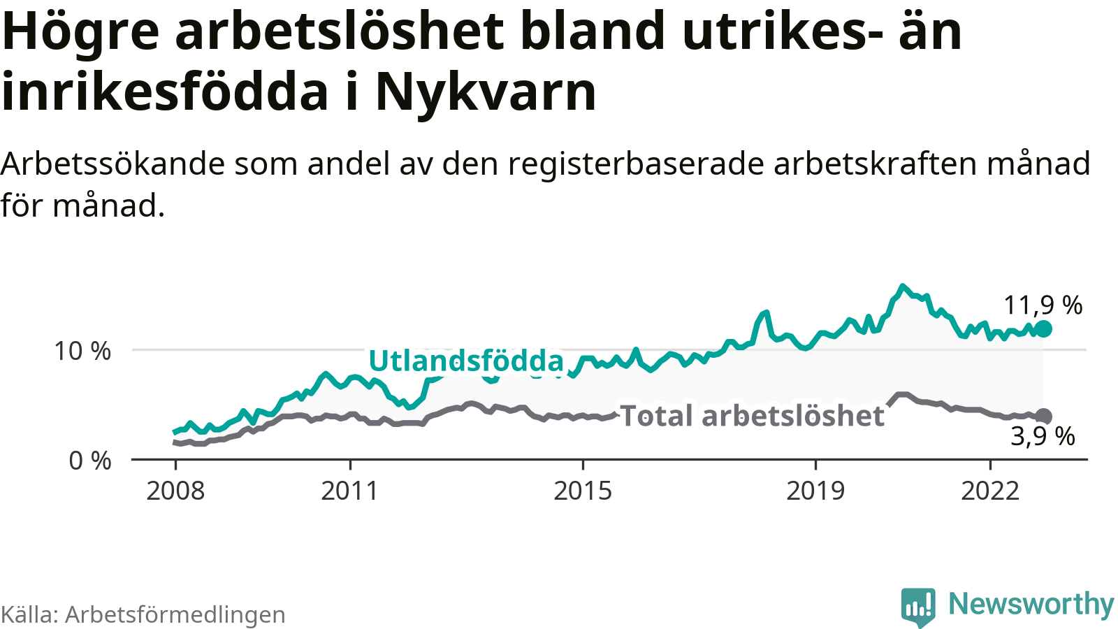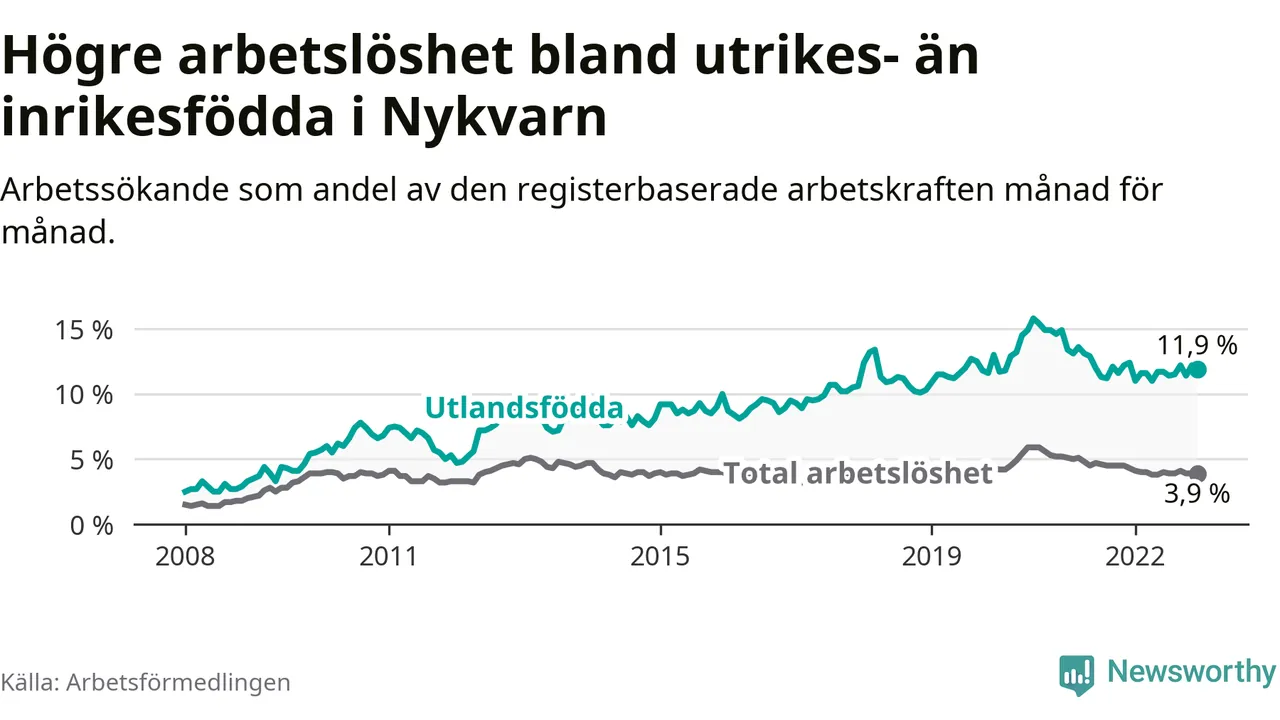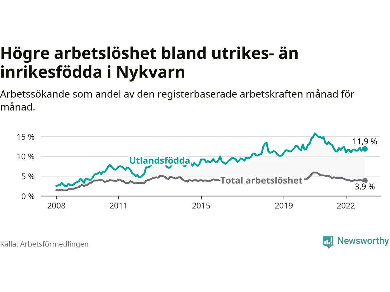 Arbetslösheten bland utlandsfödda var 11,9 procent i Nykvarn under december månad, motsvarande 105 av 882 personer. Det är 0,5 procentenheter färre än vid samma tidpunkt i fjol (+3 om man räknar personer). Den senaste månadens nedgång innebär ett trendbrott. Under de ett föregående månaderna hade arbetslösheten bland utlandsfödda varit högre än motsvarande tidpunkt året innan.