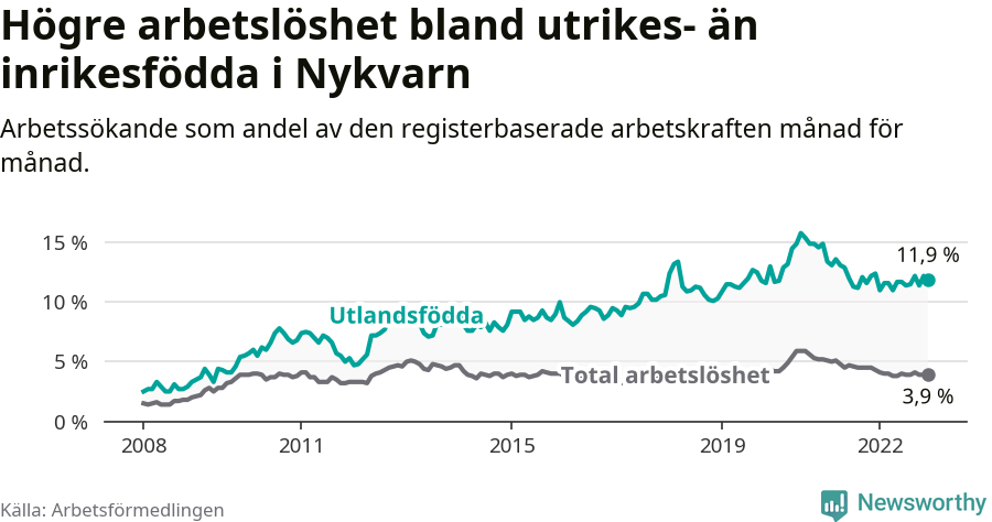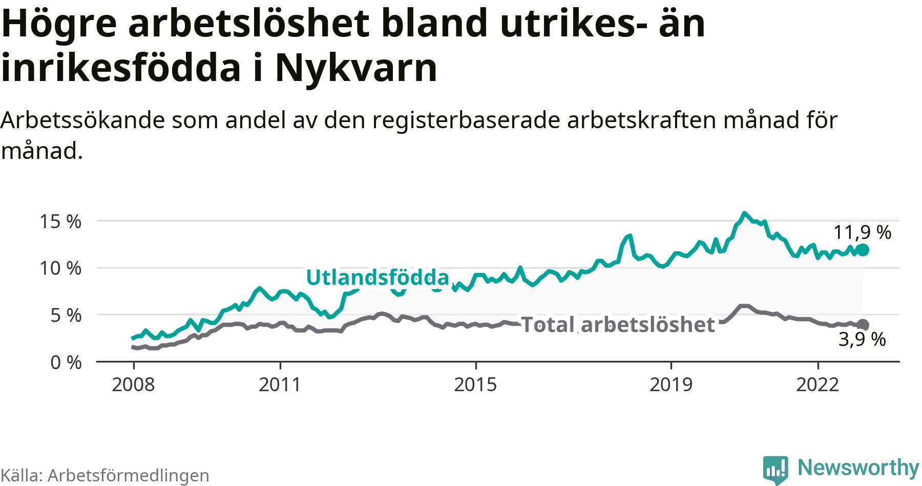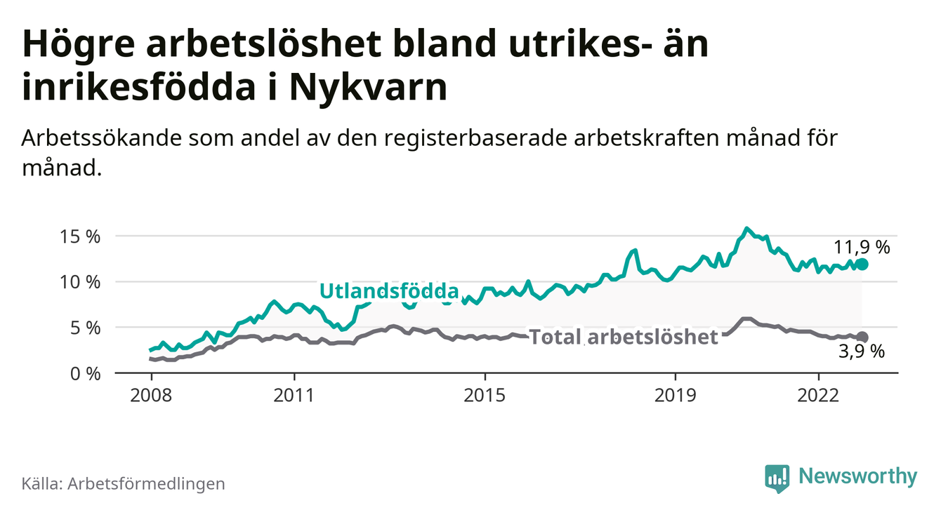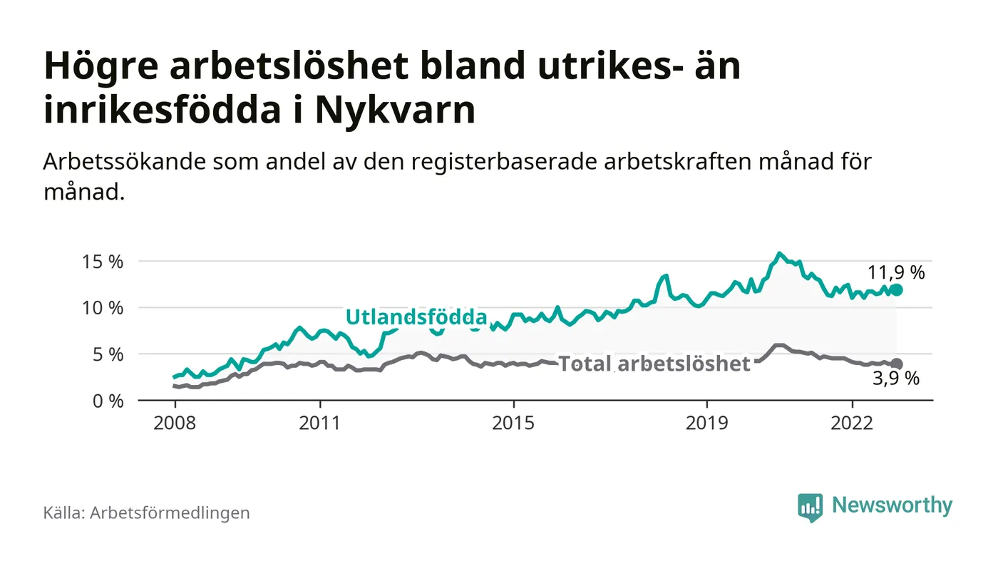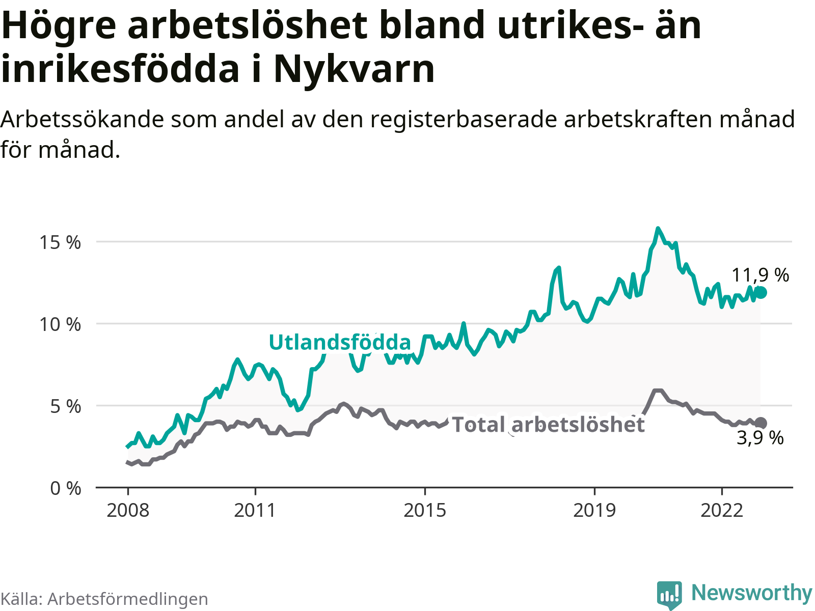 Arbetslösheten bland utlandsfödda var 11,9 procent i Nykvarn under december månad, motsvarande 105 av 882 personer. Det är 0,5 procentenheter färre än vid samma tidpunkt i fjol (+3 om man räknar personer). Den senaste månadens nedgång innebär ett trendbrott. Under de ett föregående månaderna hade arbetslösheten bland utlandsfödda varit högre än motsvarande tidpunkt året innan.