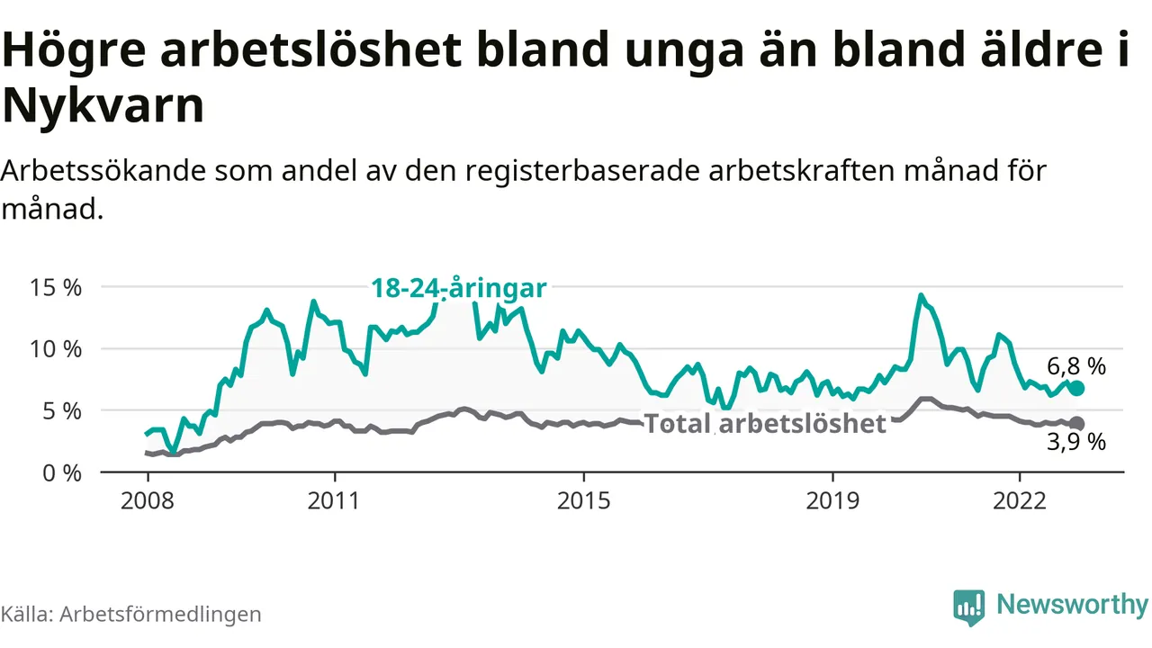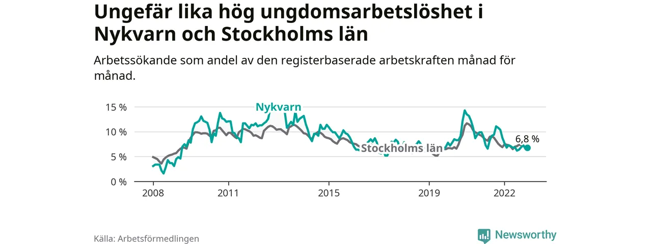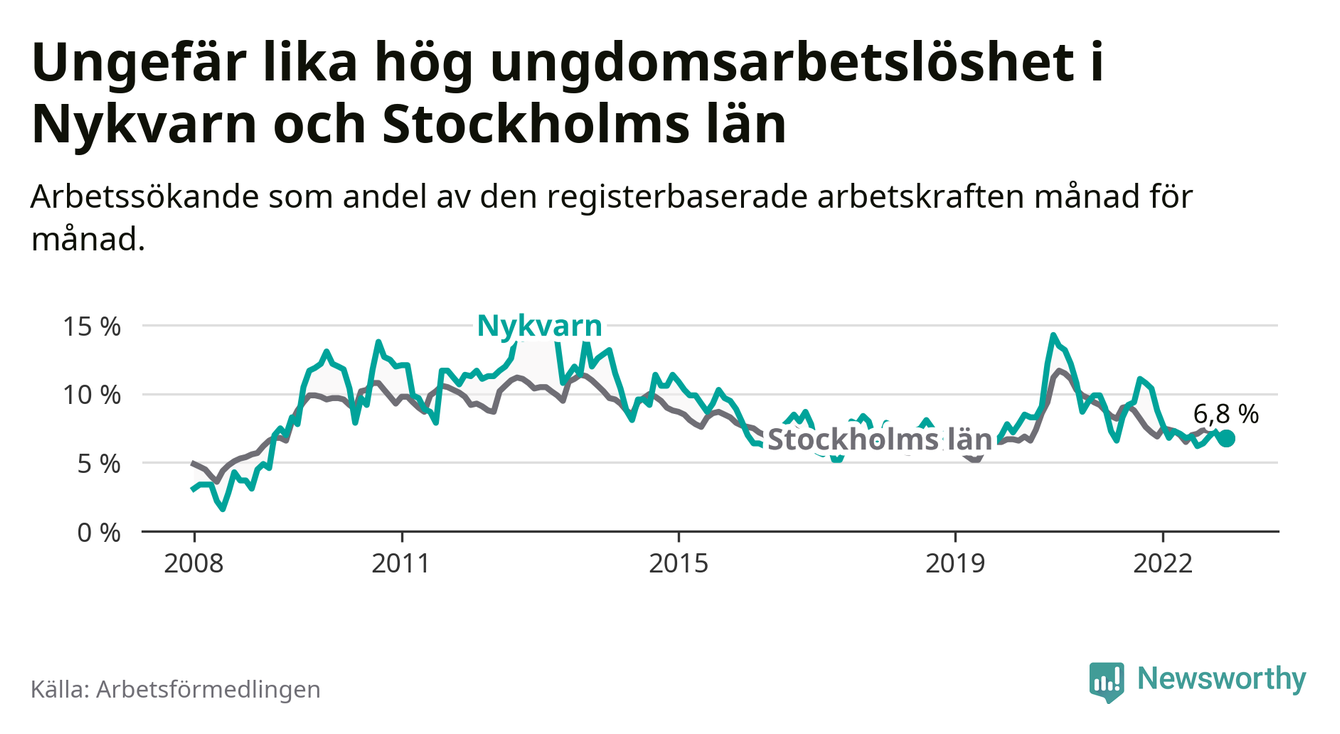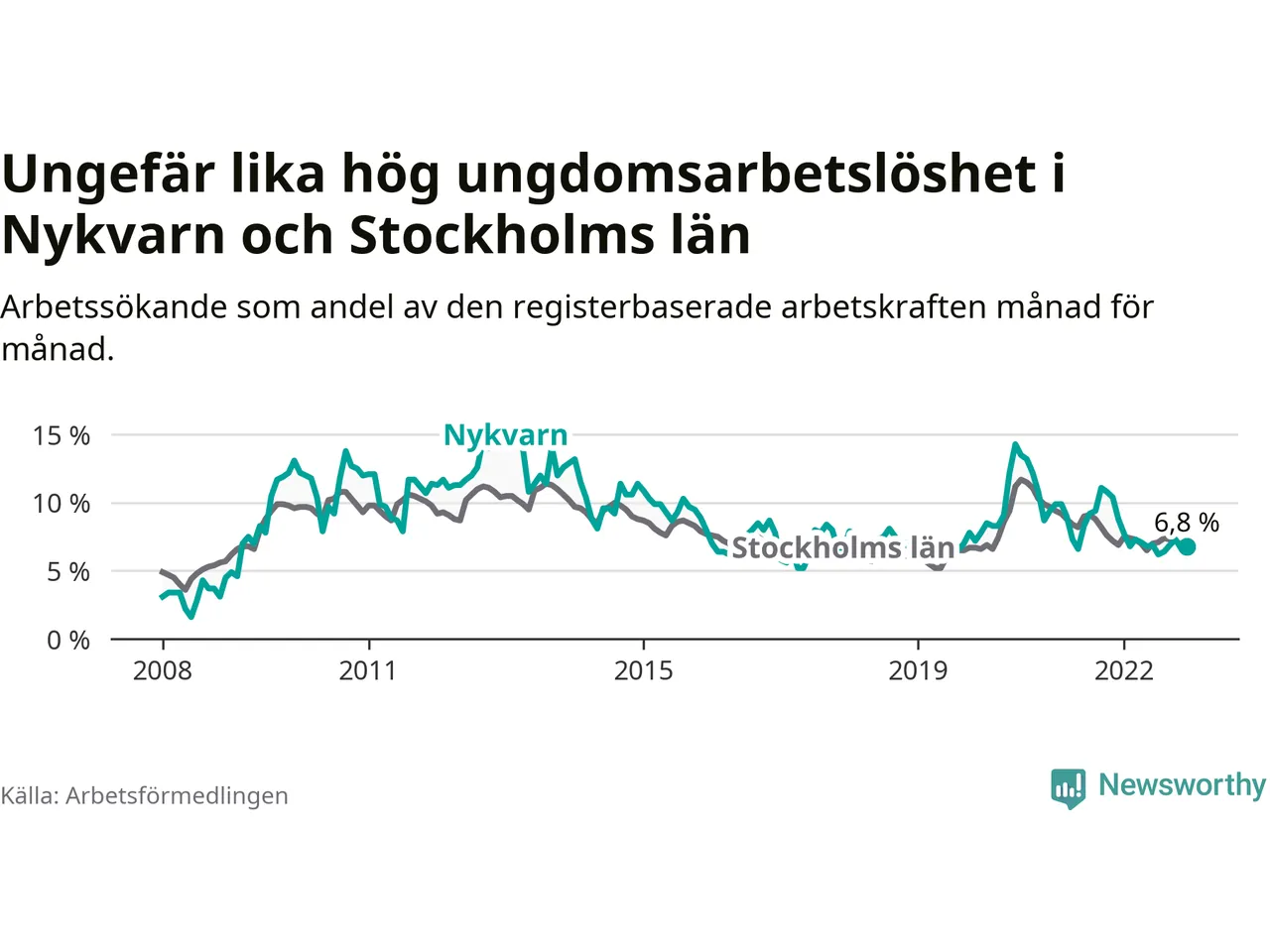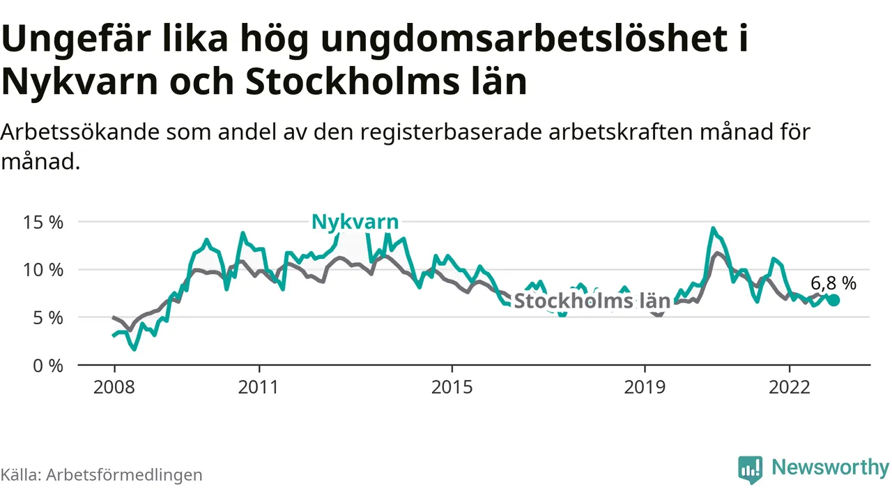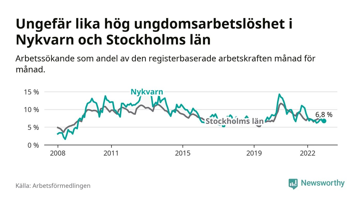 Medan Nykvarn har lägre total arbetslöshet än Stockholms län, ligger ungdomsarbetslösheten på i stort sett samma nivå.