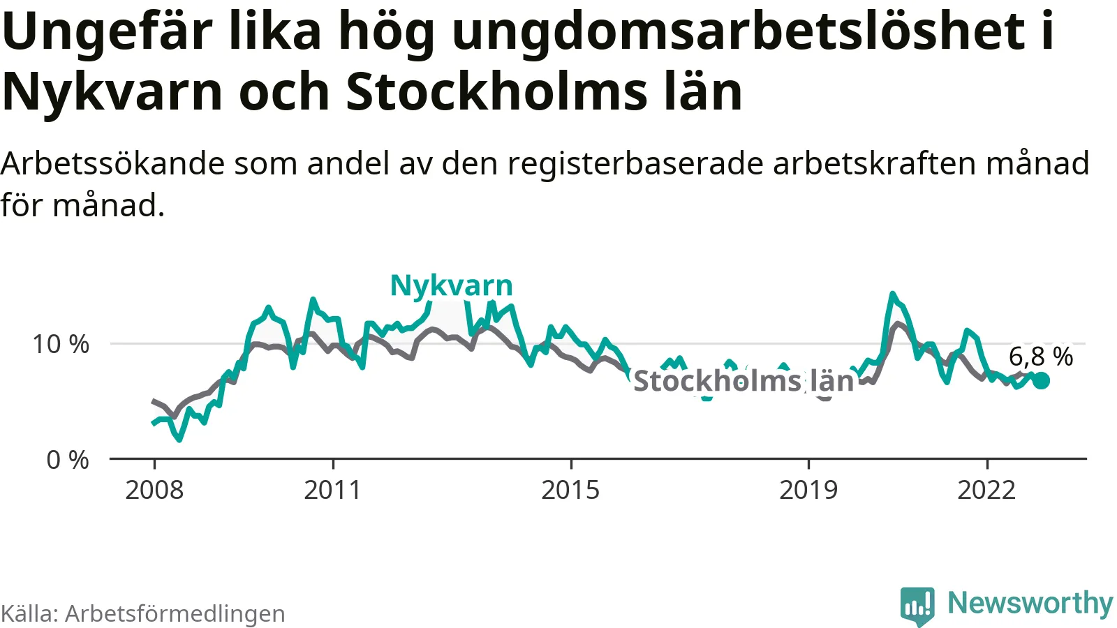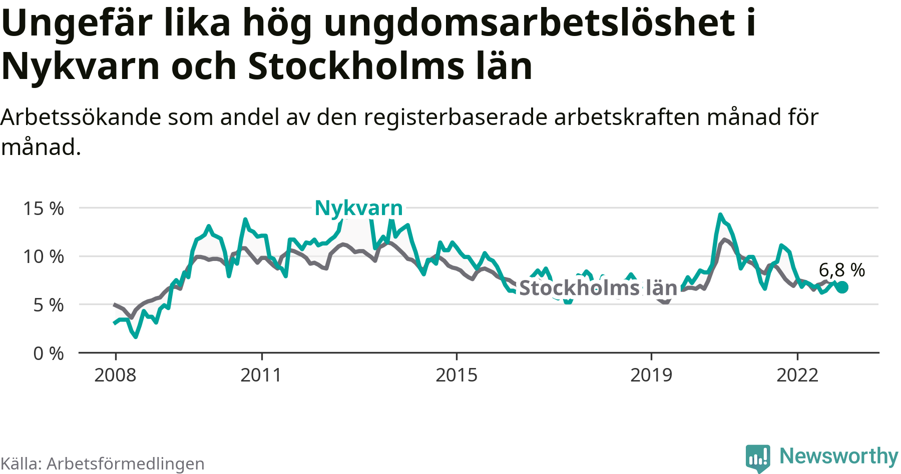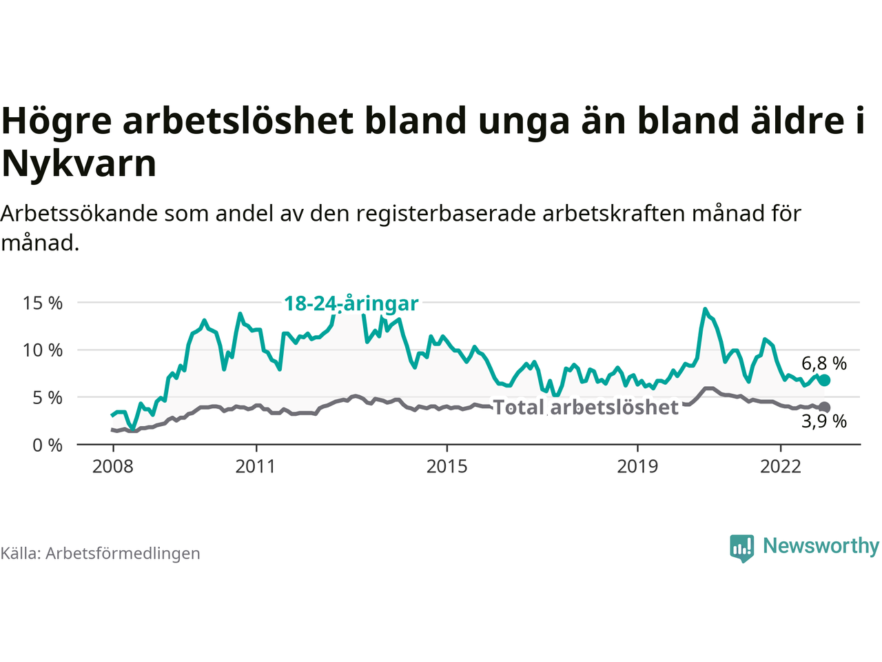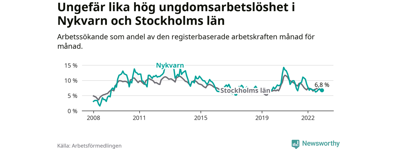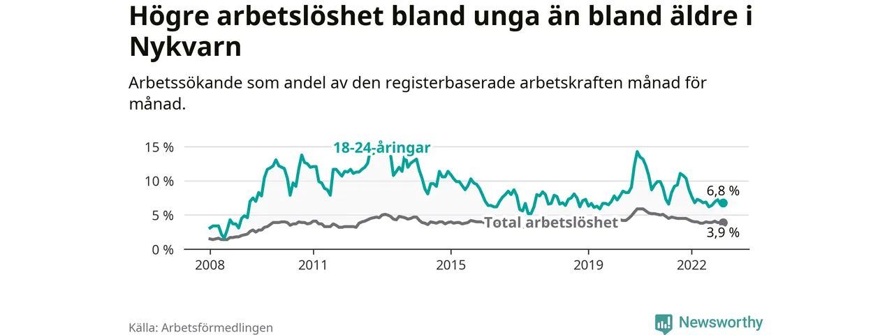 Medan Nykvarn har lägre total arbetslöshet än Stockholms län, ligger ungdomsarbetslösheten på i stort sett samma nivå.