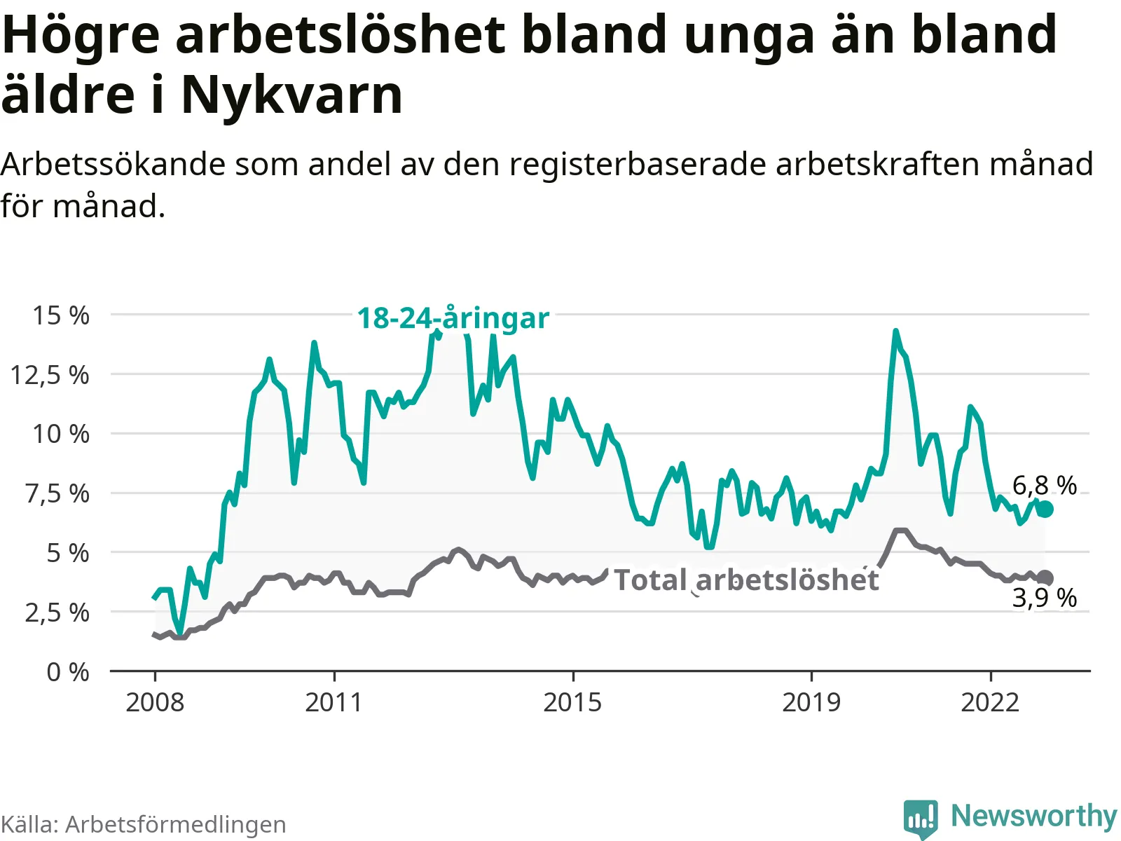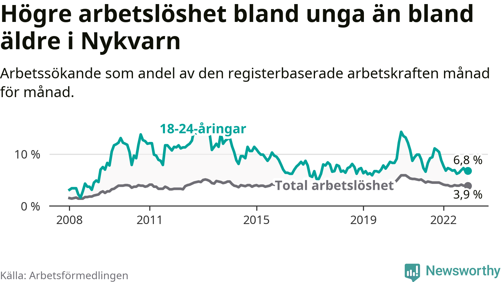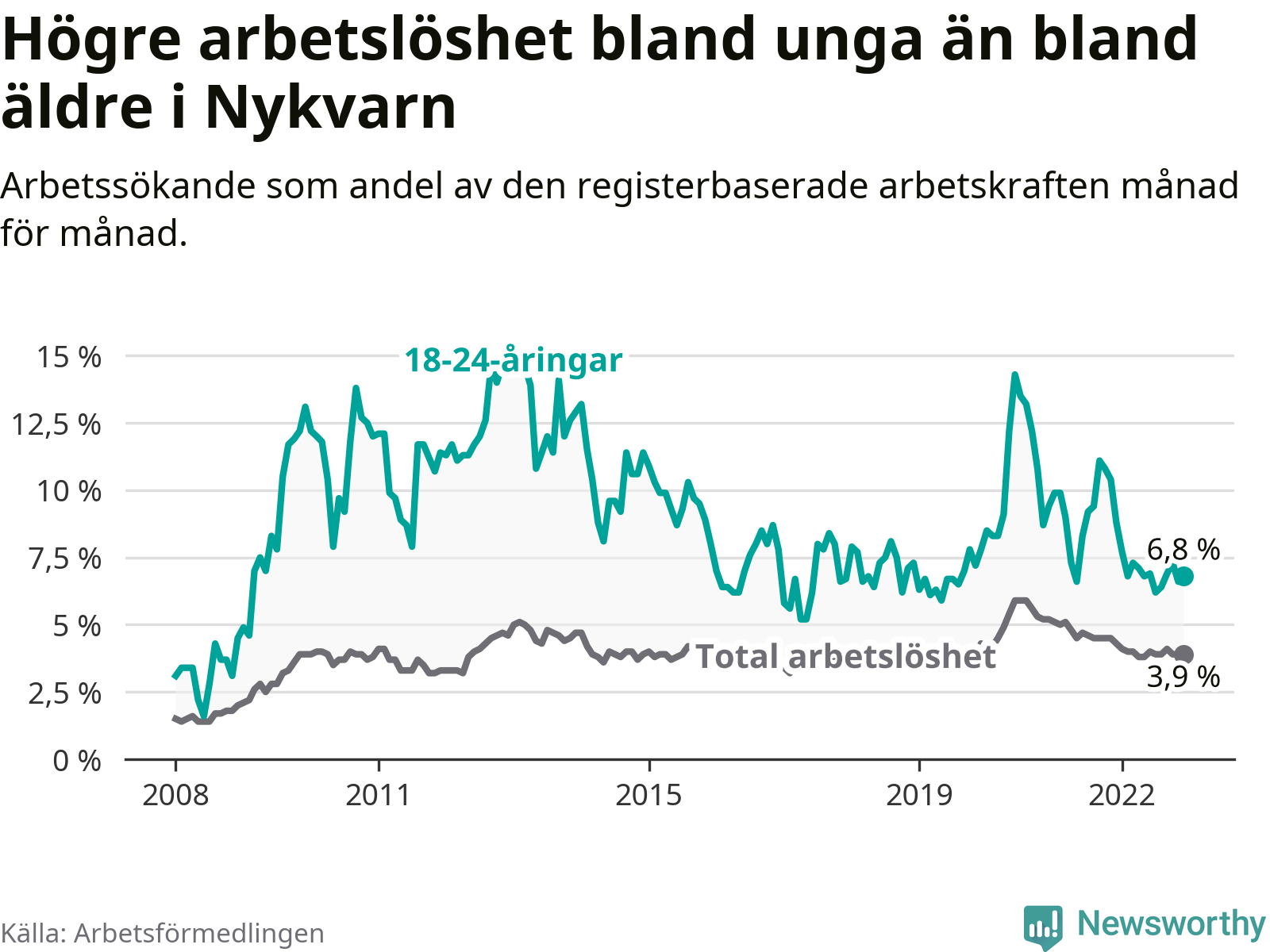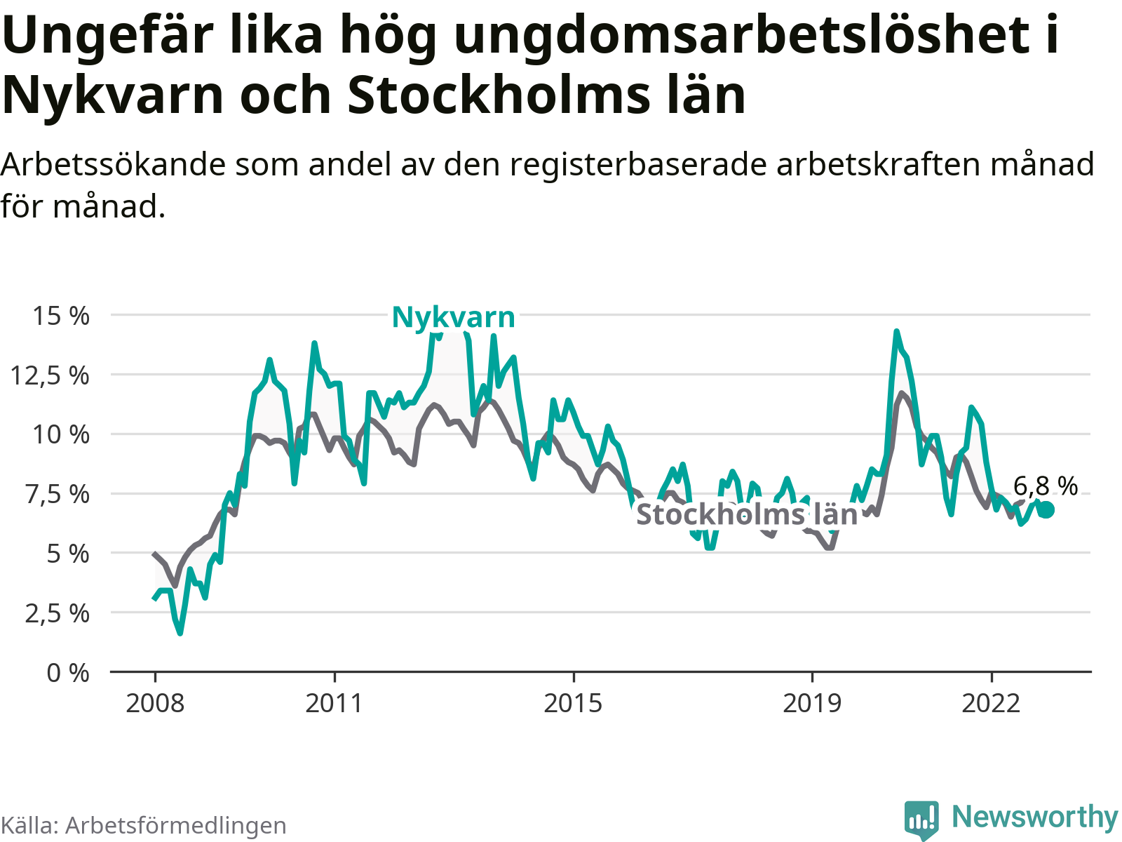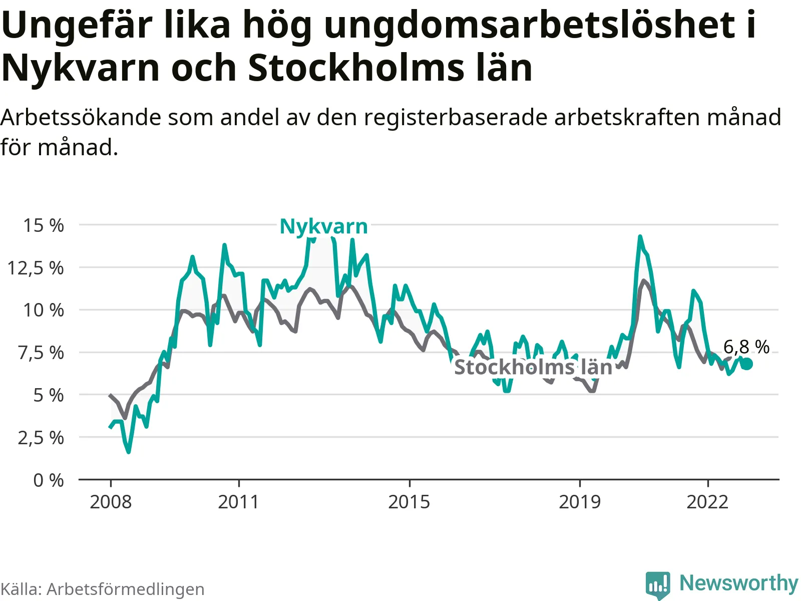 Medan Nykvarn har lägre total arbetslöshet än Stockholms län, ligger ungdomsarbetslösheten på i stort sett samma nivå.