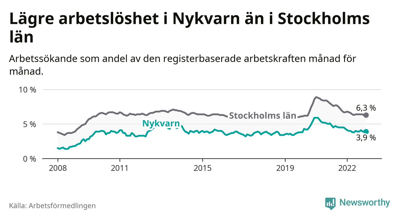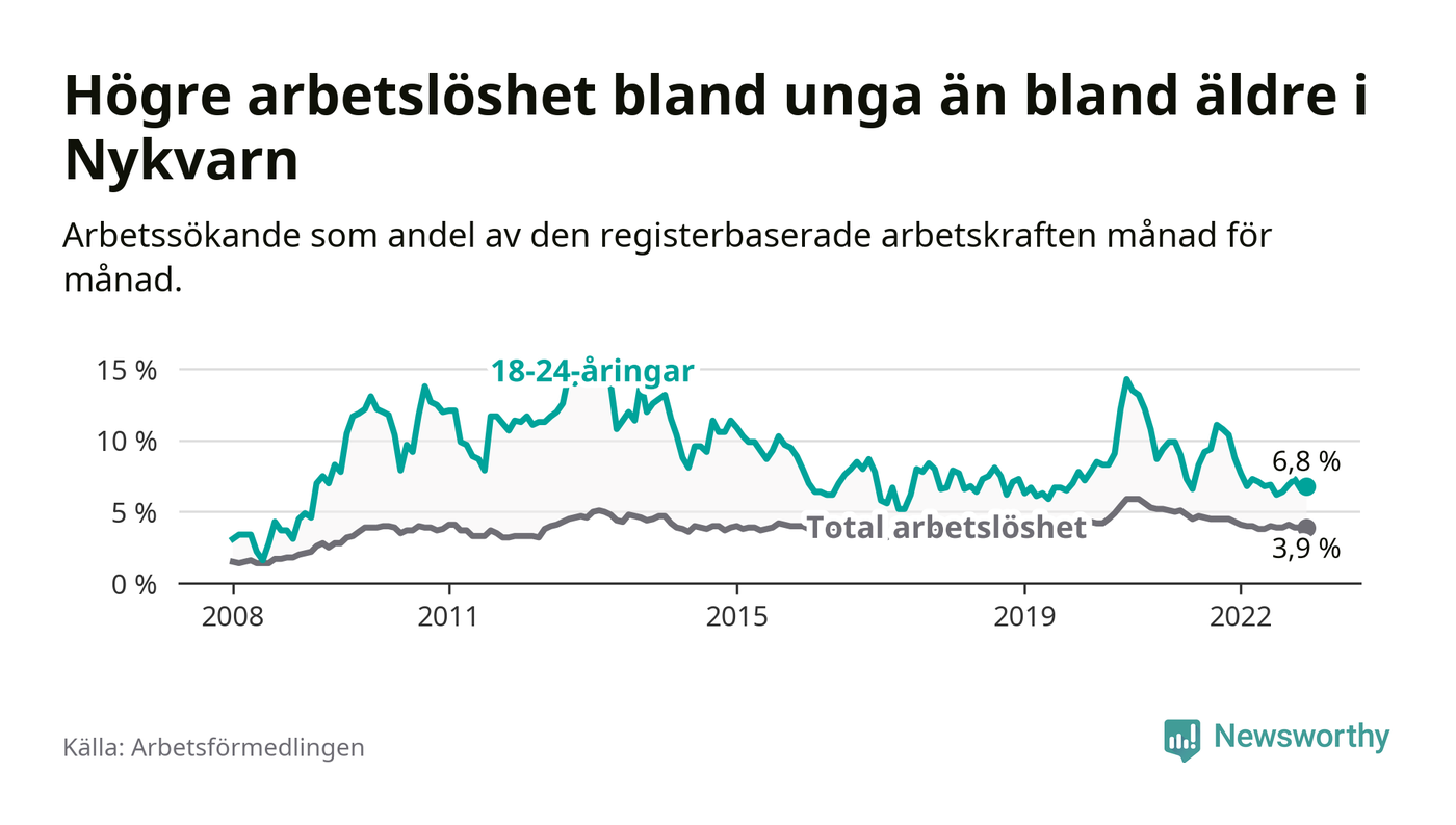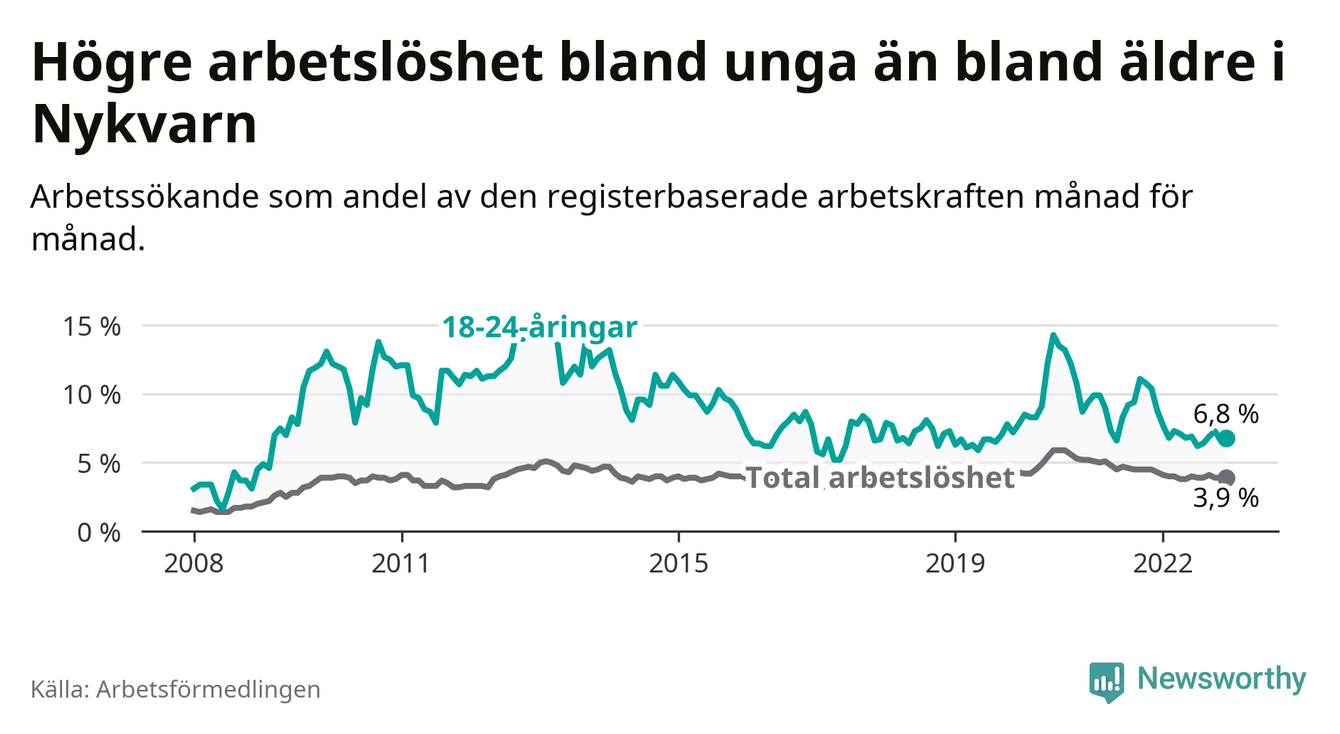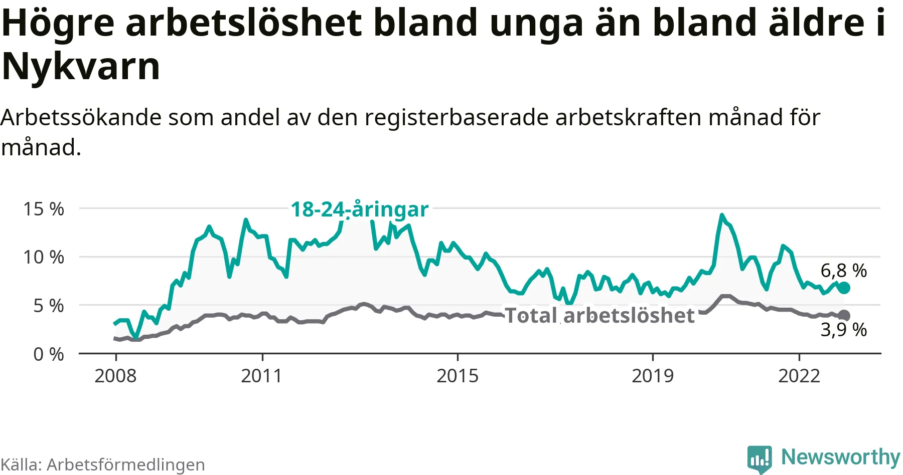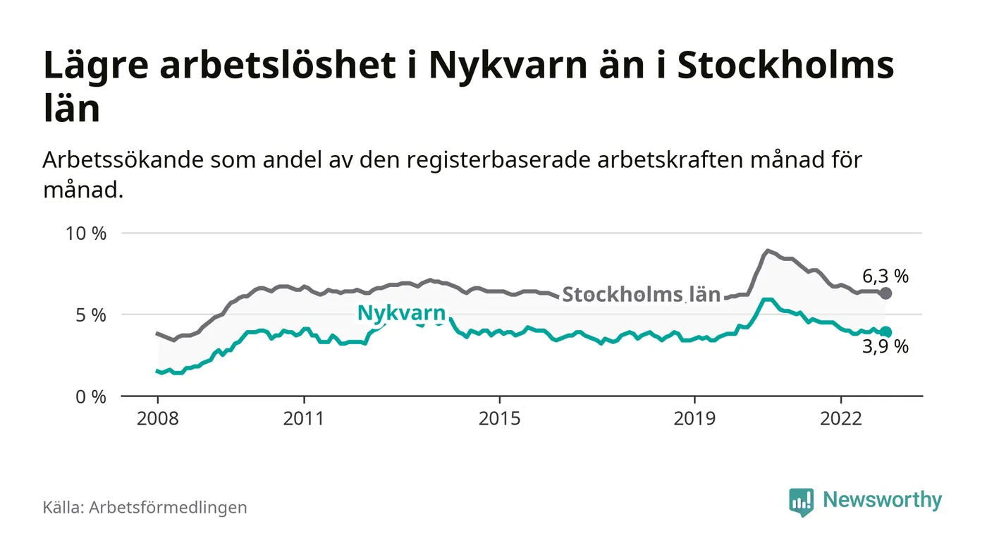 Medan Nykvarn har lägre total arbetslöshet än Stockholms län, ligger ungdomsarbetslösheten på i stort sett samma nivå.