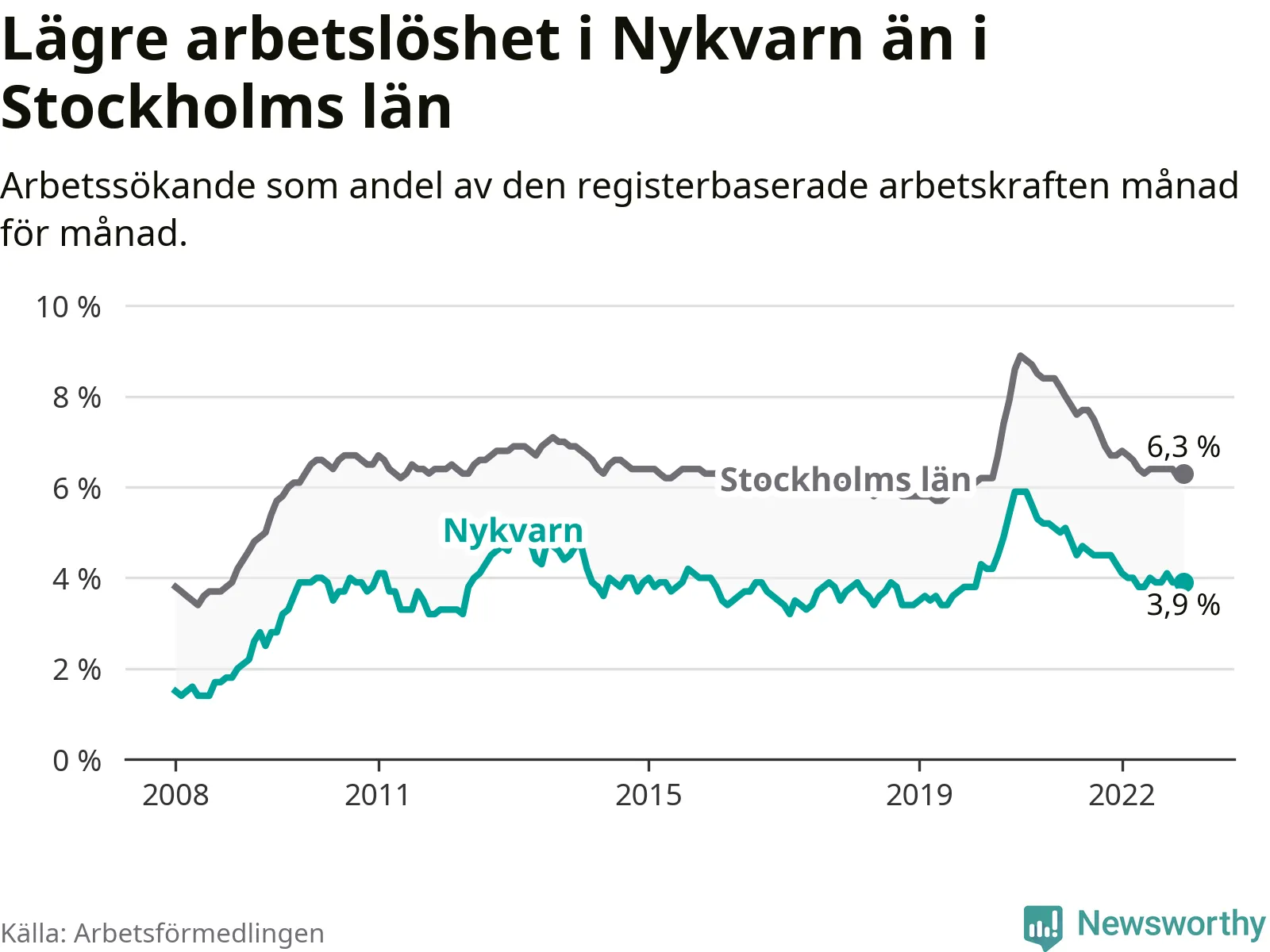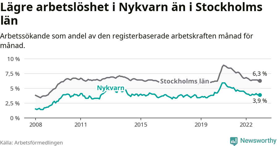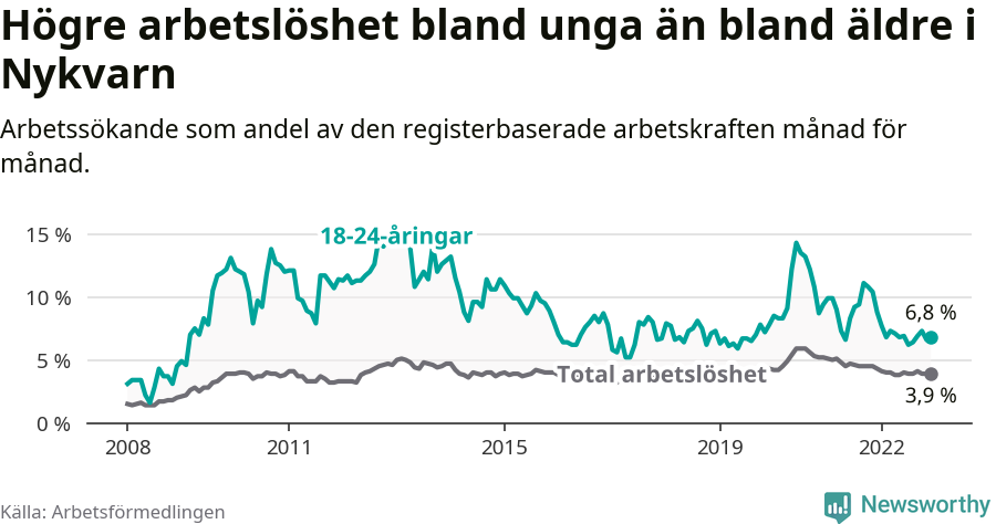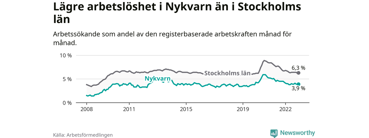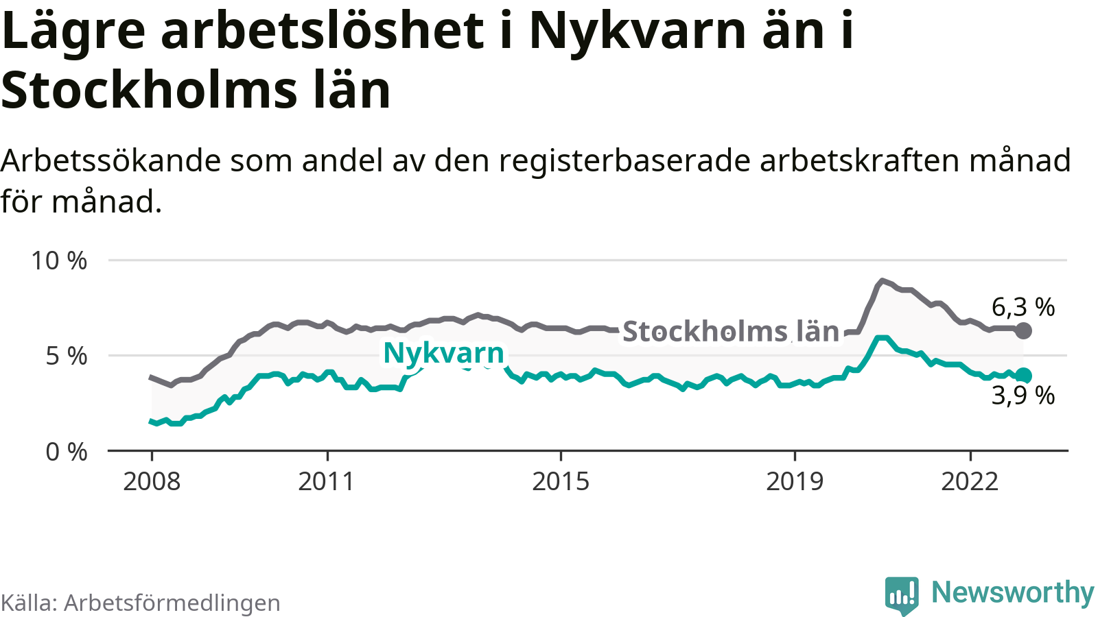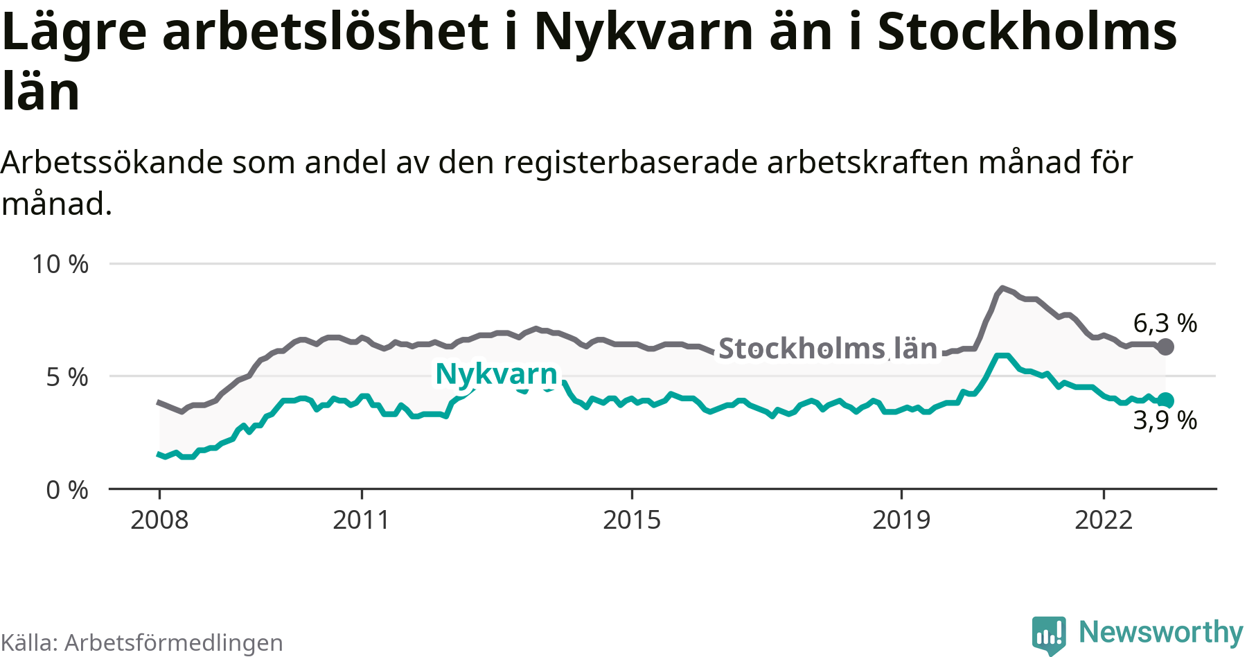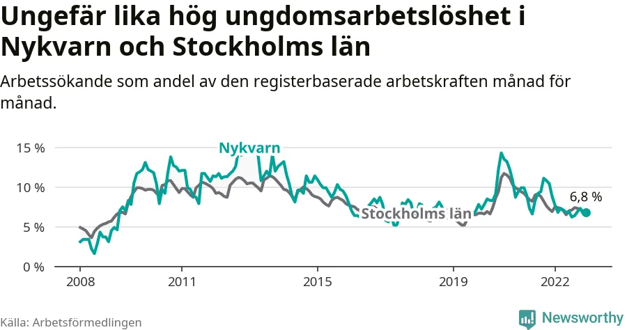 Medan Nykvarn har lägre total arbetslöshet än Stockholms län, ligger ungdomsarbetslösheten på i stort sett samma nivå.