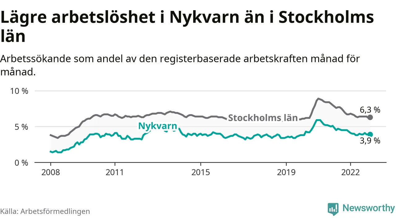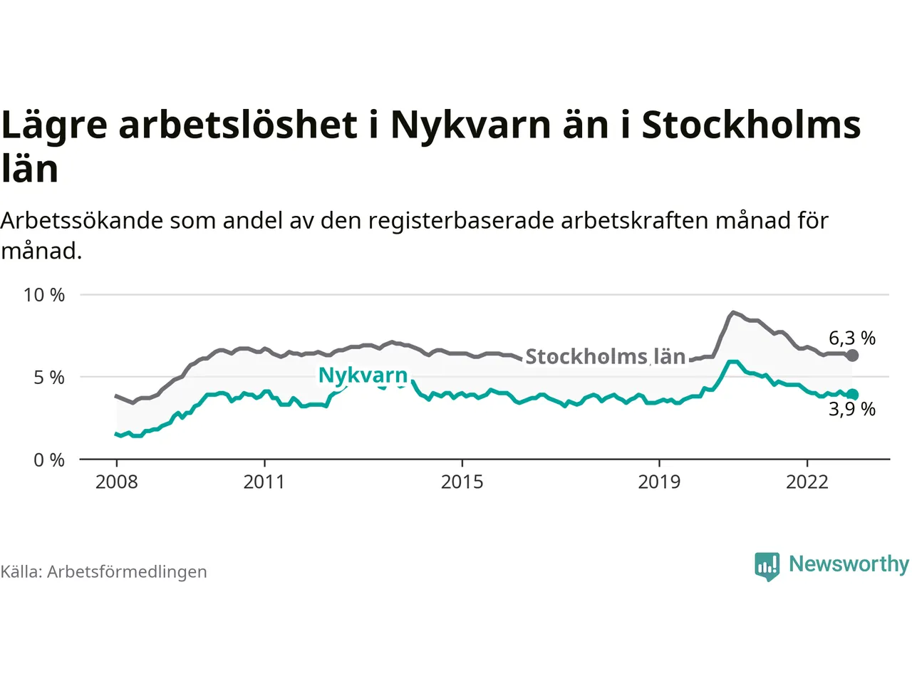 Nykvarn hade redan tidigare lägre arbetslöshet än snittet i hela Stockholms län och nu växer klyftan (3,9 procent i kommunen, jämfört med 6,3 procent i hela länet). Ekerö och Vaxholm har den lägsta arbetslösheten i länet (3,2 procent), medan Botkyrka har den högsta (11,1 procent). För att Nykvarn skulle komma ner i samma arbetslöshetsnivå som Ekerö och Vaxholm skulle 41 personer behöva sysselsättas.