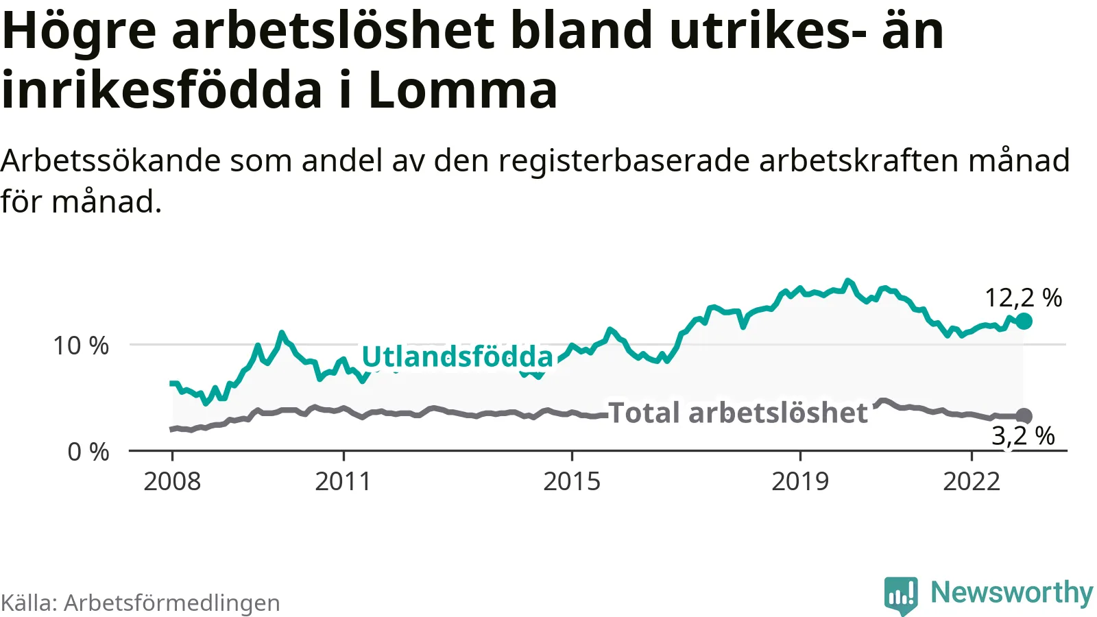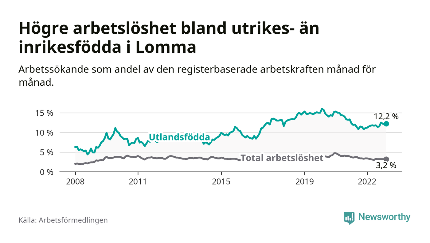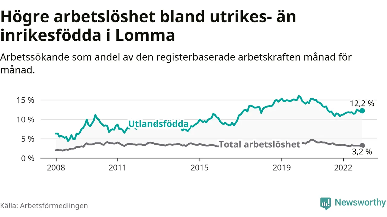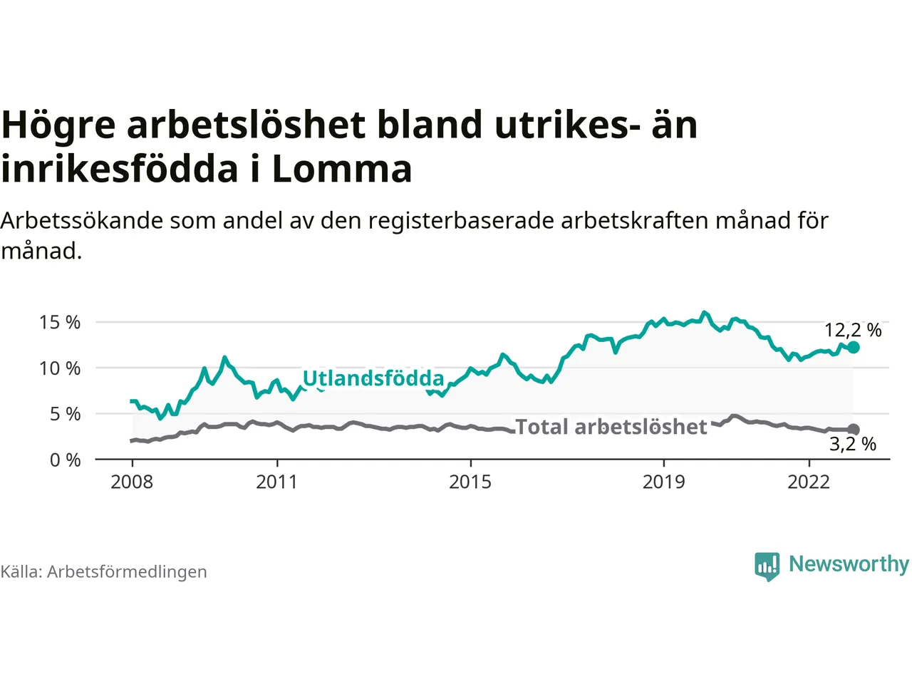 Arbetslösheten bland utlandsfödda var 12,2 procent i Lomma under december månad, motsvarande 150 av 1 230 personer. Det är 1,1 procentenheter fler än vid samma tidpunkt i fjol (+14 om man räknar personer).