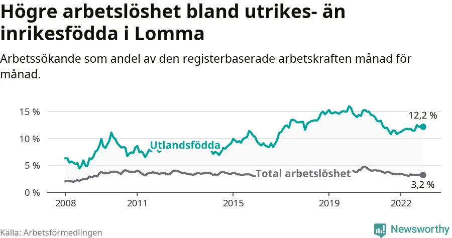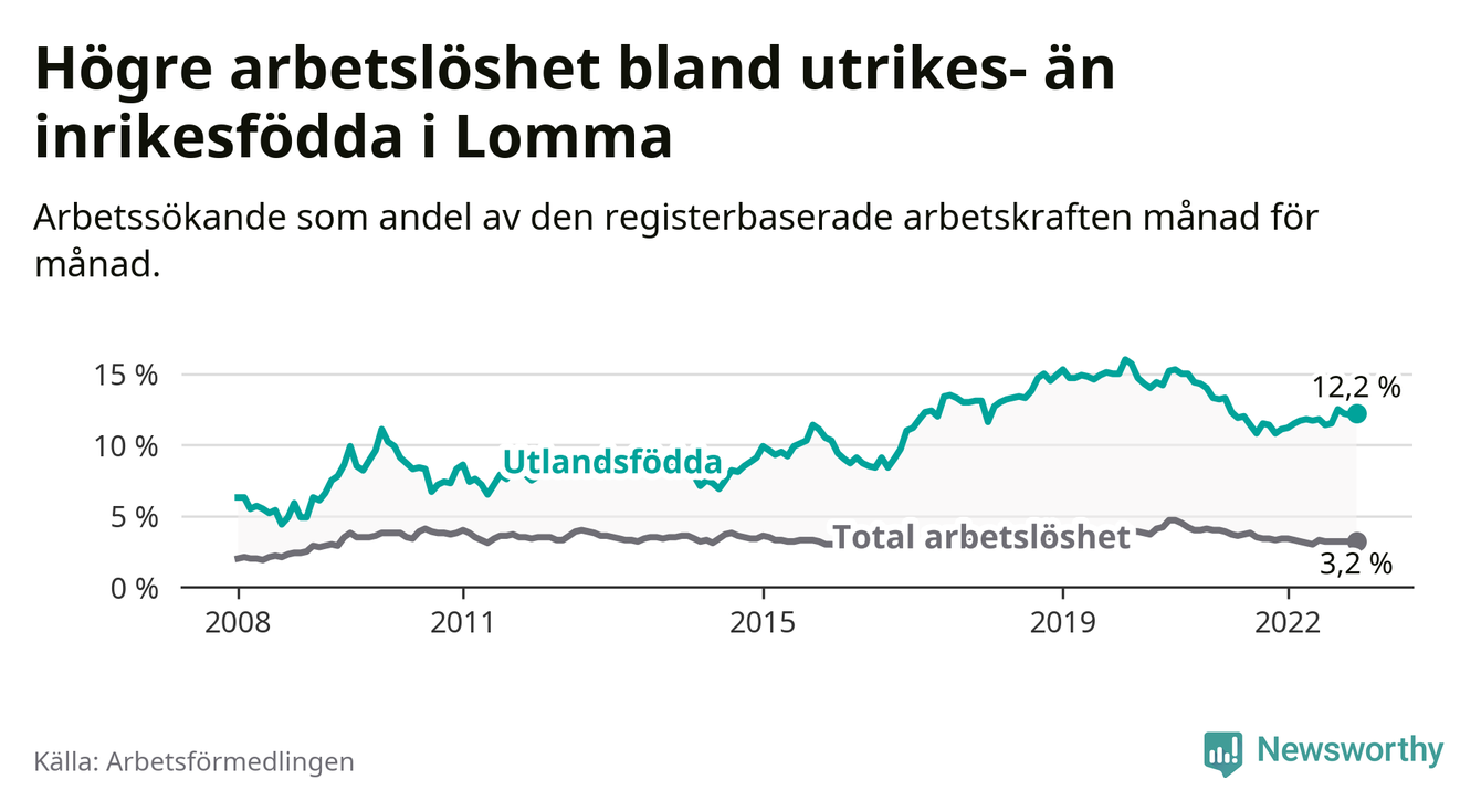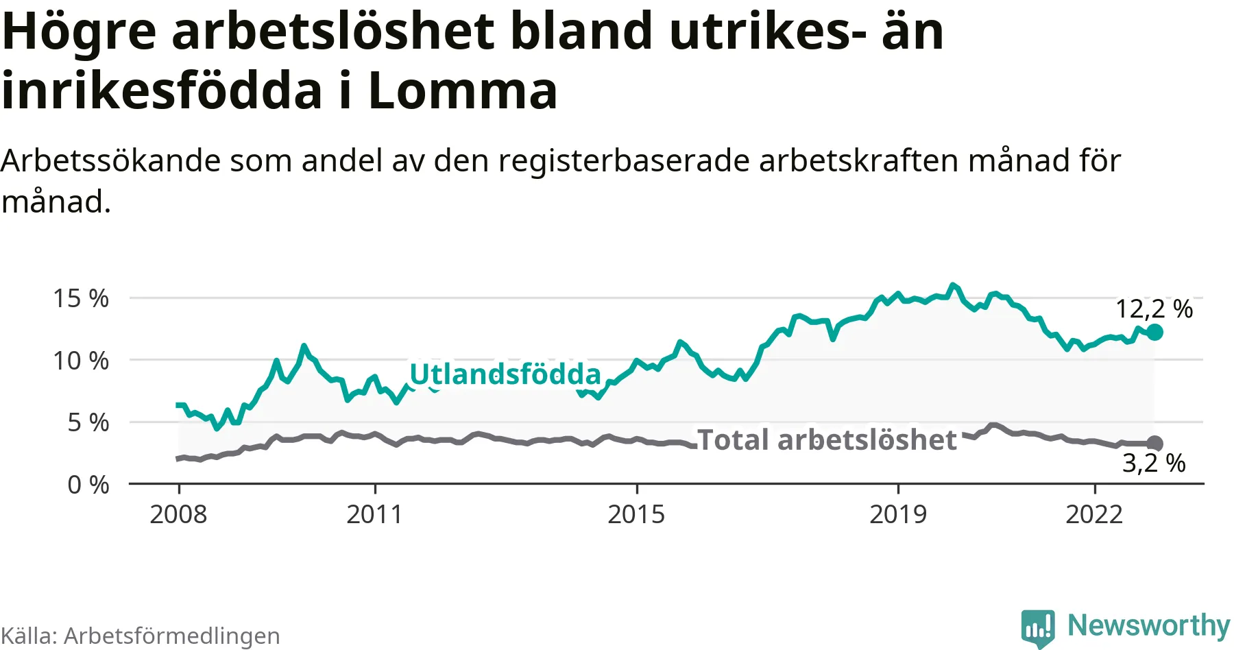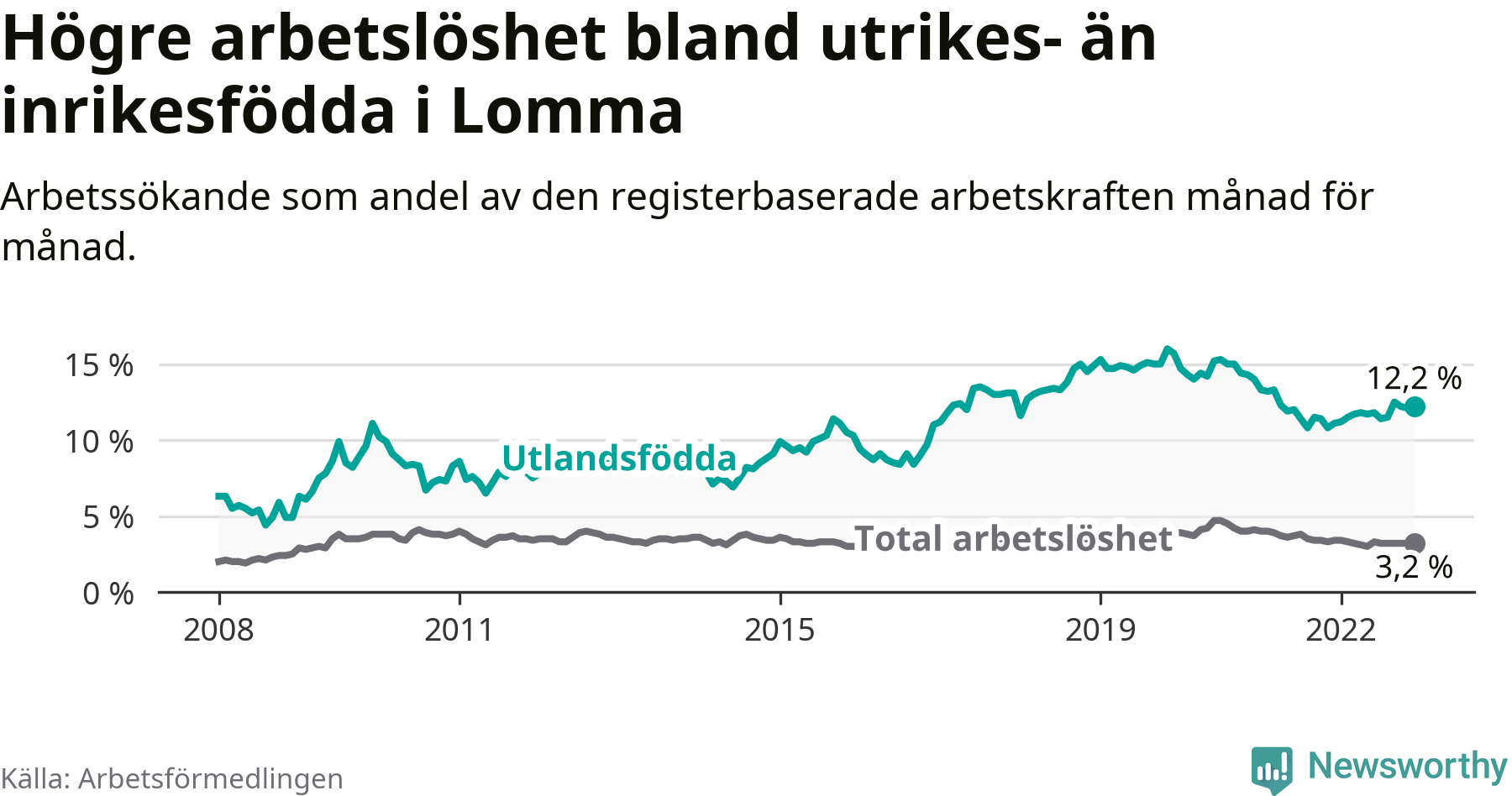 Arbetslösheten bland utlandsfödda var 12,2 procent i Lomma under december månad, motsvarande 150 av 1 230 personer. Det är 1,1 procentenheter fler än vid samma tidpunkt i fjol (+14 om man räknar personer).