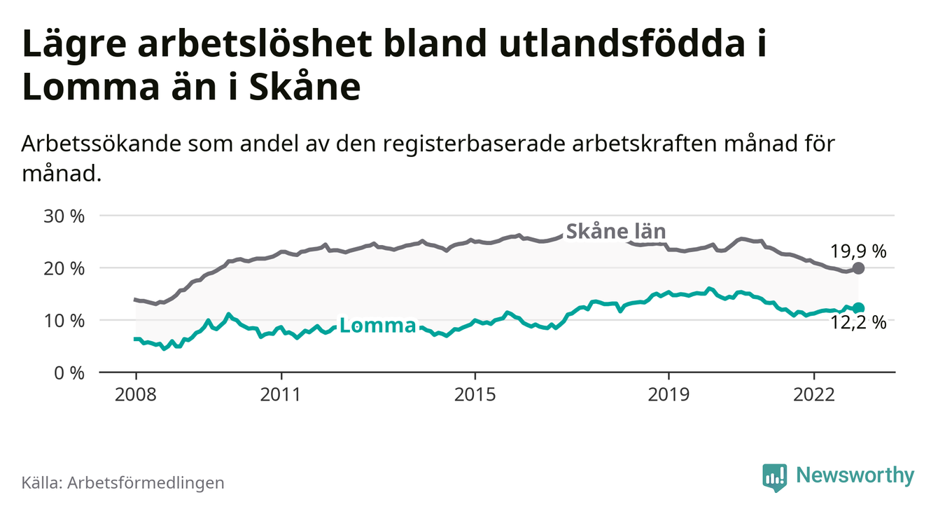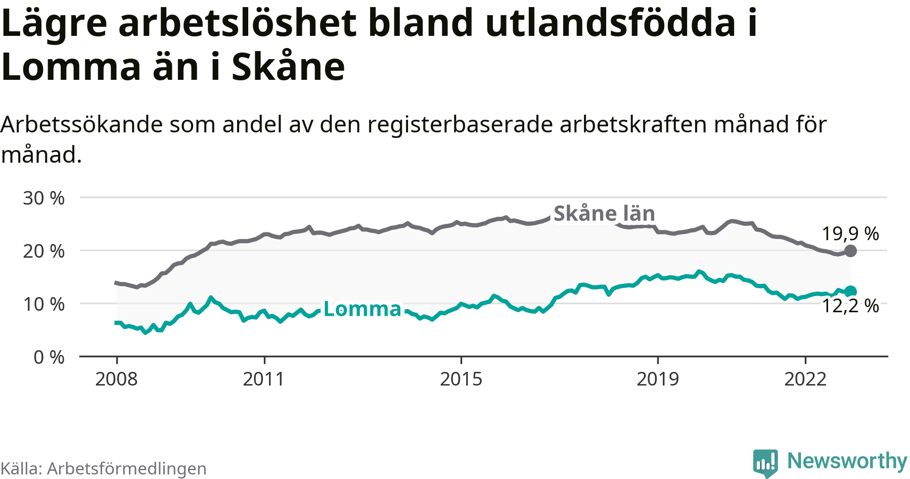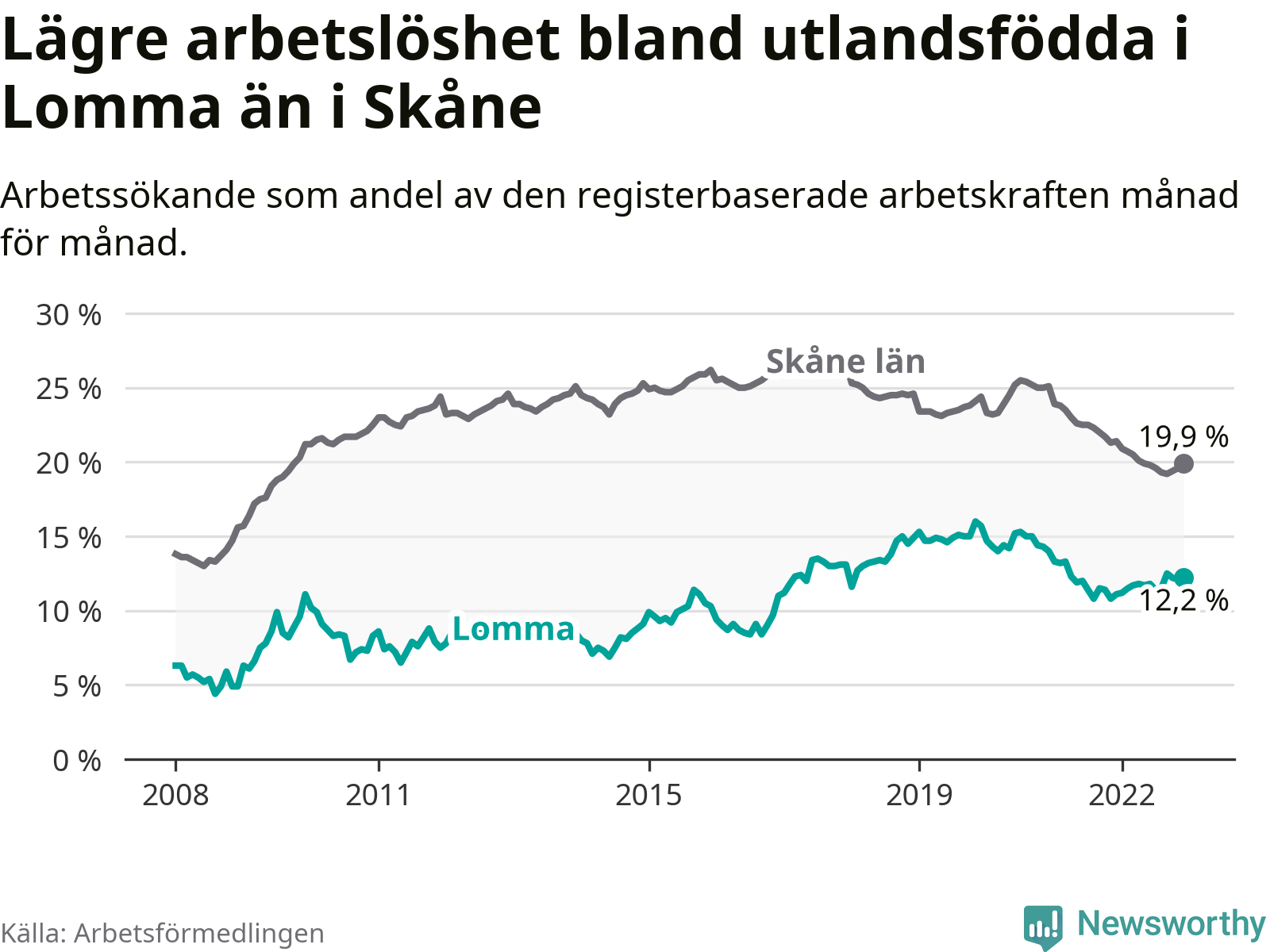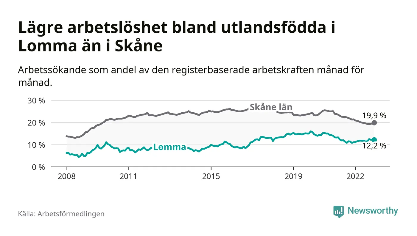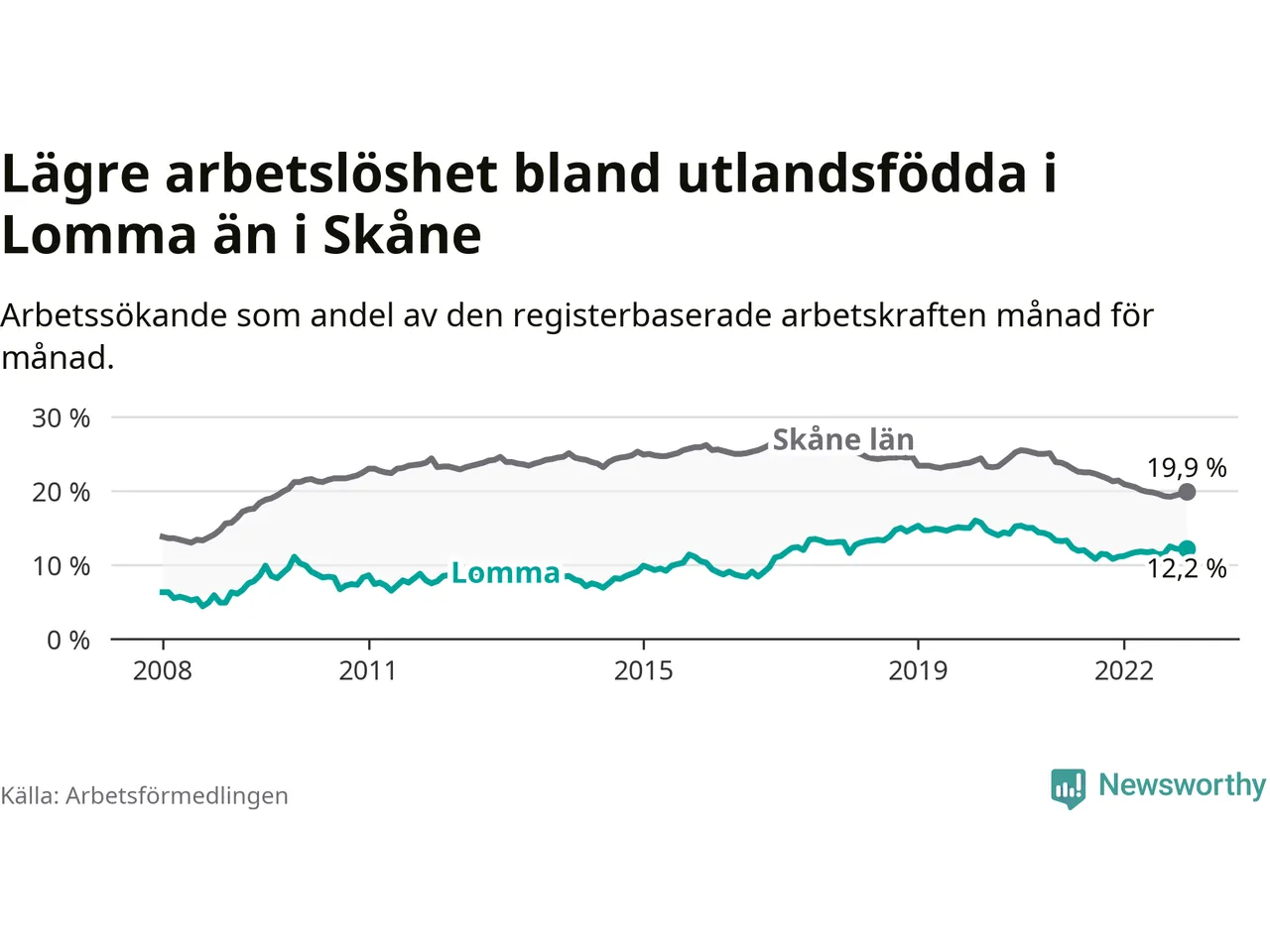 Medan arbetslösheten bland utlandsfödda alltså ökar i Lomma så minskar den i Skåne. Jämfört med december förra året har andelen arbetslösa utlandsfödda i länet minskat med 1,5 procentenheter (till 19,9 procent). Trots den senaste uppgången har Lomma med andra ord fortfarande lägre arbetslöshet bland utlandsfödda än Skåne.