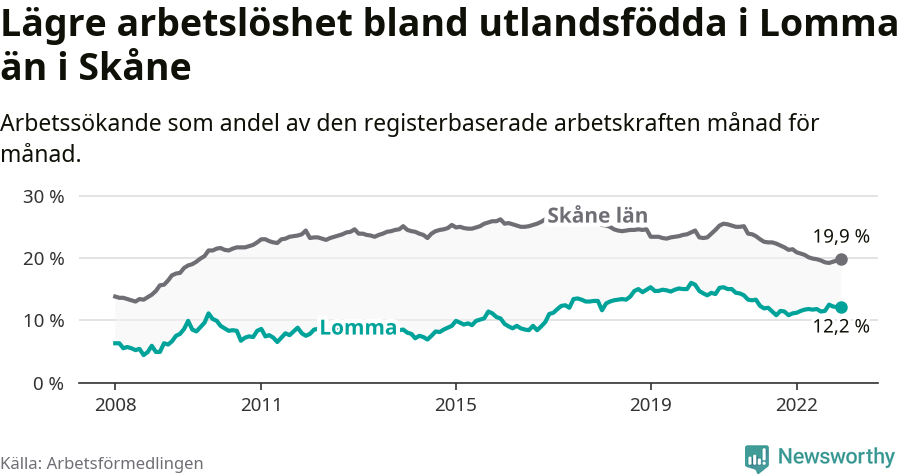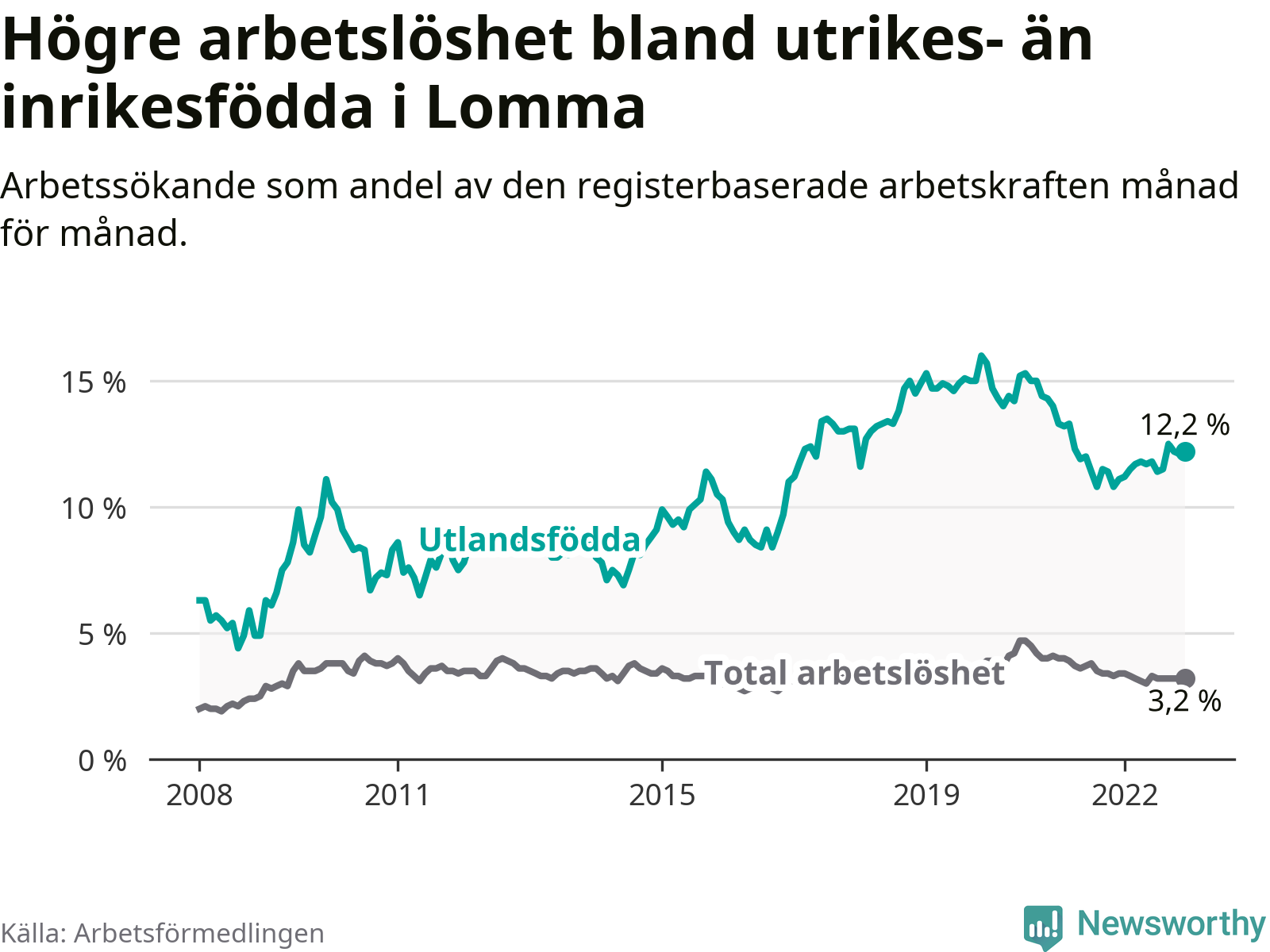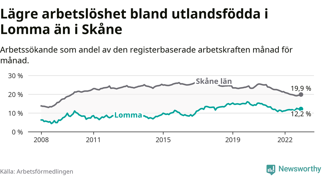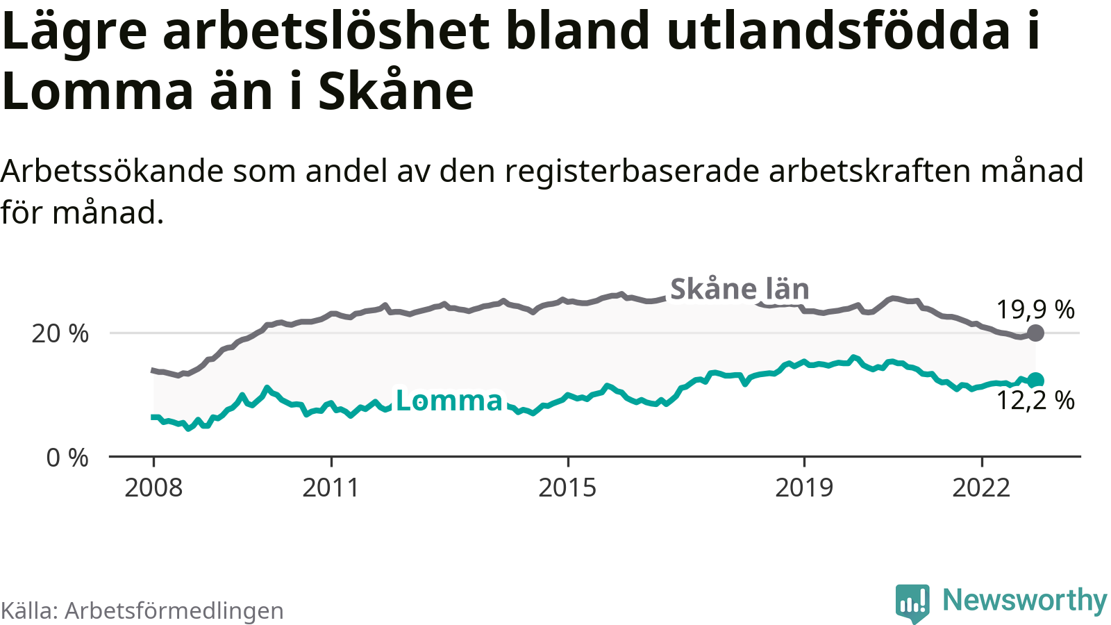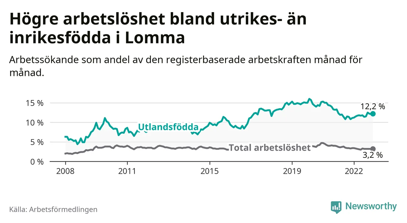Medan arbetslösheten bland utlandsfödda alltså ökar i Lomma så minskar den i Skåne. Jämfört med december förra året har andelen arbetslösa utlandsfödda i länet minskat med 1,5 procentenheter (till 19,9 procent). Trots den senaste uppgången har Lomma med andra ord fortfarande lägre arbetslöshet bland utlandsfödda än Skåne.