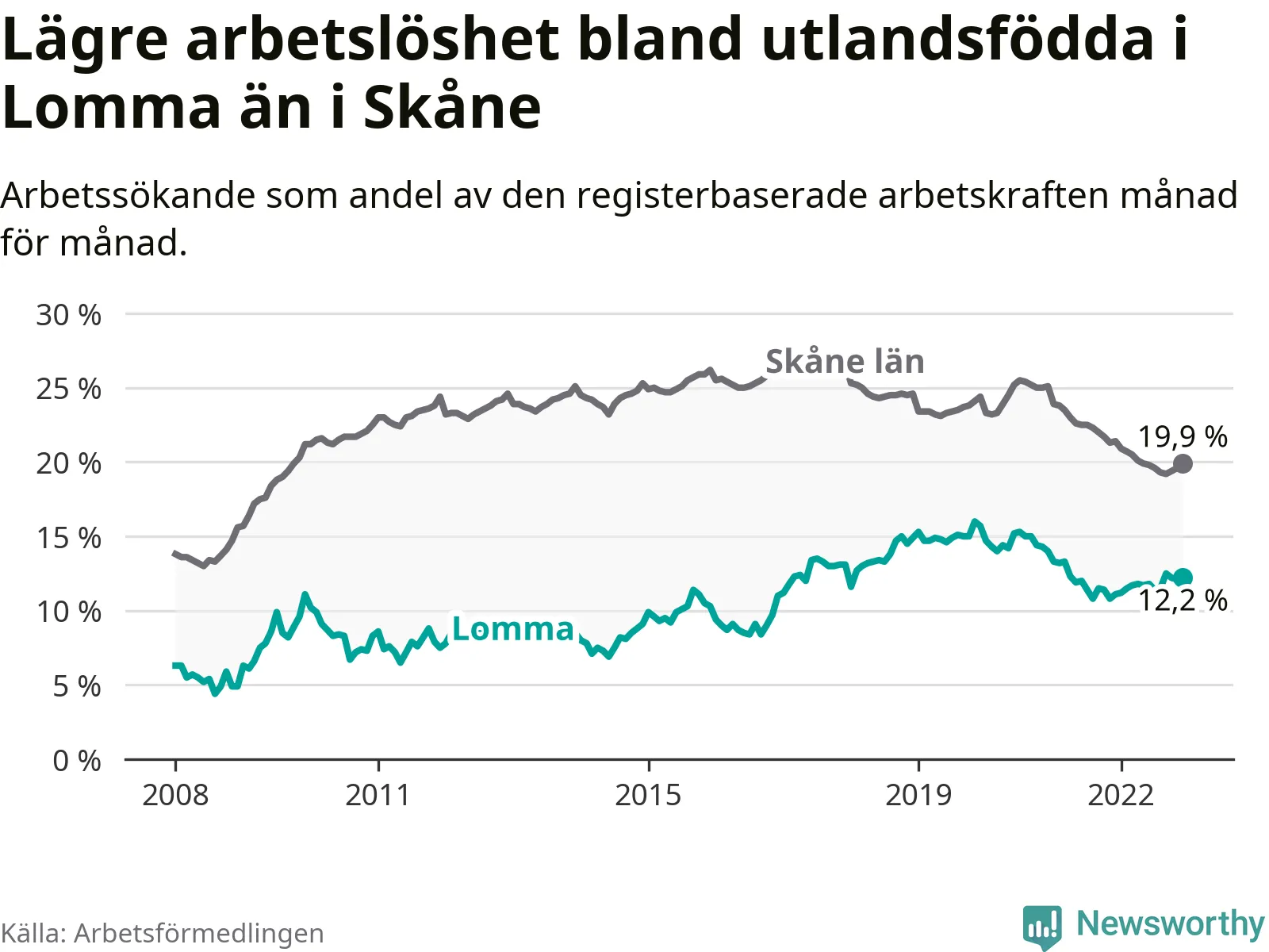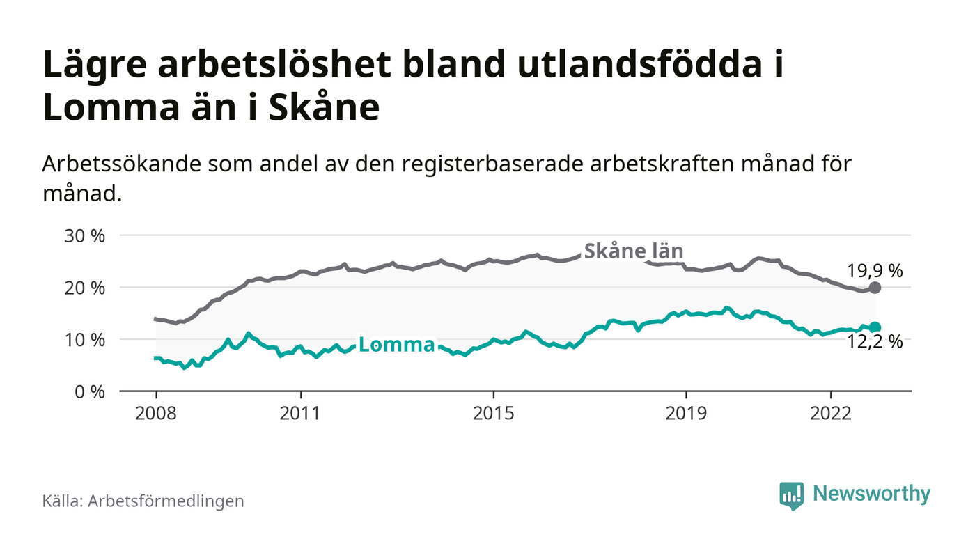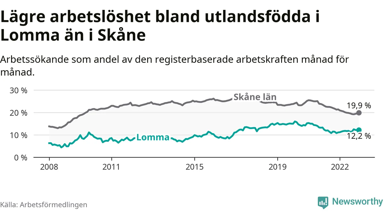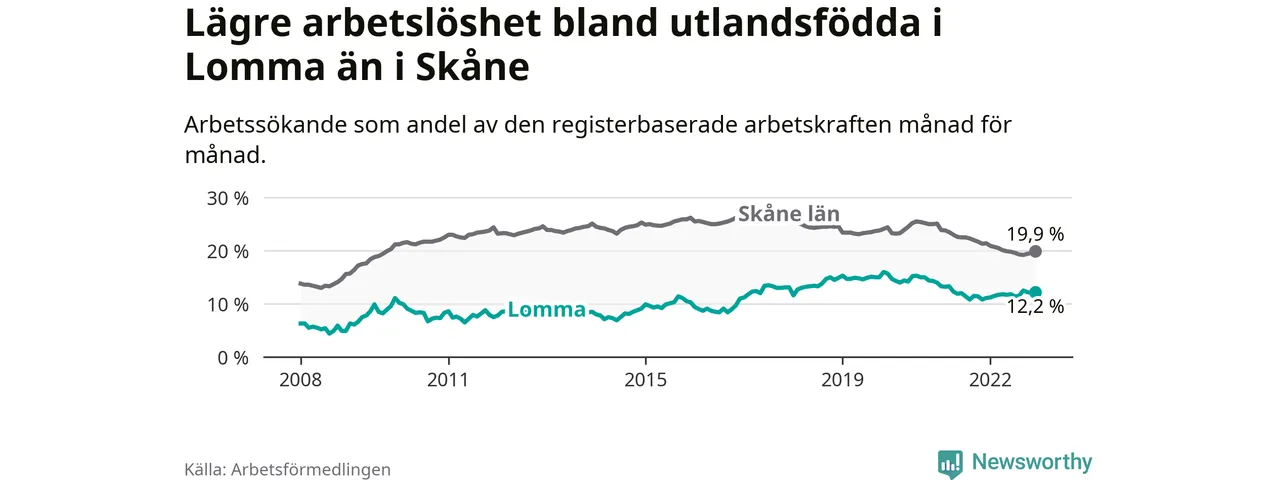 Graf: Arbetslöshet bland utrikesfödda i Lomma kommun och Skåne län