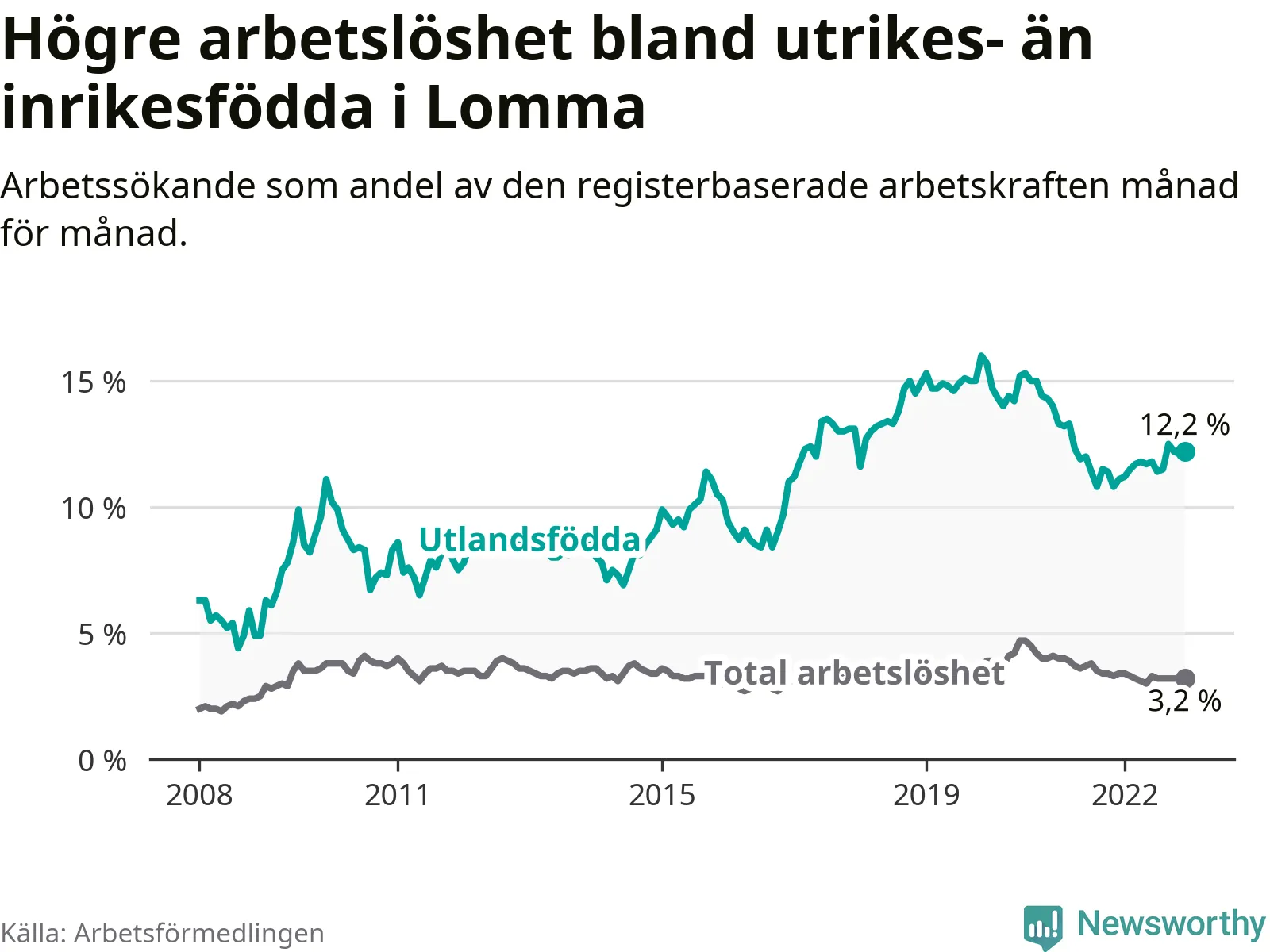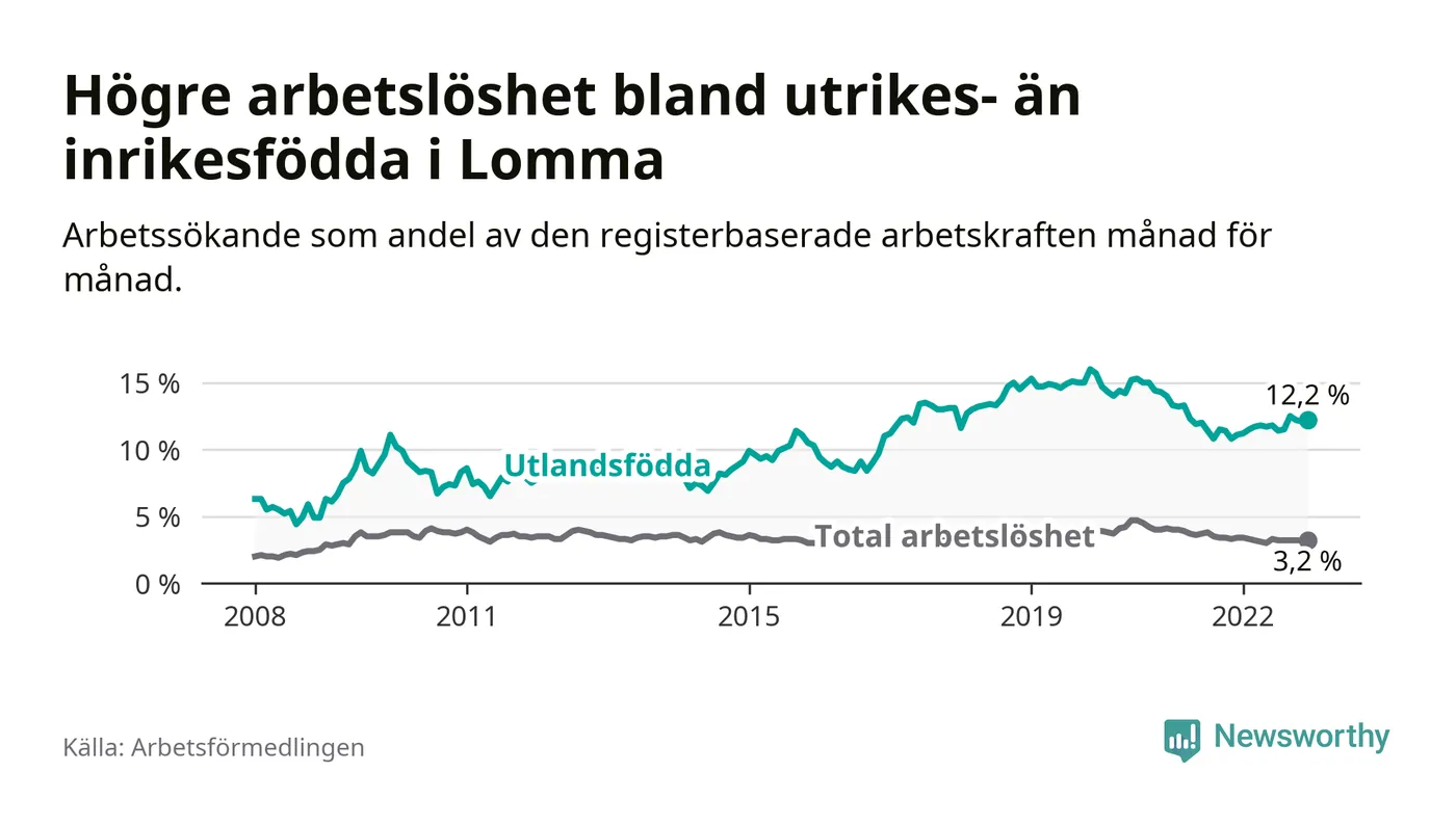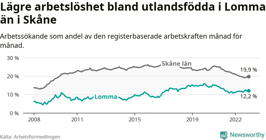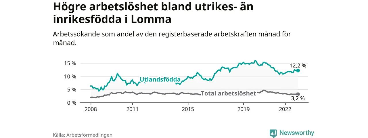 Graf: Arbetslöshet bland utrikesfödda i Lomma kommun och Skåne län