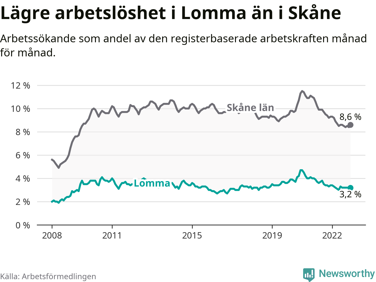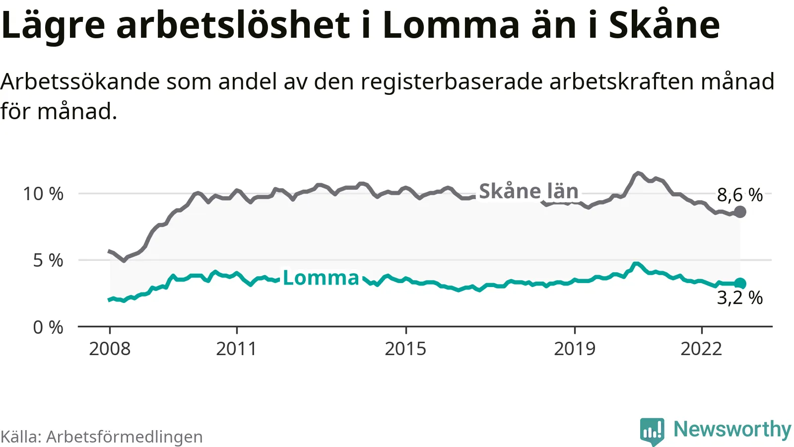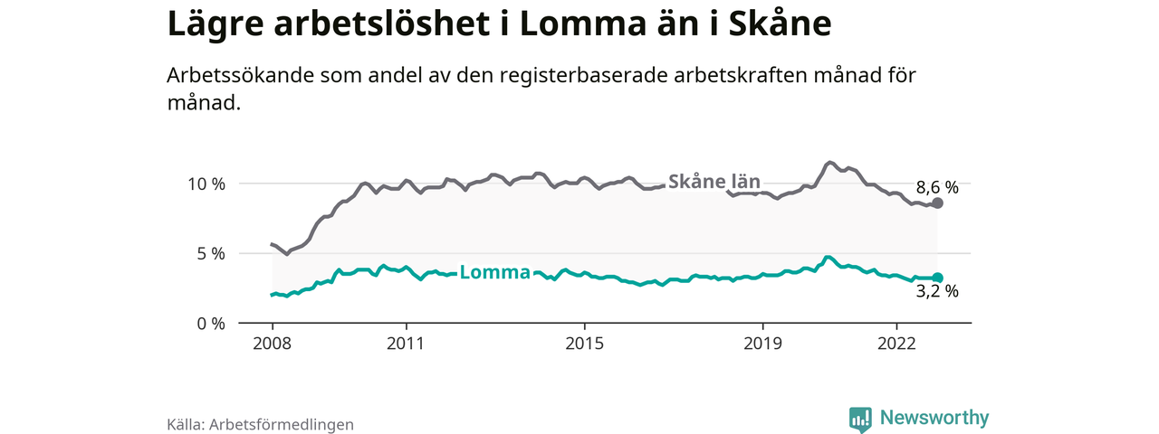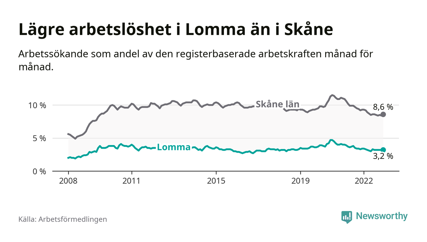 Graf: Arbetslöshet i Lomma kommun och Skåne län