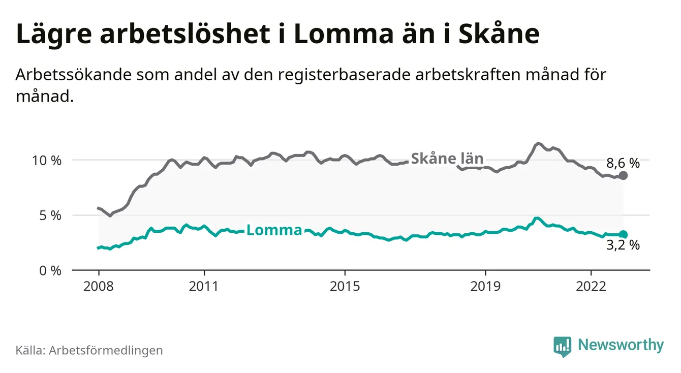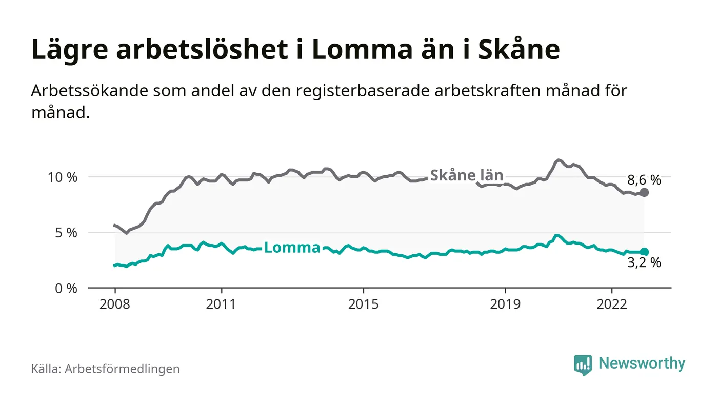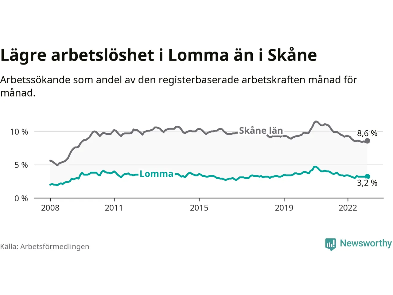 Lomma hade redan tidigare lägre arbetslöshet än snittet i hela Skåne län och nu växer klyftan (3,2 procent i kommunen, jämfört med 8,6 procent i hela länet). Lomma har därmed även den lägsta arbetslöshetsnivån i länet. Perstorp har den högsta (13,2 procent).
