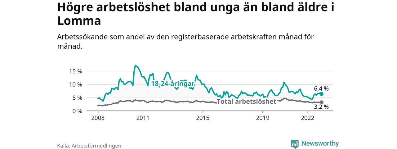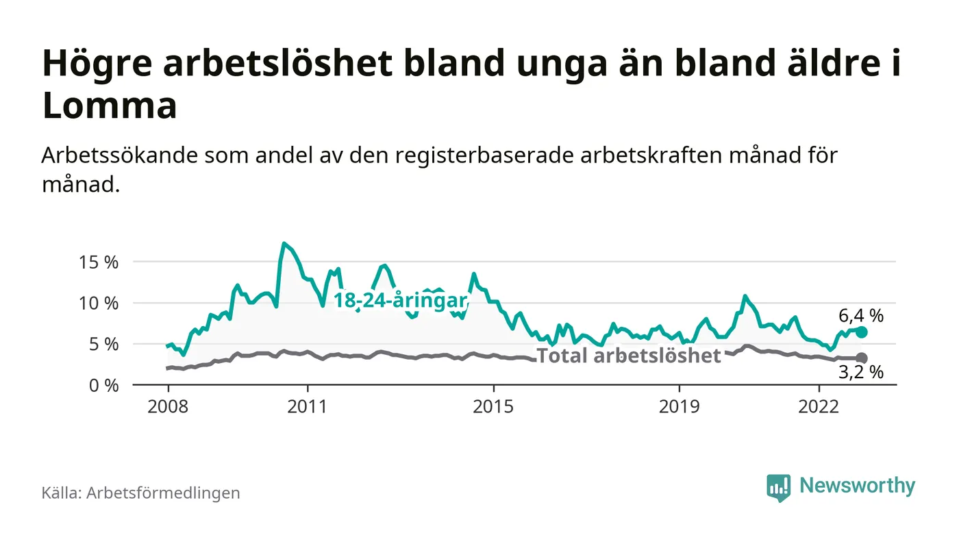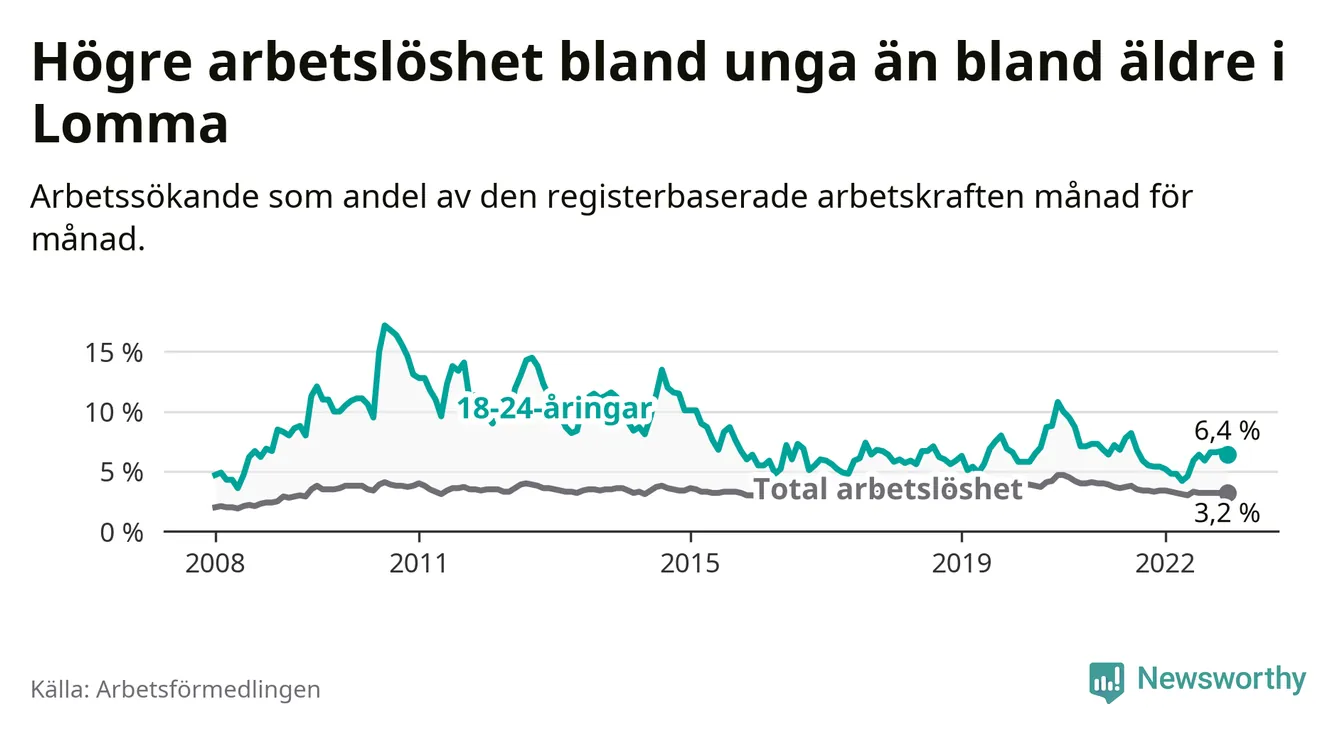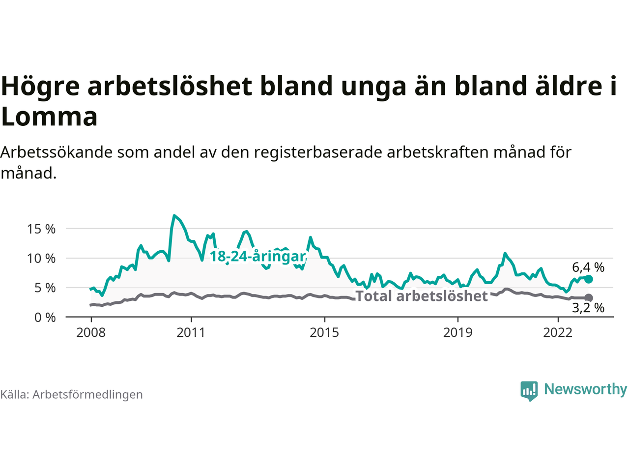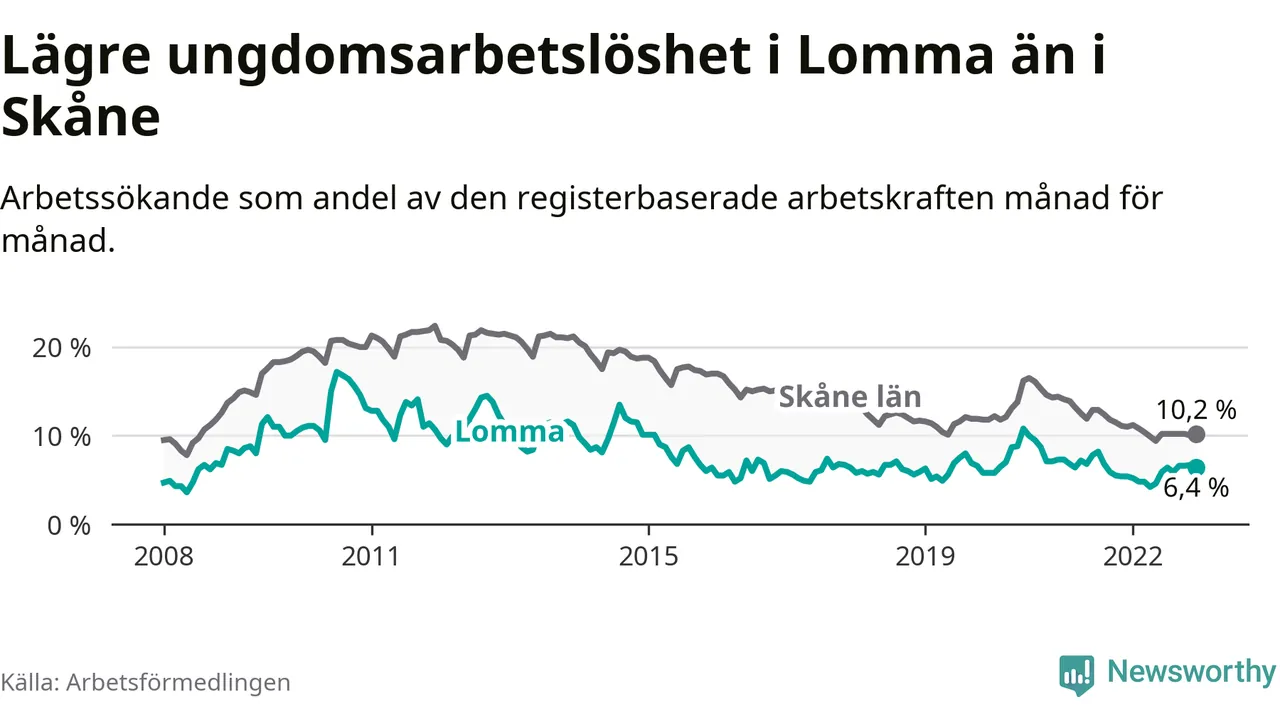 Graf: Arbetslöshet bland unga i Lomma kommun och Skåne län