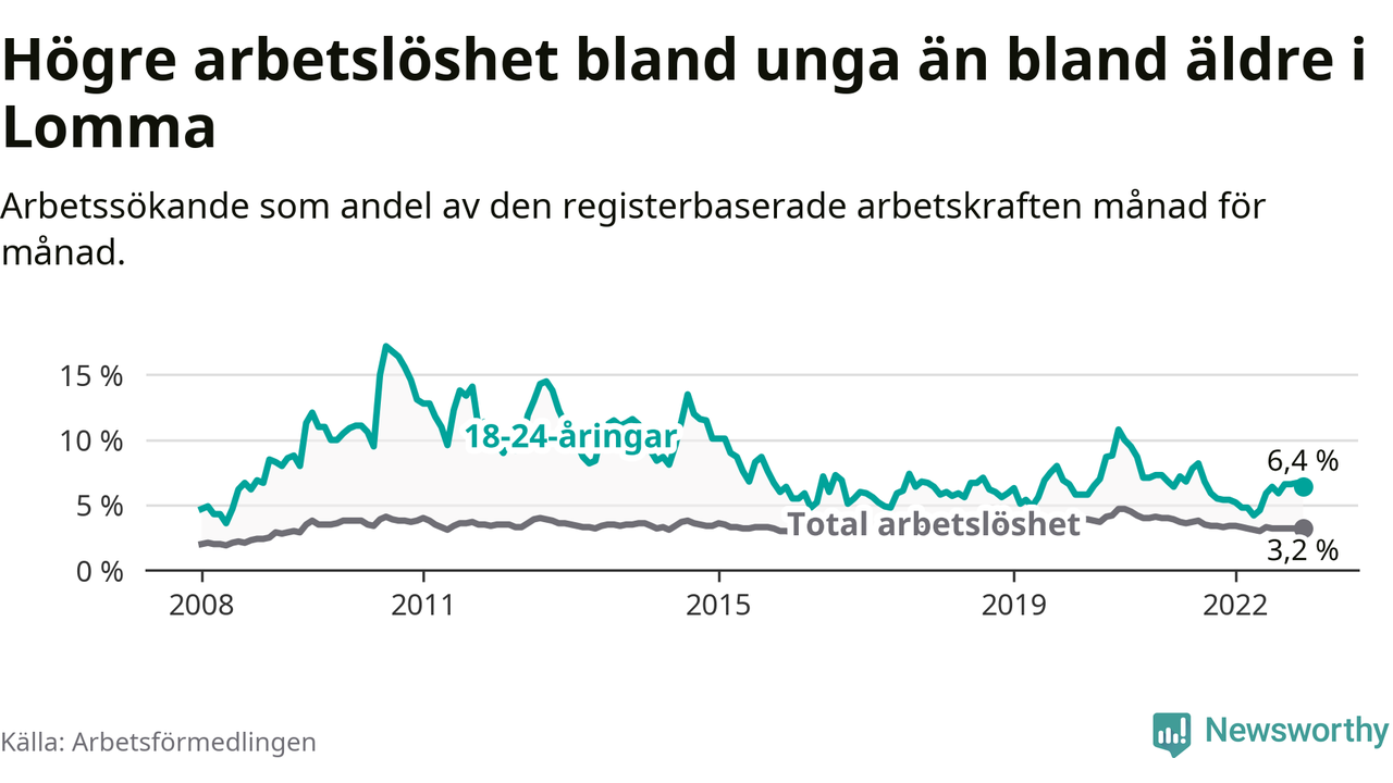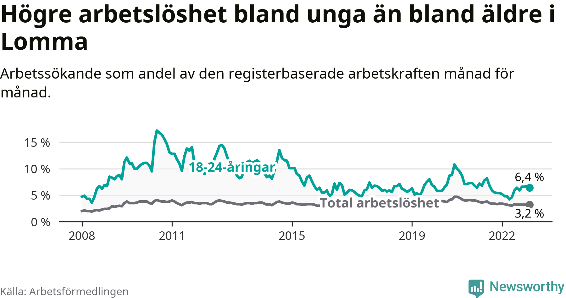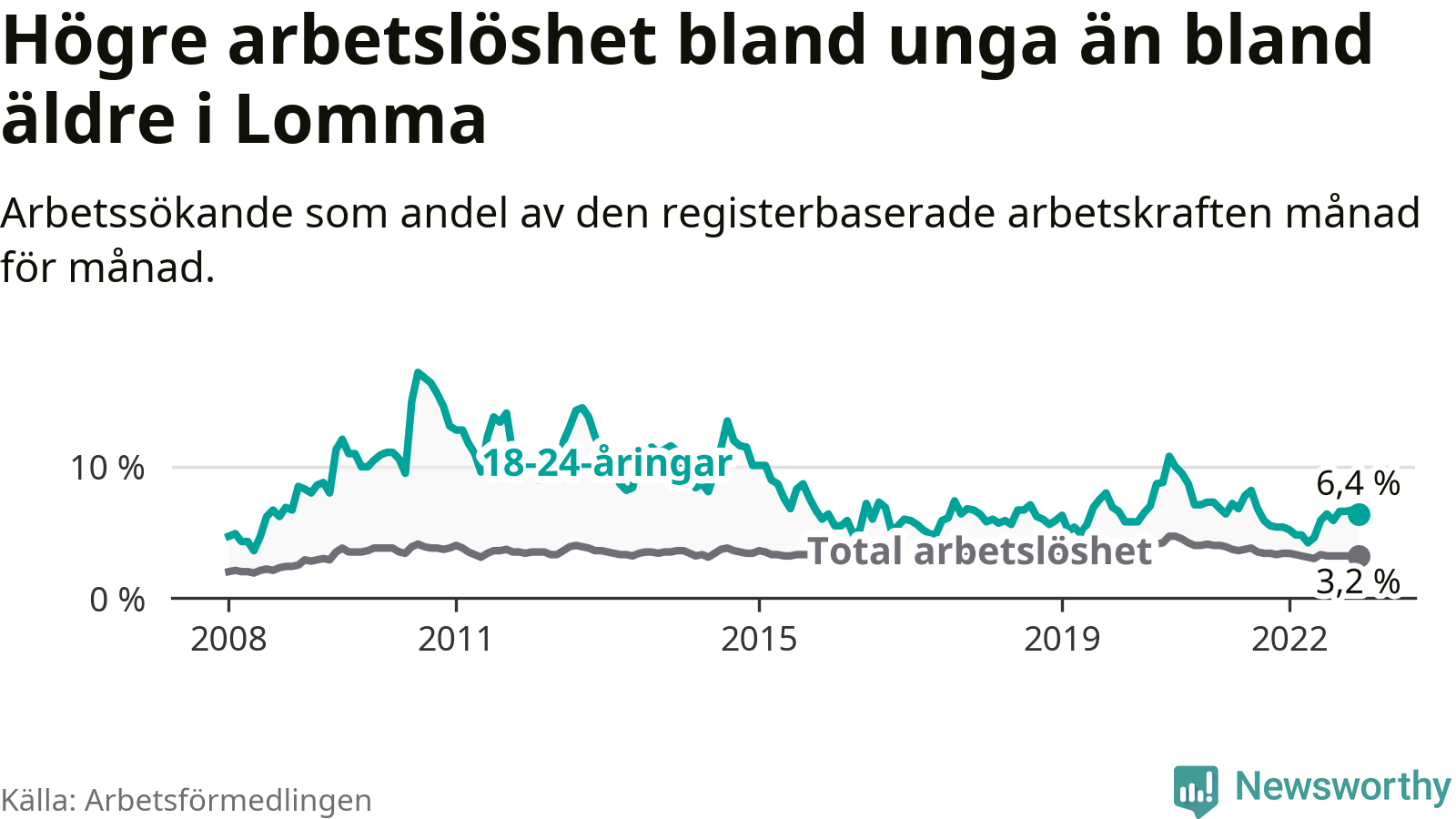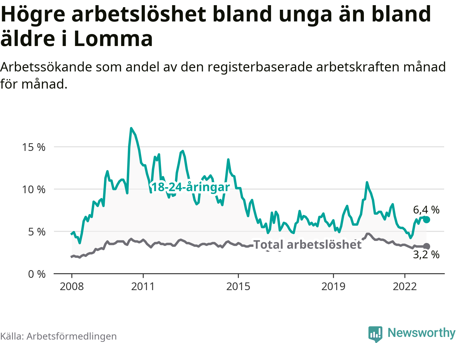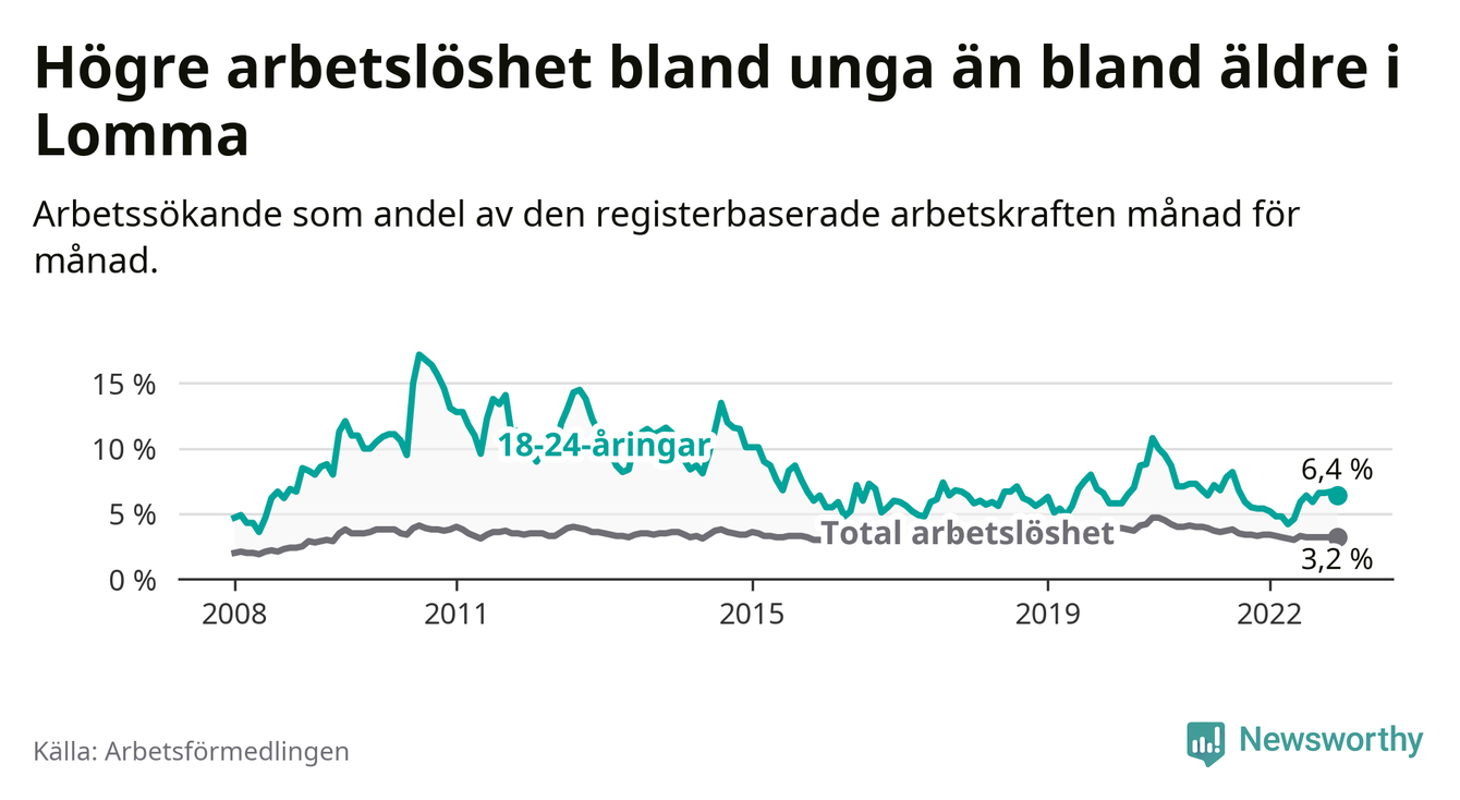 Graf: Arbetslöshet bland unga i Lomma kommun och Skåne län