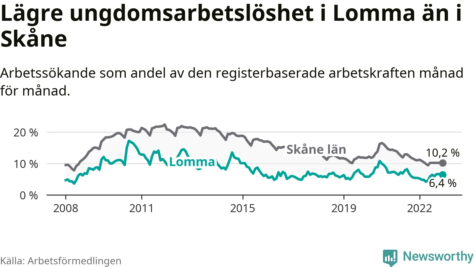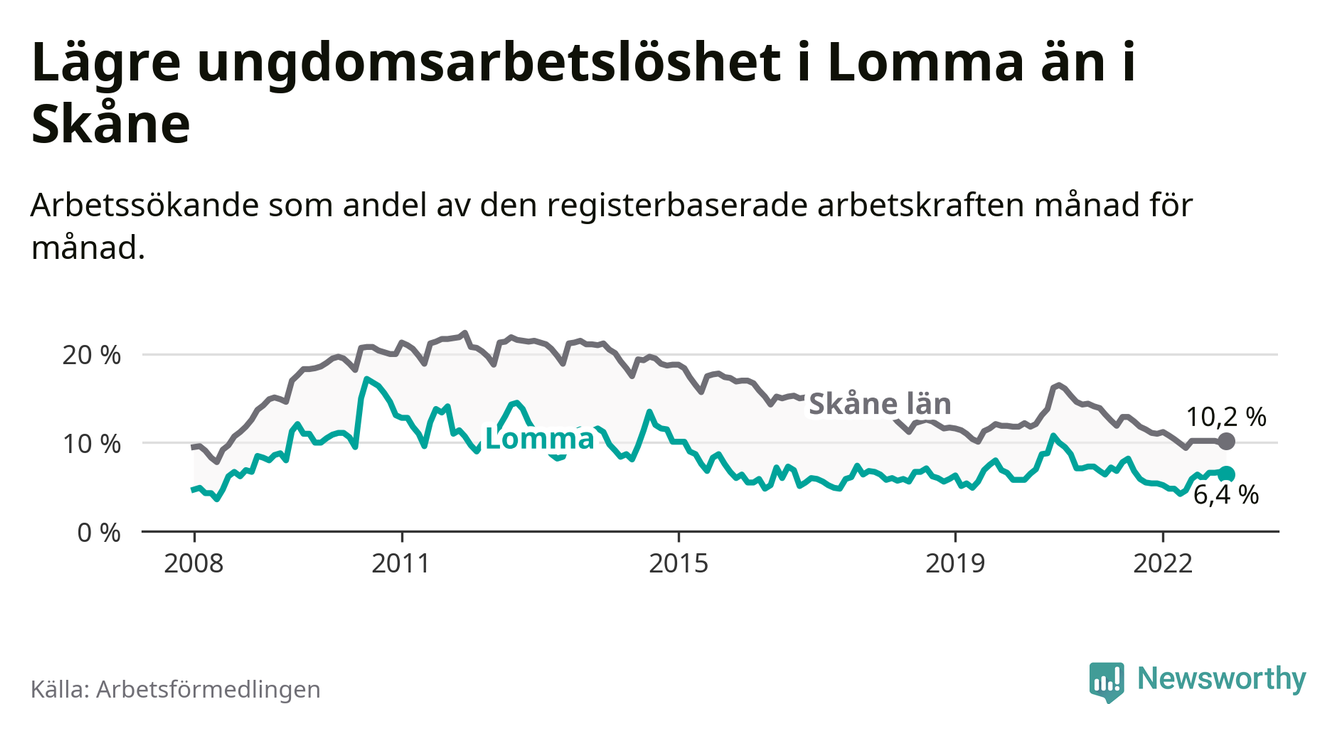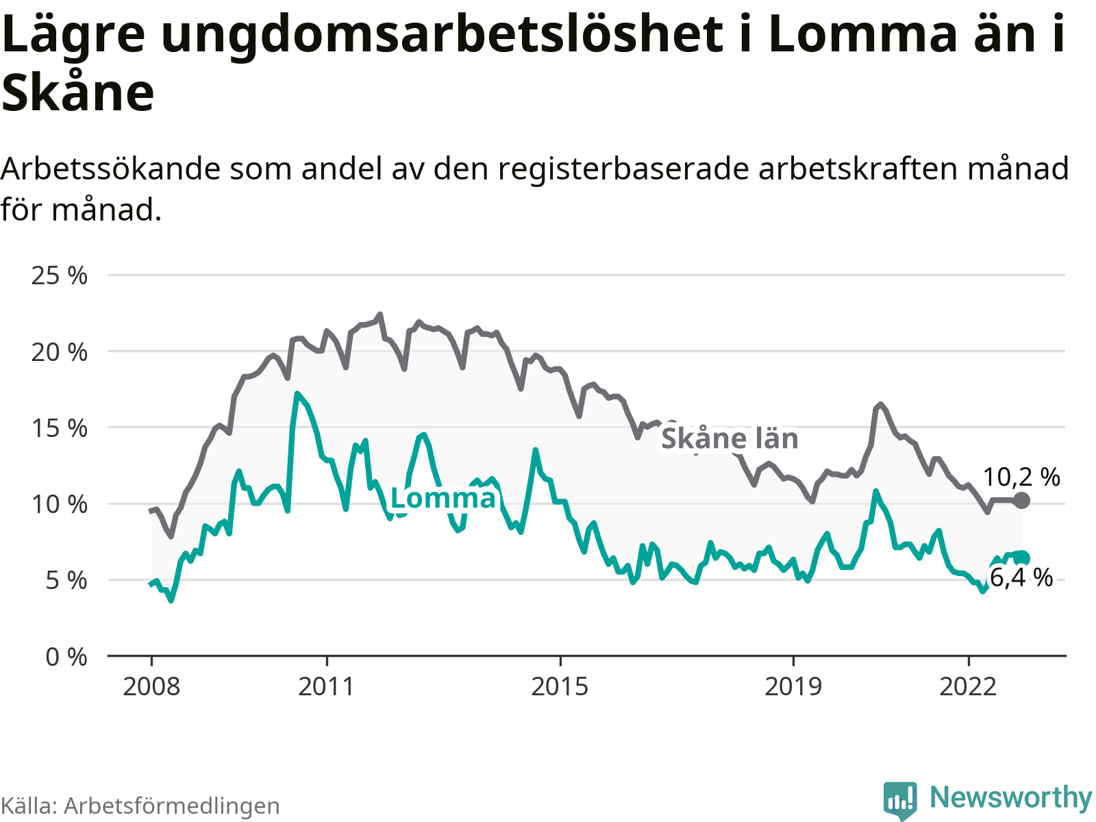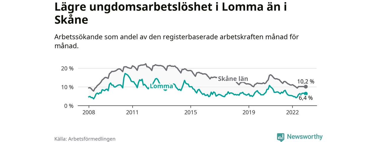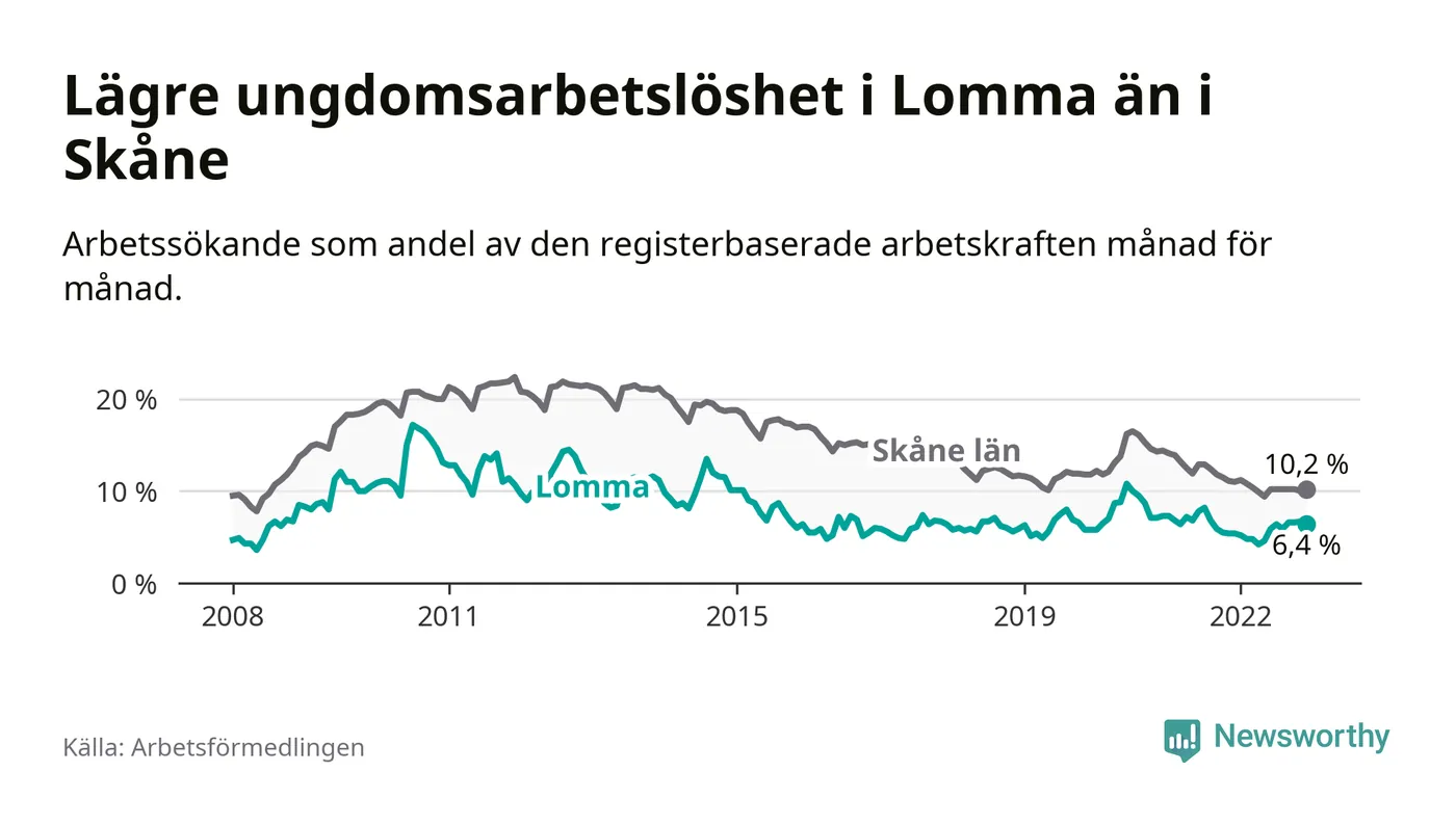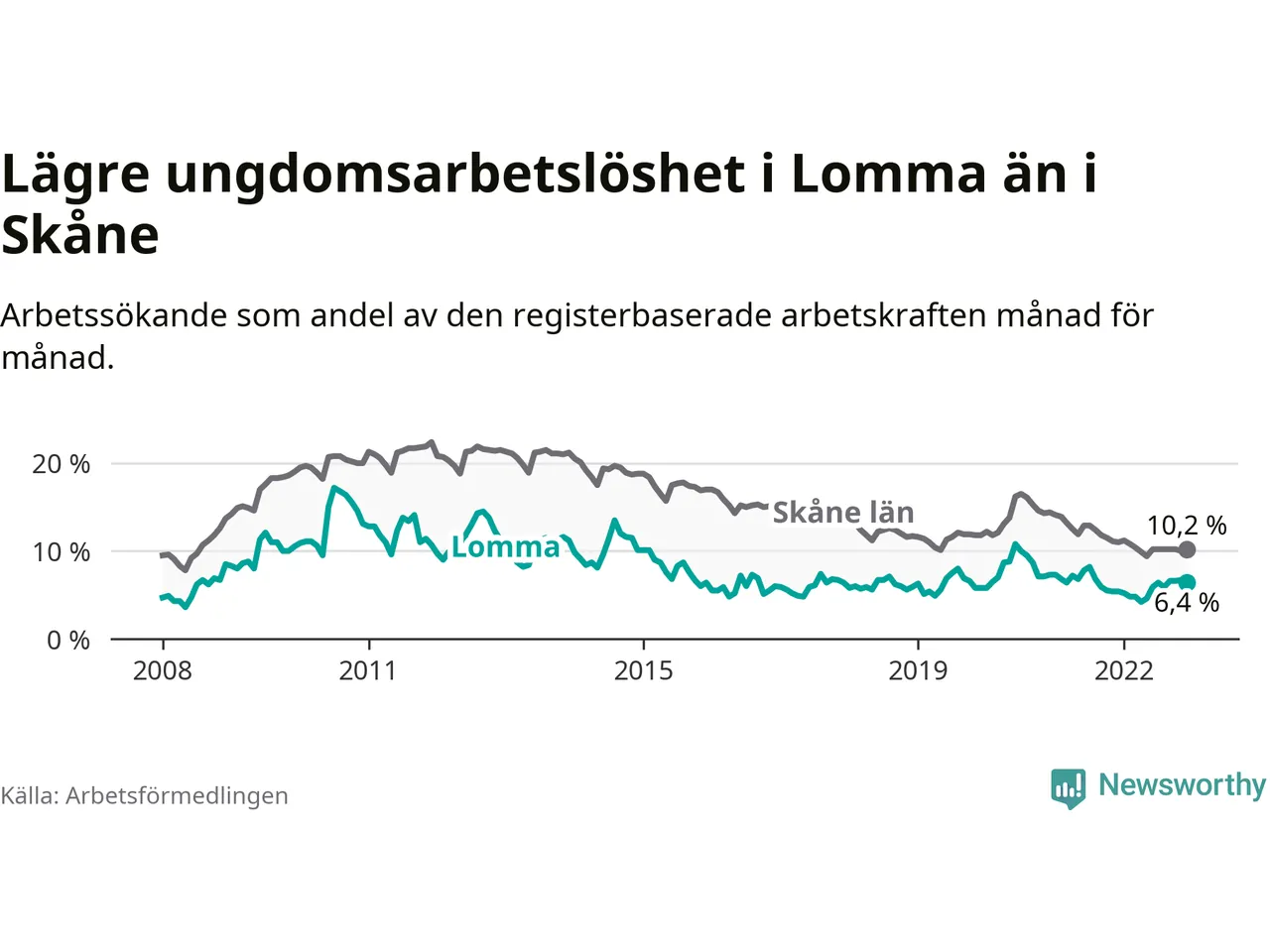Precis som den totala arbetslösheten ligger ungdomsarbetslösheten i Lomma lägre än i Skåne som helhet. Skillnaden mellan kommunen och länet är 3,8 procentenheter.