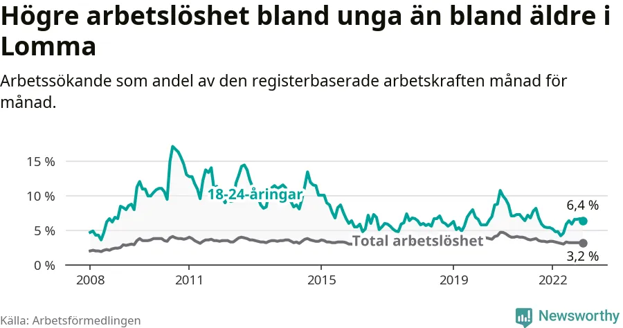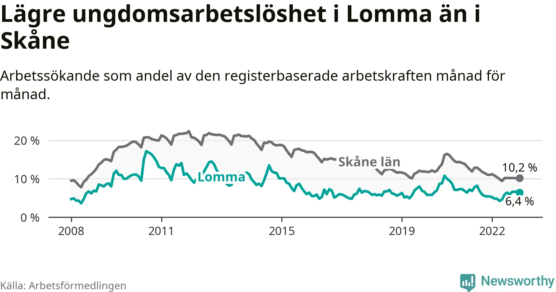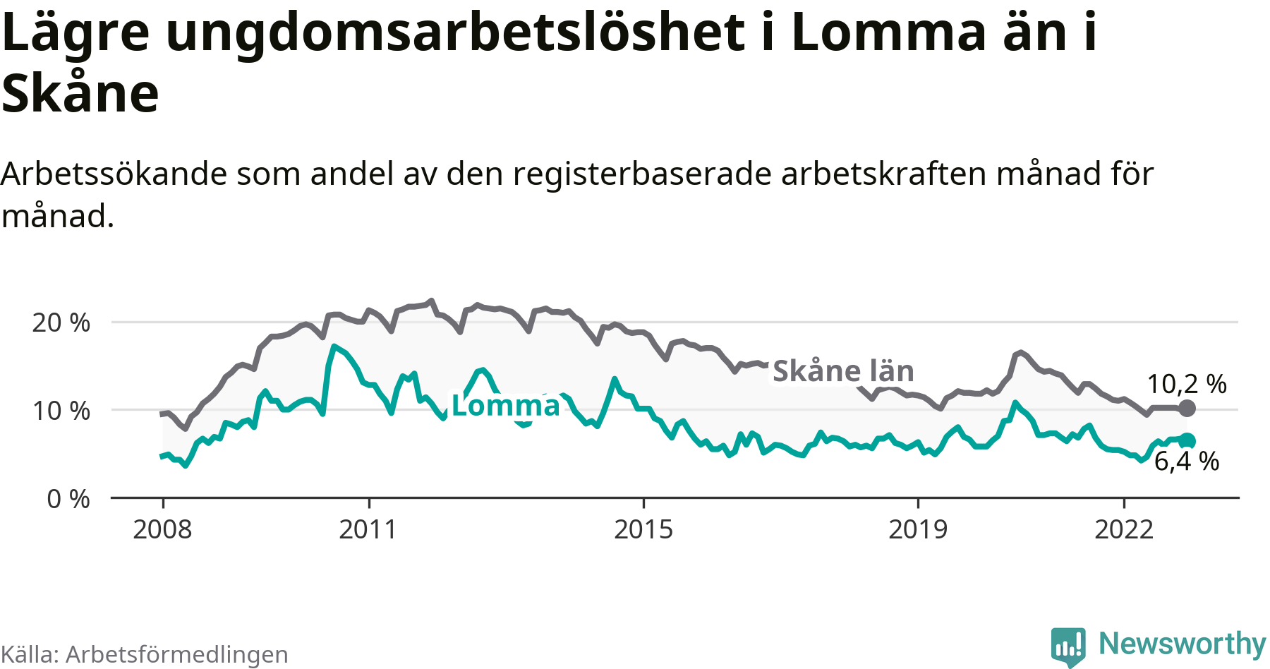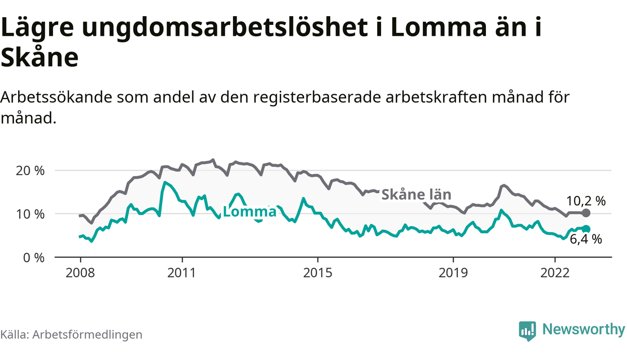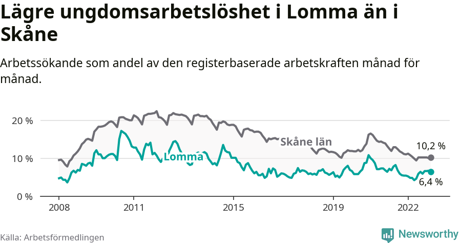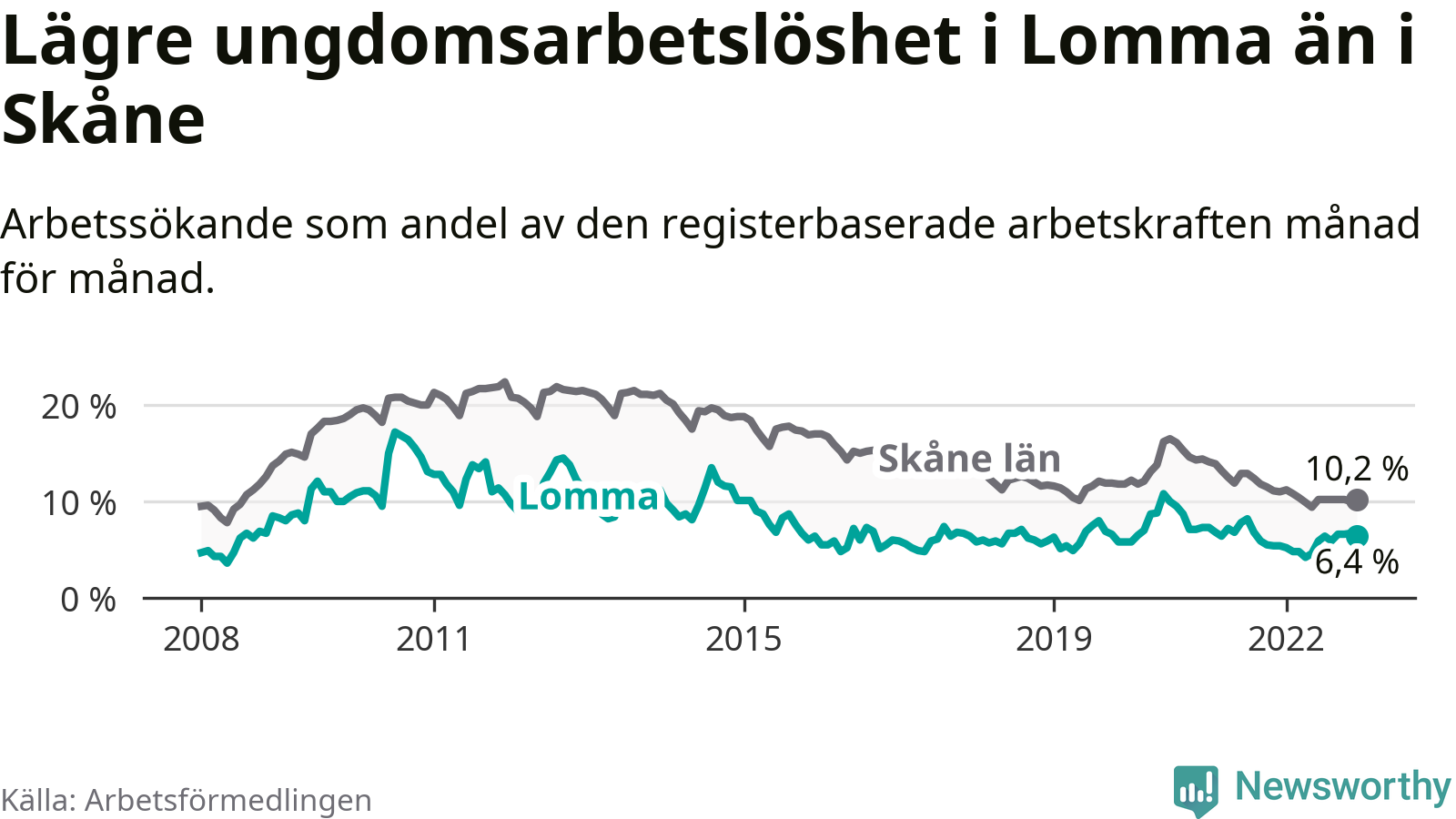 Precis som den totala arbetslösheten ligger ungdomsarbetslösheten i Lomma lägre än i Skåne som helhet. Skillnaden mellan kommunen och länet är 3,8 procentenheter.