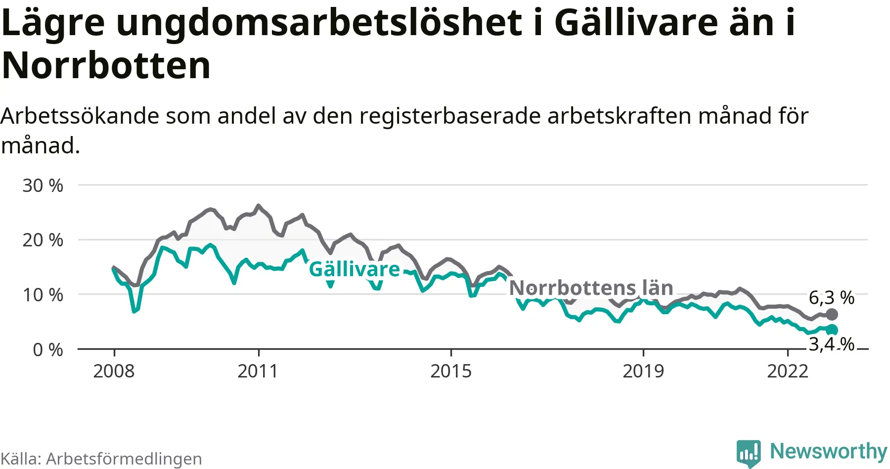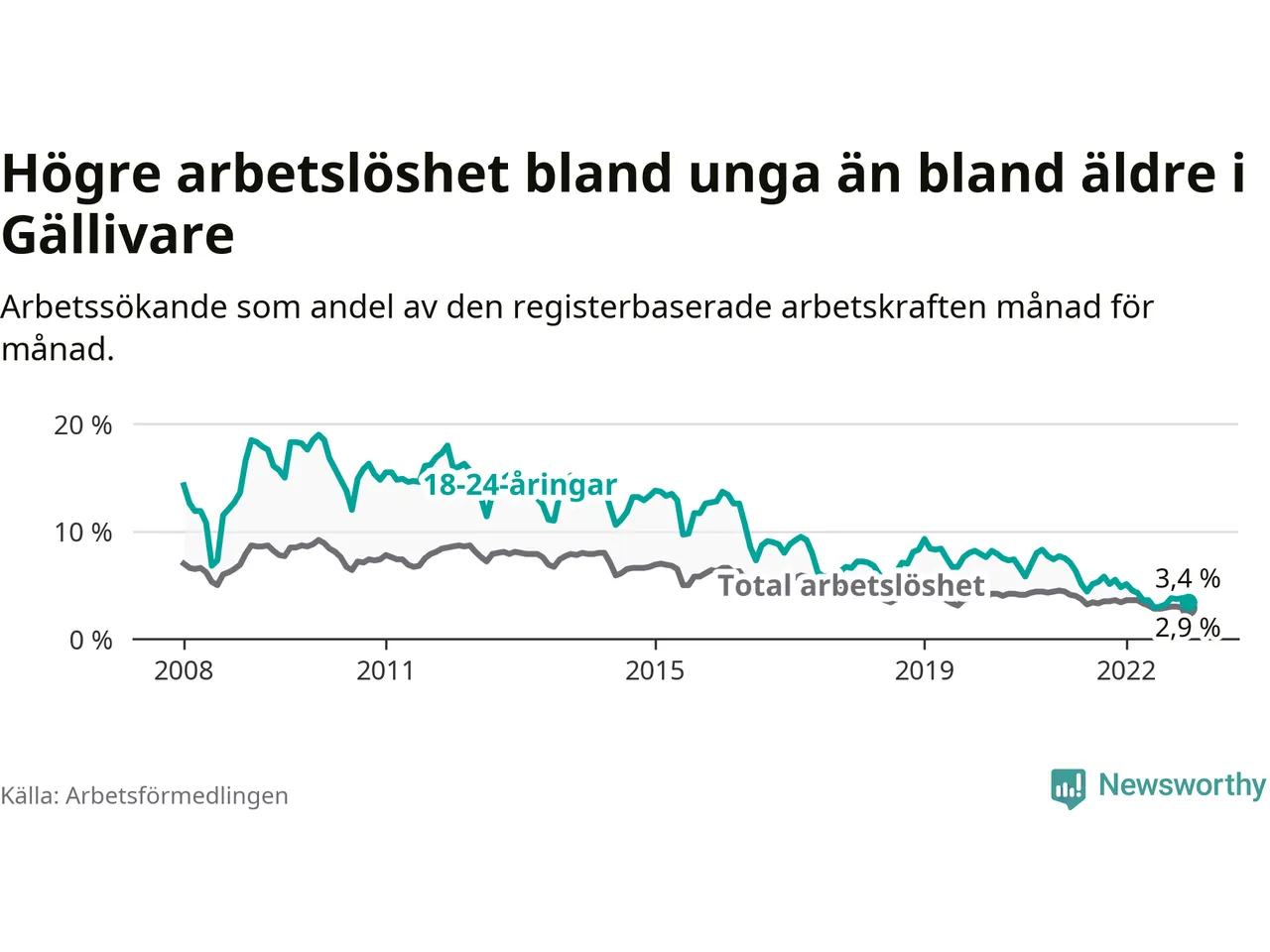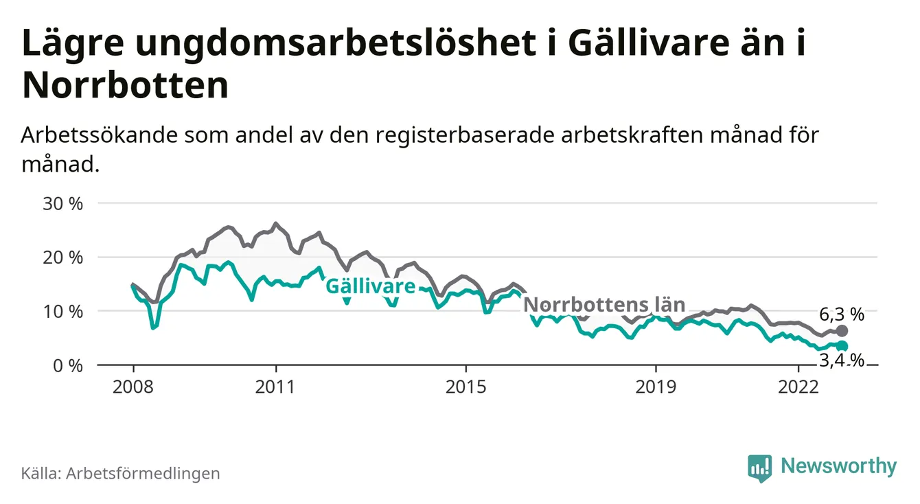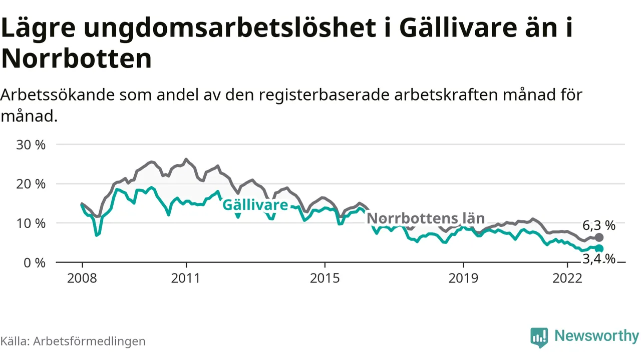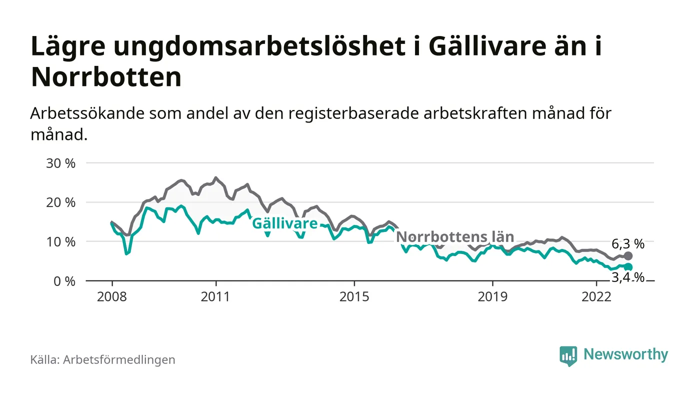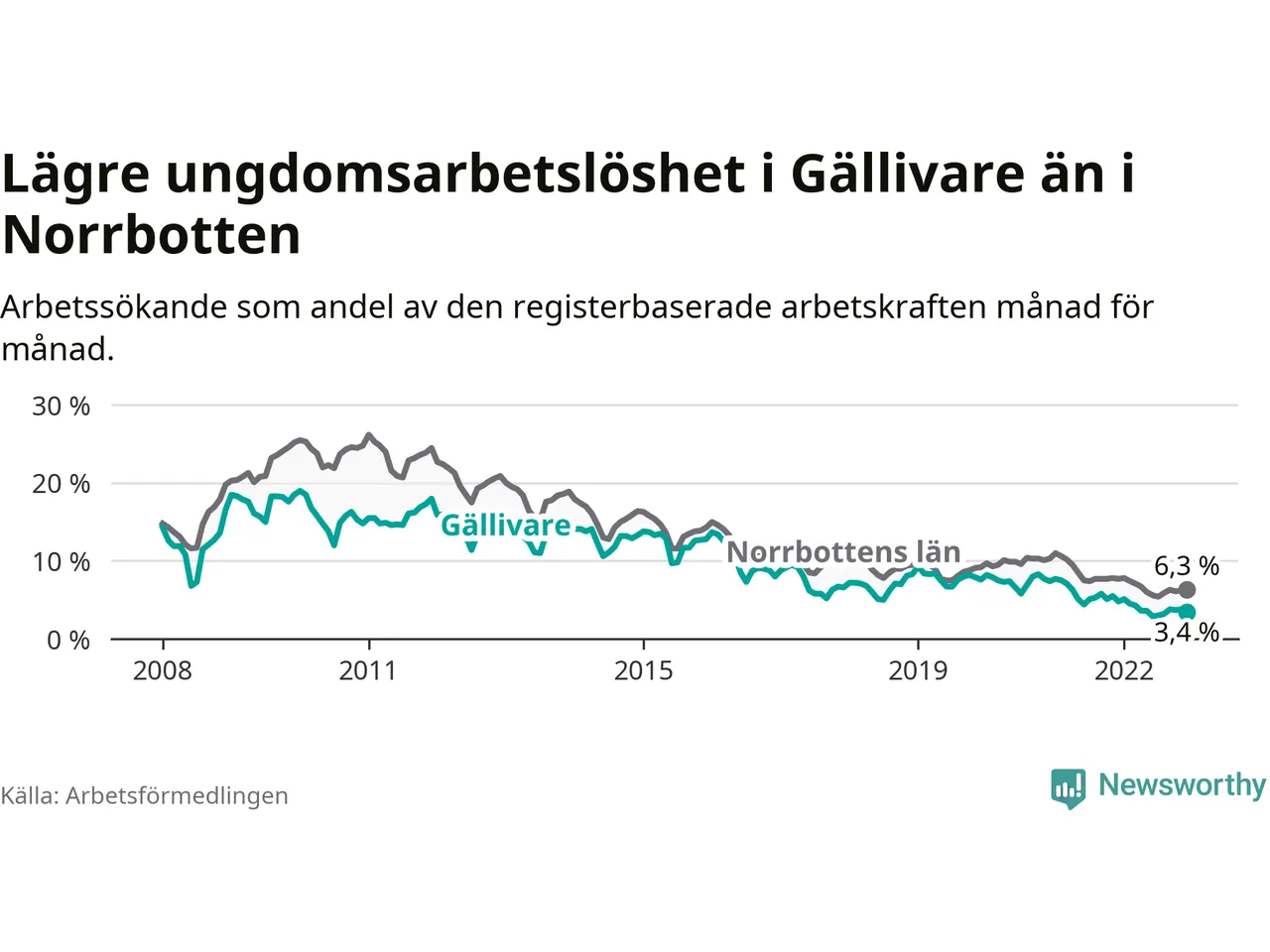 Precis som den totala arbetslösheten ligger ungdomsarbetslösheten i Gällivare lägre än i Norrbotten som helhet. Skillnaden mellan kommunen och länet är 2,9 procentenheter.