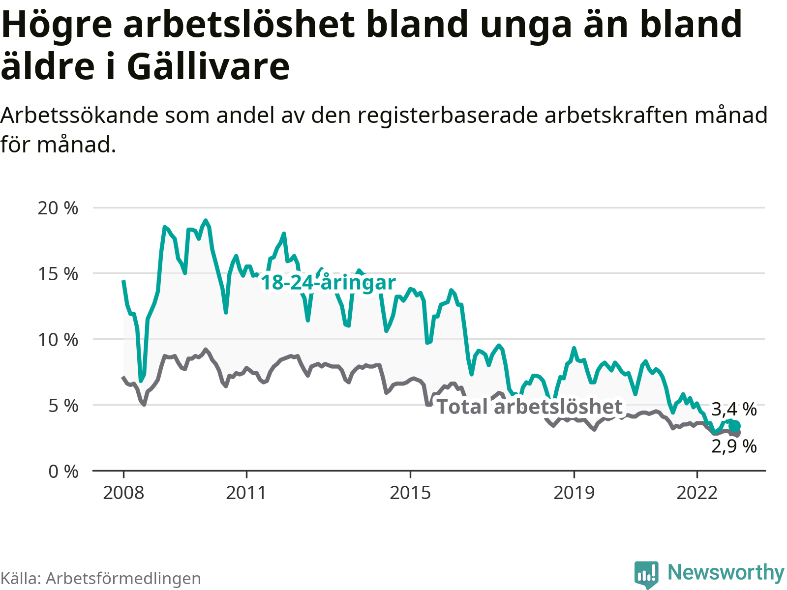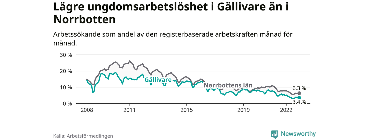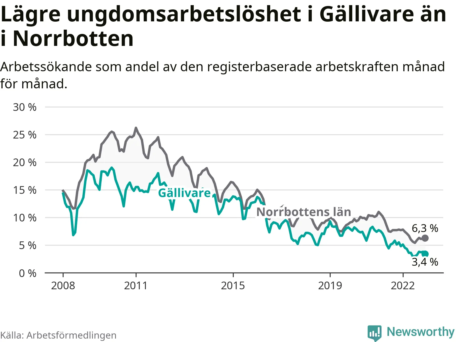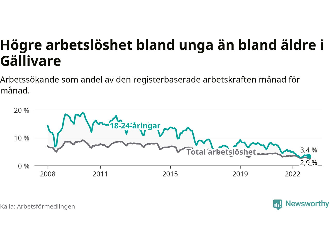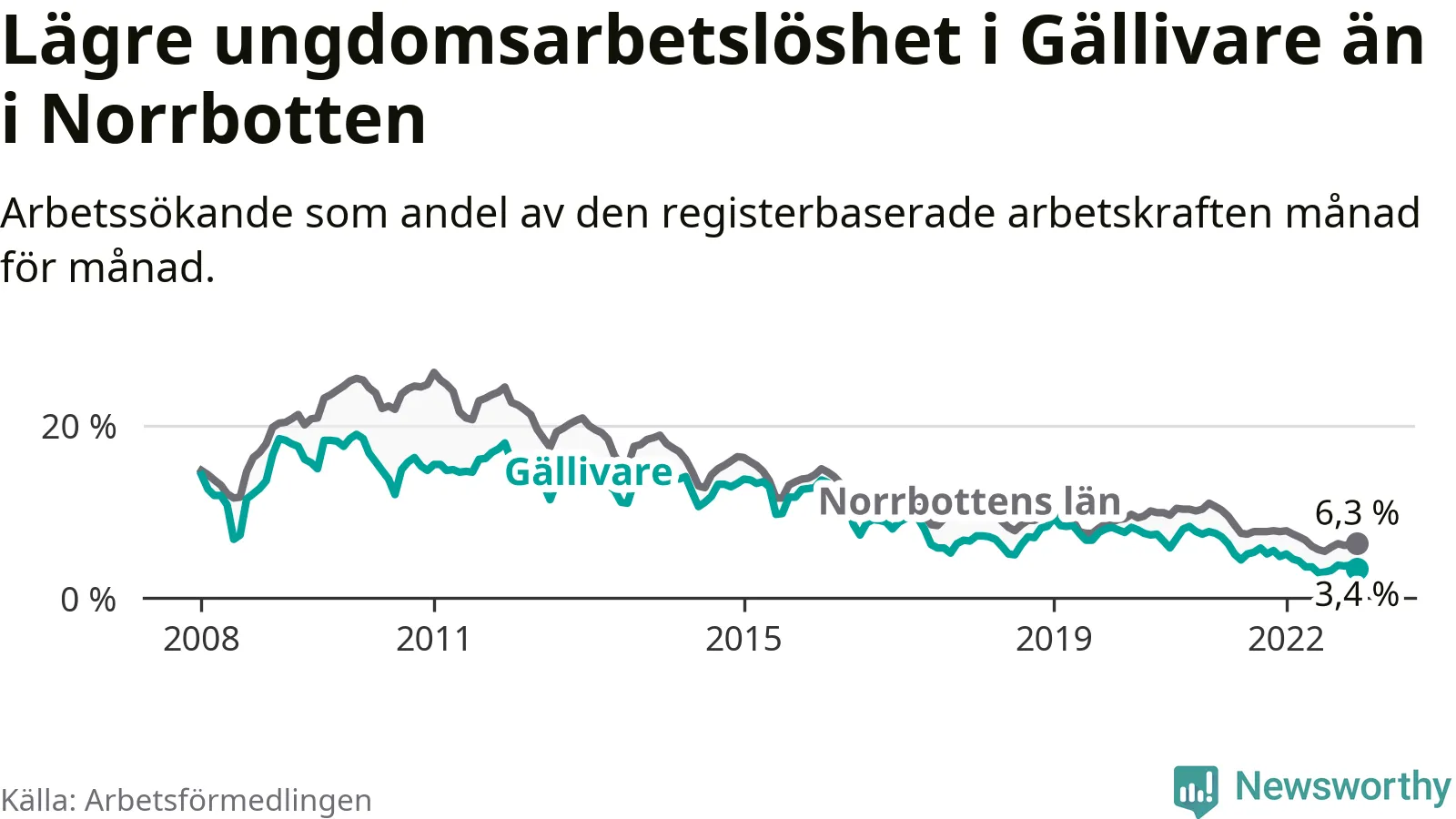 Precis som den totala arbetslösheten ligger ungdomsarbetslösheten i Gällivare lägre än i Norrbotten som helhet. Skillnaden mellan kommunen och länet är 2,9 procentenheter.