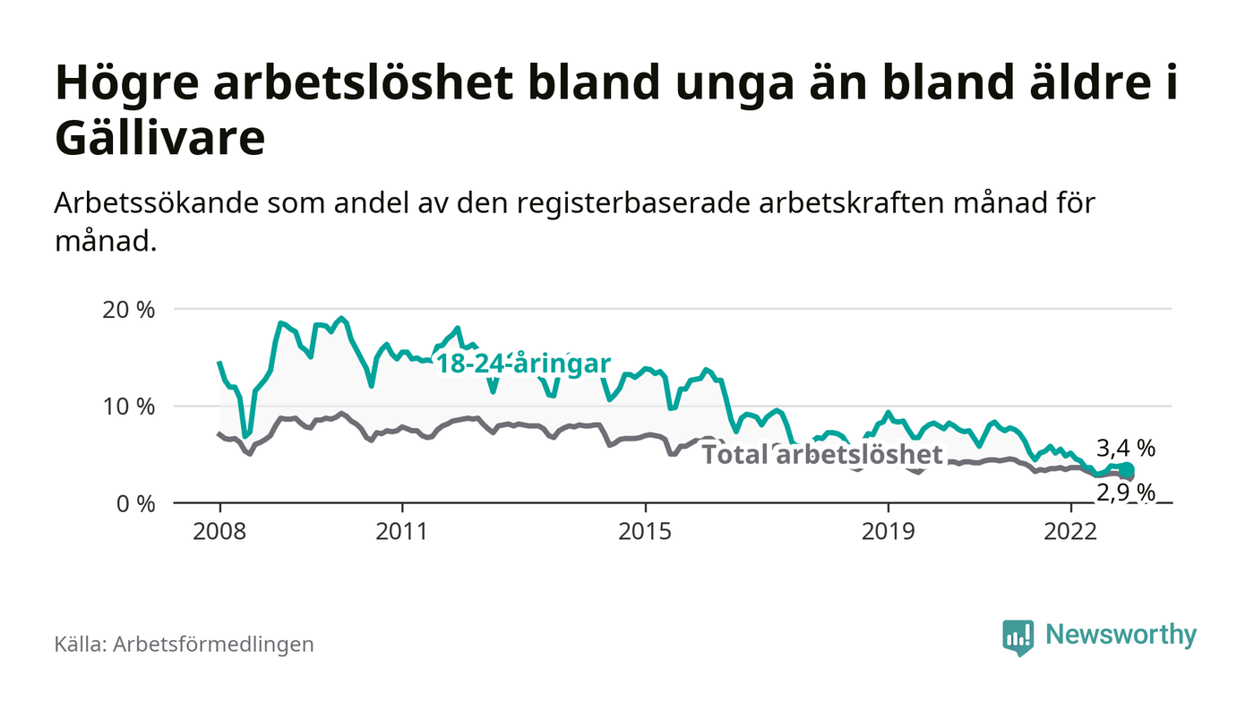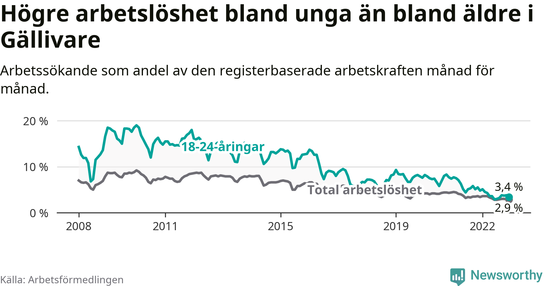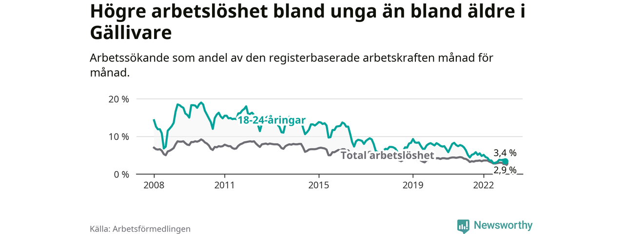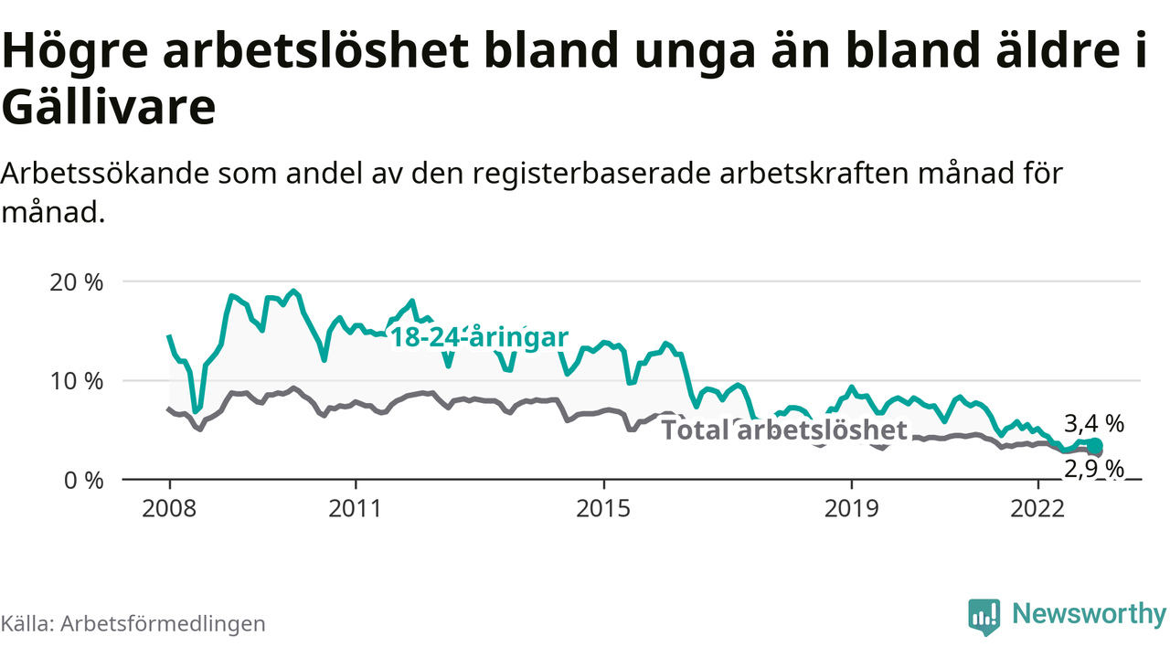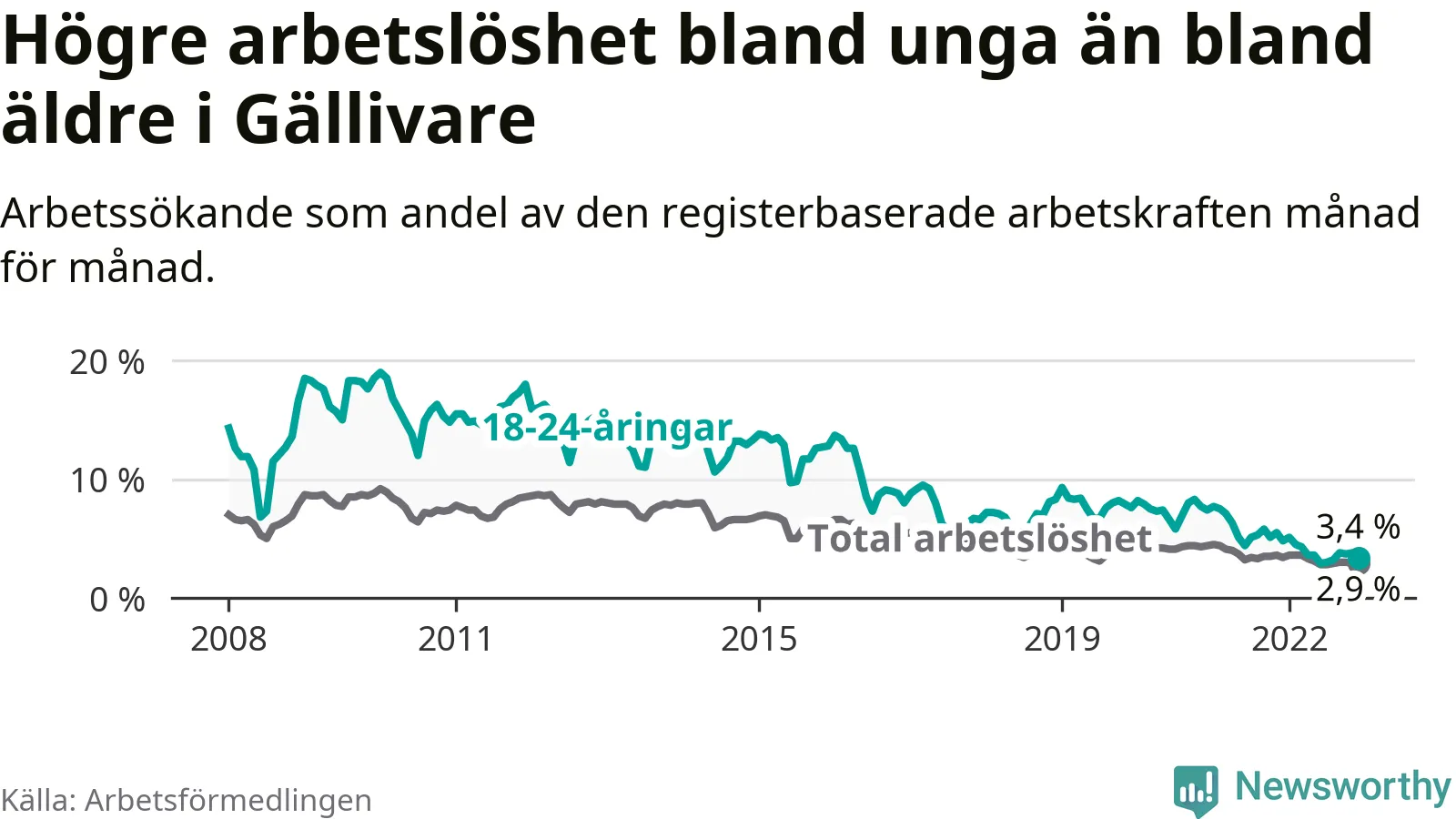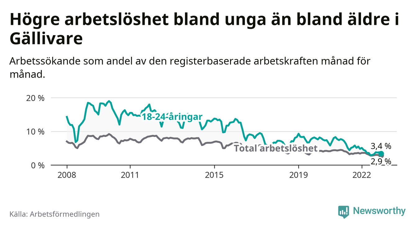 Precis som den totala arbetslösheten ligger ungdomsarbetslösheten i Gällivare lägre än i Norrbotten som helhet. Skillnaden mellan kommunen och länet är 2,9 procentenheter.