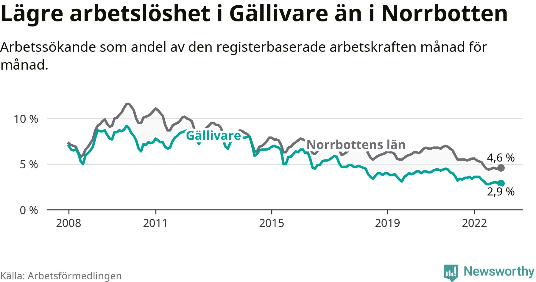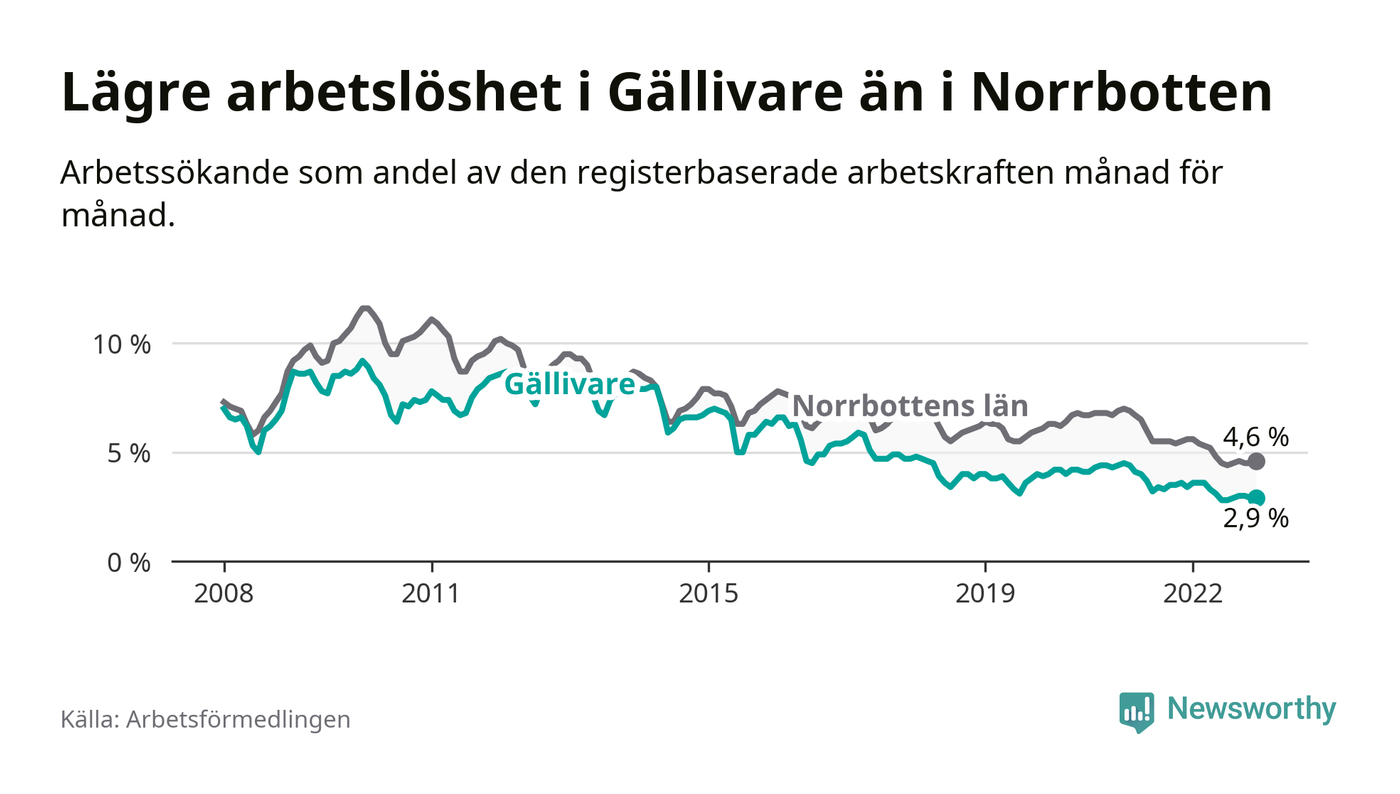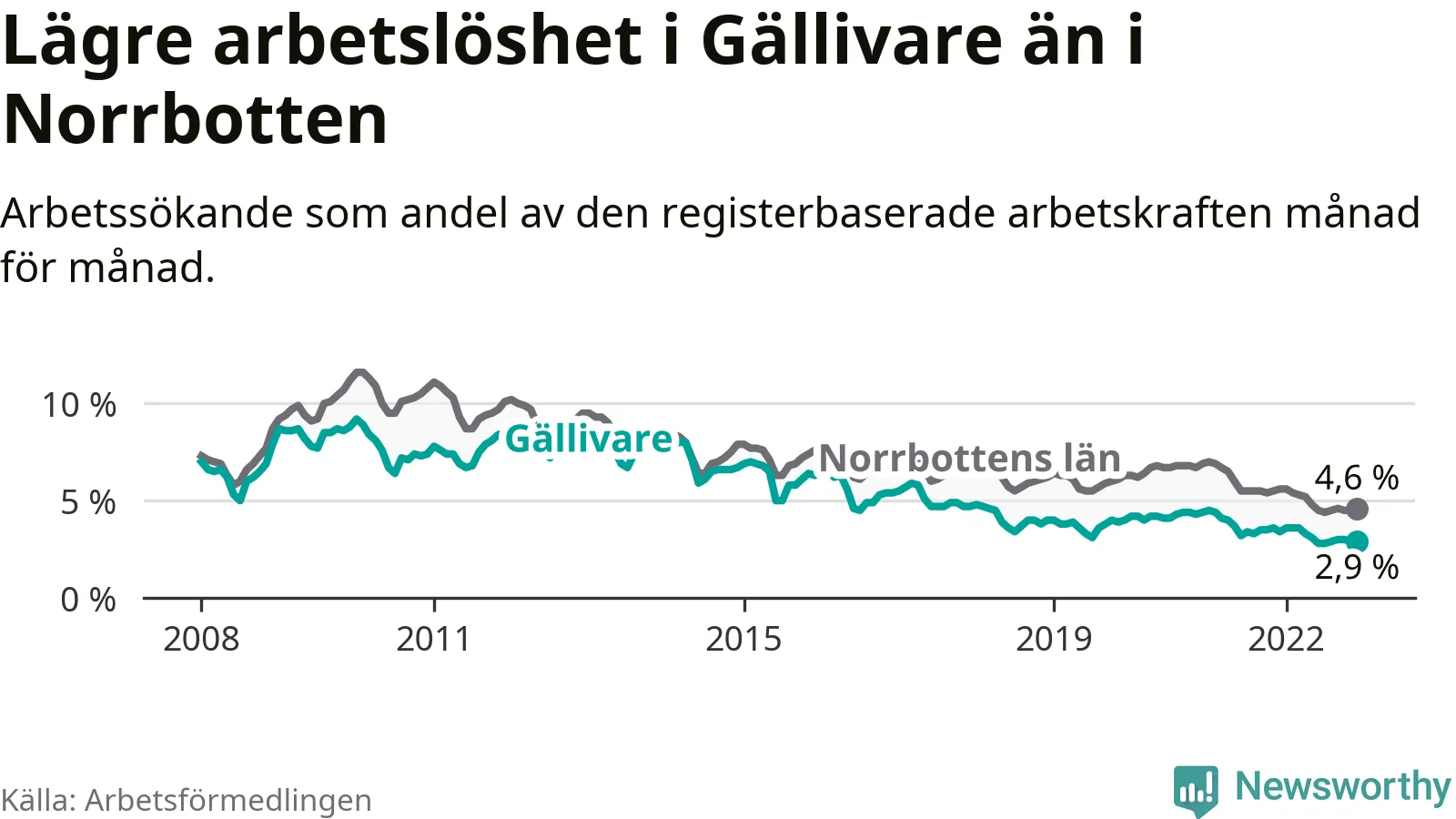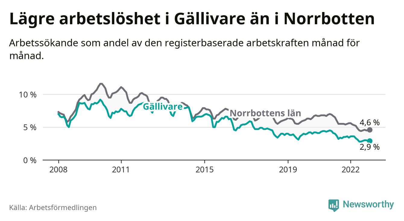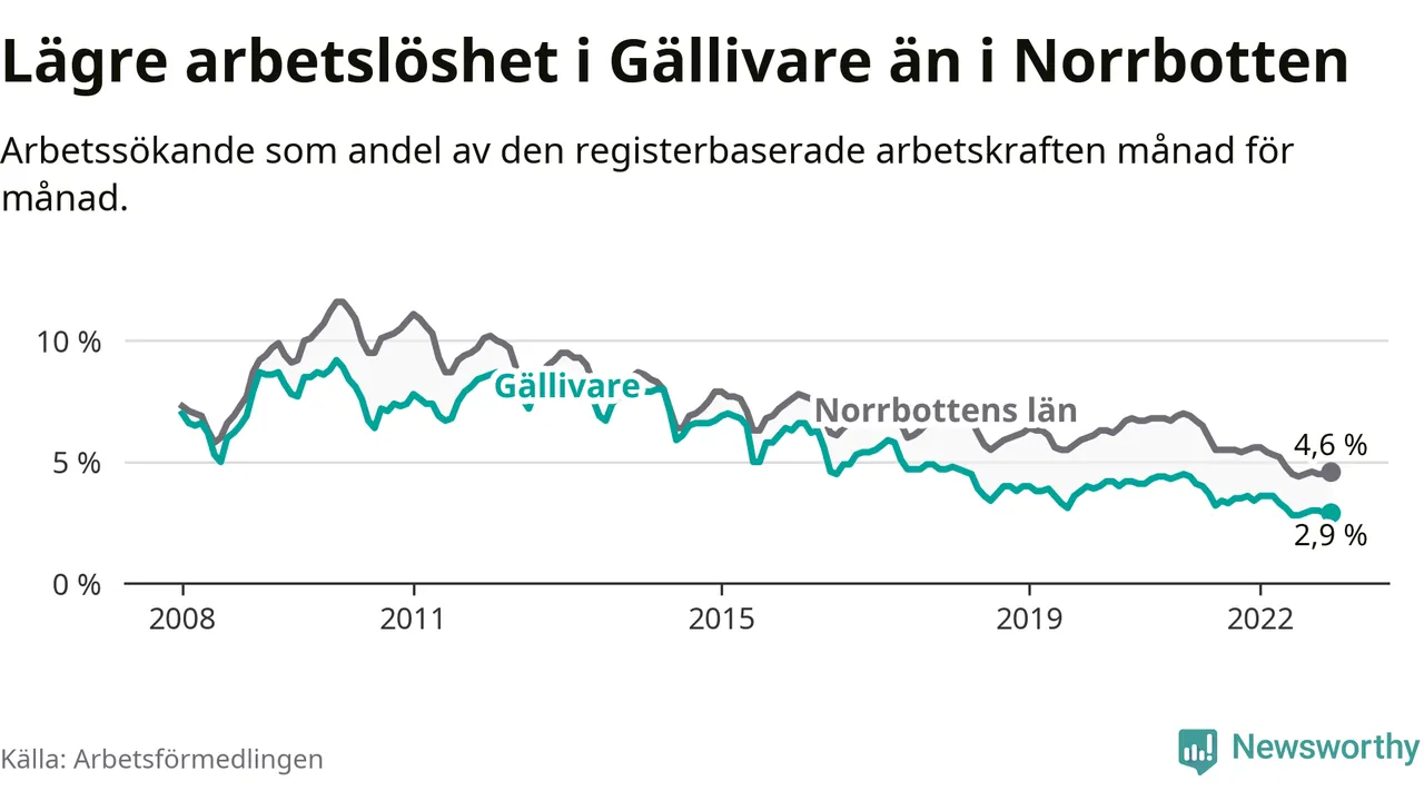 Perstorp är den kommun som har högst arbetslöshet just nu (13,2 procent) i landet som helhet, medan Kiruna, Kungsbacka, Tjörn och Öckerö har den lägsta (2,6 procent). Gällivares arbetslöshet sticker ut som den femte lägsta i hela landet.