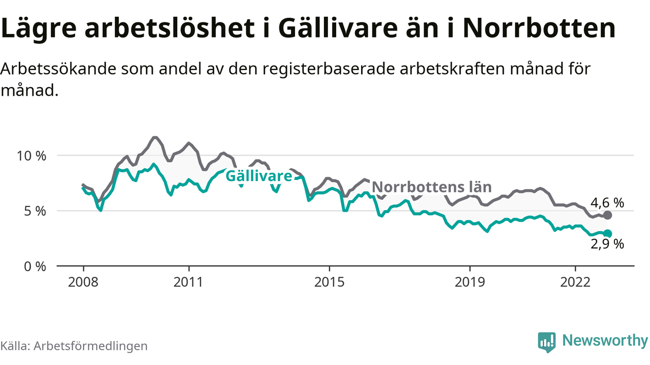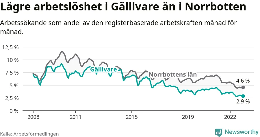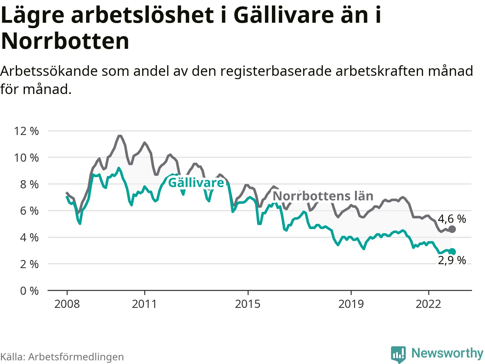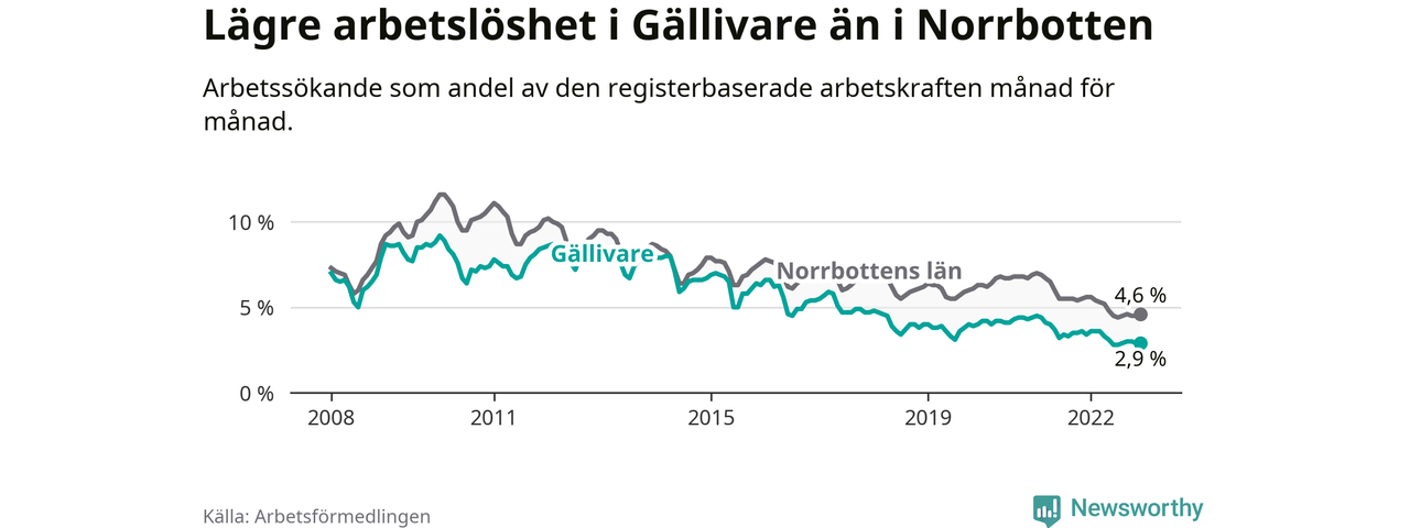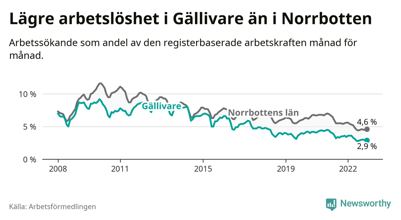 Det är 21:a månaden i följd som arbetslösheten i Gällivare är lägre än den var under samma tidpunkt året innan. Sedan mars 2021 har arbetslösheten gått ner från 4,1 till 2,9 procent.