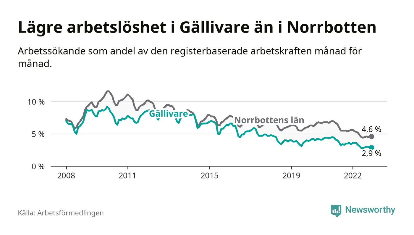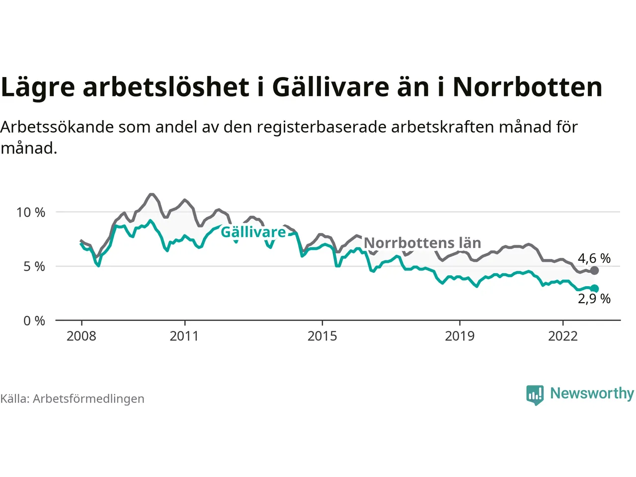 Gällivare hade redan tidigare lägre arbetslöshet än snittet i hela Norrbottens län och nu växer klyftan (2,9 procent i kommunen, jämfört med 4,6 procent i hela länet). Kiruna har den lägsta arbetslösheten i länet (2,6 procent), medan Haparanda har den högsta (8,4 procent). För att Gällivare skulle komma ner i samma arbetslöshetsnivå som Kiruna skulle 26 personer behöva sysselsättas.
