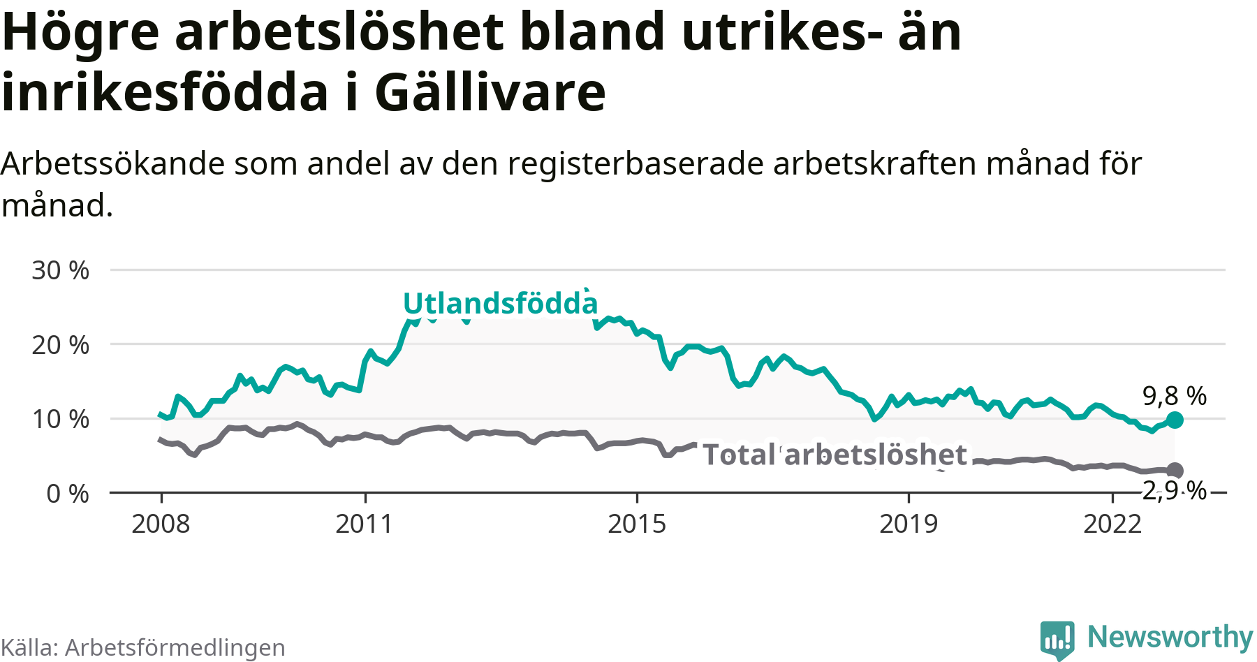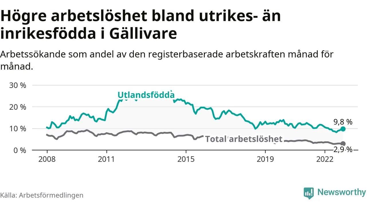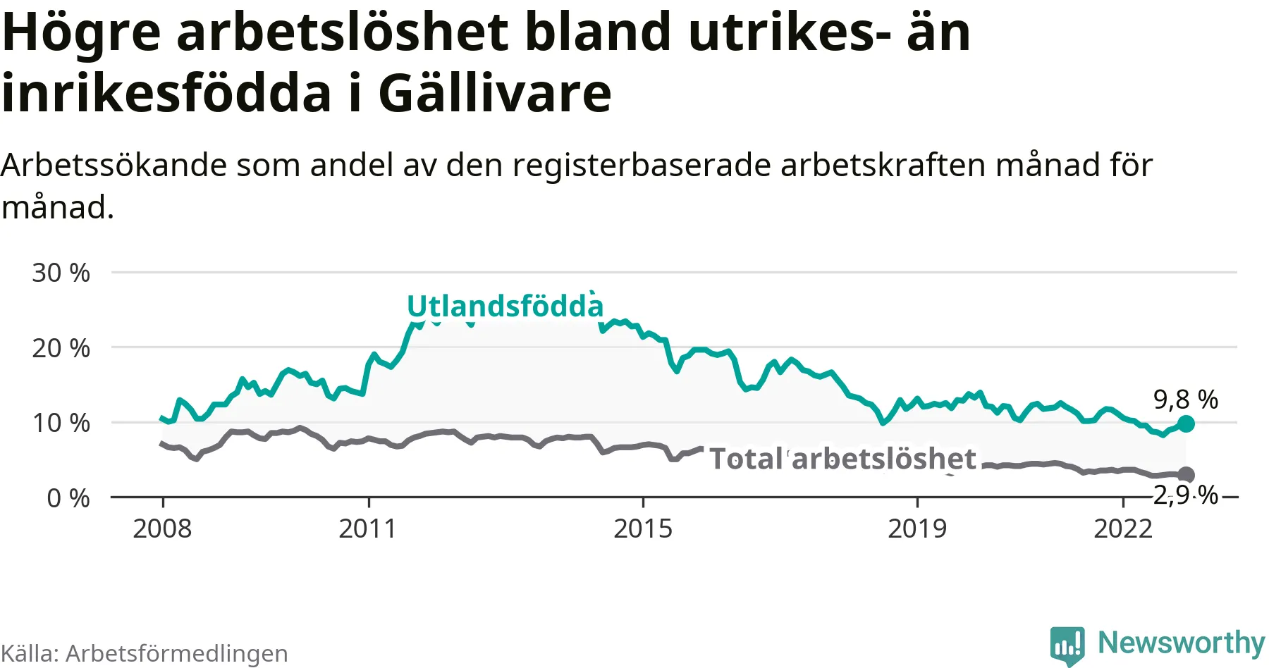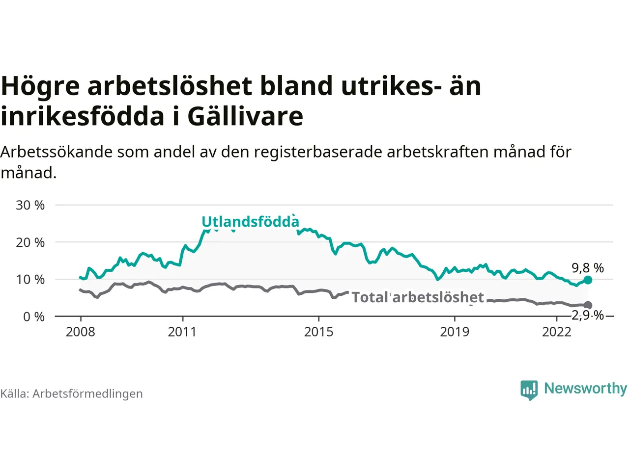 Skillnaden i arbetslöshet mellan utrikesfödda och hela befolkningen är 6,9 procentenheter i Gällivare. Det är en mindre skillnad än för ett år sedan (−0,8 procentenheter).