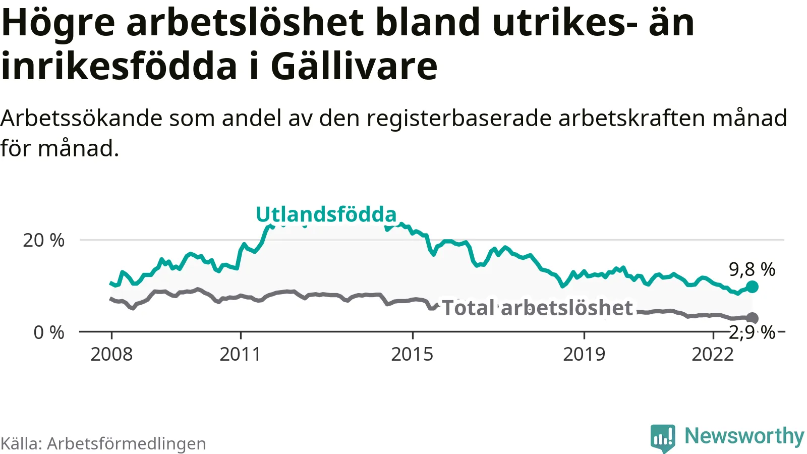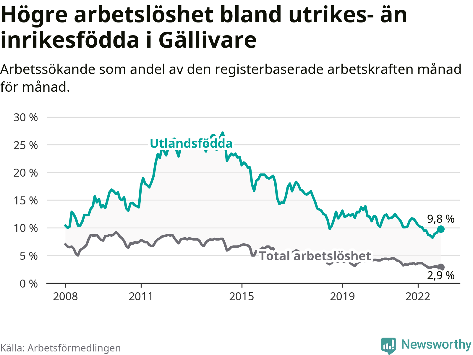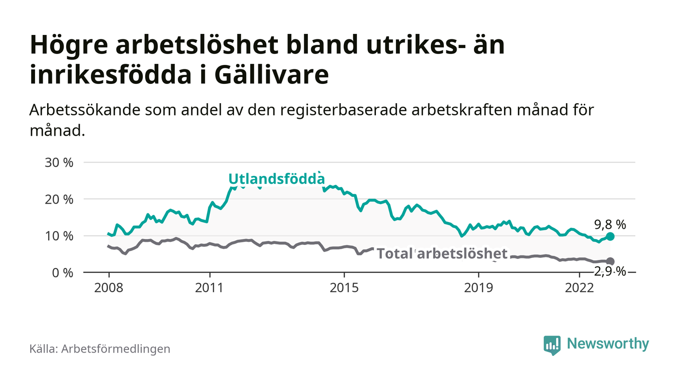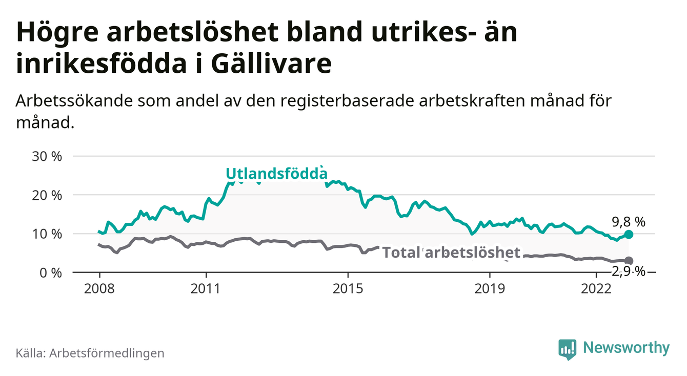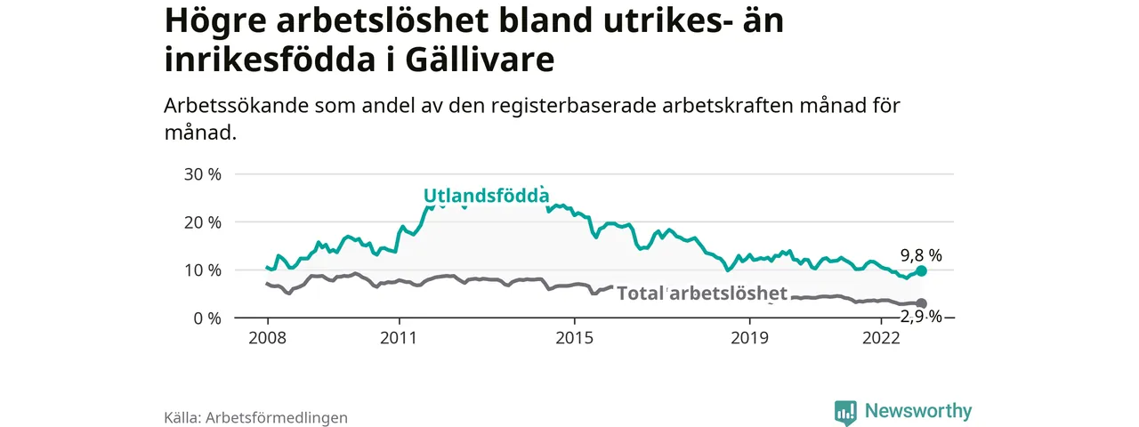 Skillnaden i arbetslöshet mellan utrikesfödda och hela befolkningen är 6,9 procentenheter i Gällivare. Det är en mindre skillnad än för ett år sedan (−0,8 procentenheter).