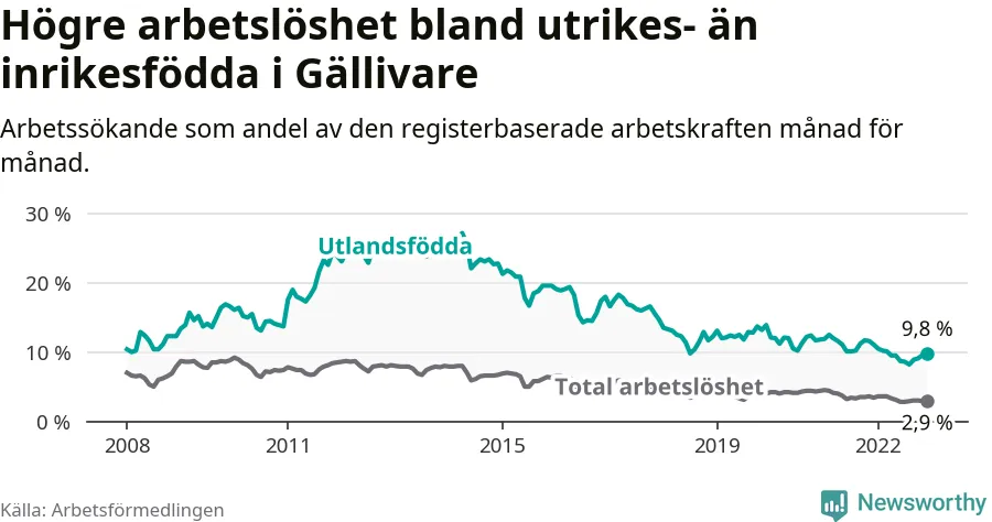 Arbetslösheten bland utlandsfödda var 9,8 procent i Gällivare under december månad, motsvarande 110 av 1 122 personer. Det är 1,3 procentenheter färre än vid samma tidpunkt i fjol (−8 om man räknar personer). Därmed är de utlandsföddas arbetslöshet lägre än vid samma tidpunkt i fjol för 21:a månaden i följd. Sedan mars 2021 har arbetslösheten bland utlandsfödda minskat från 12,0 till 9,8 procent.