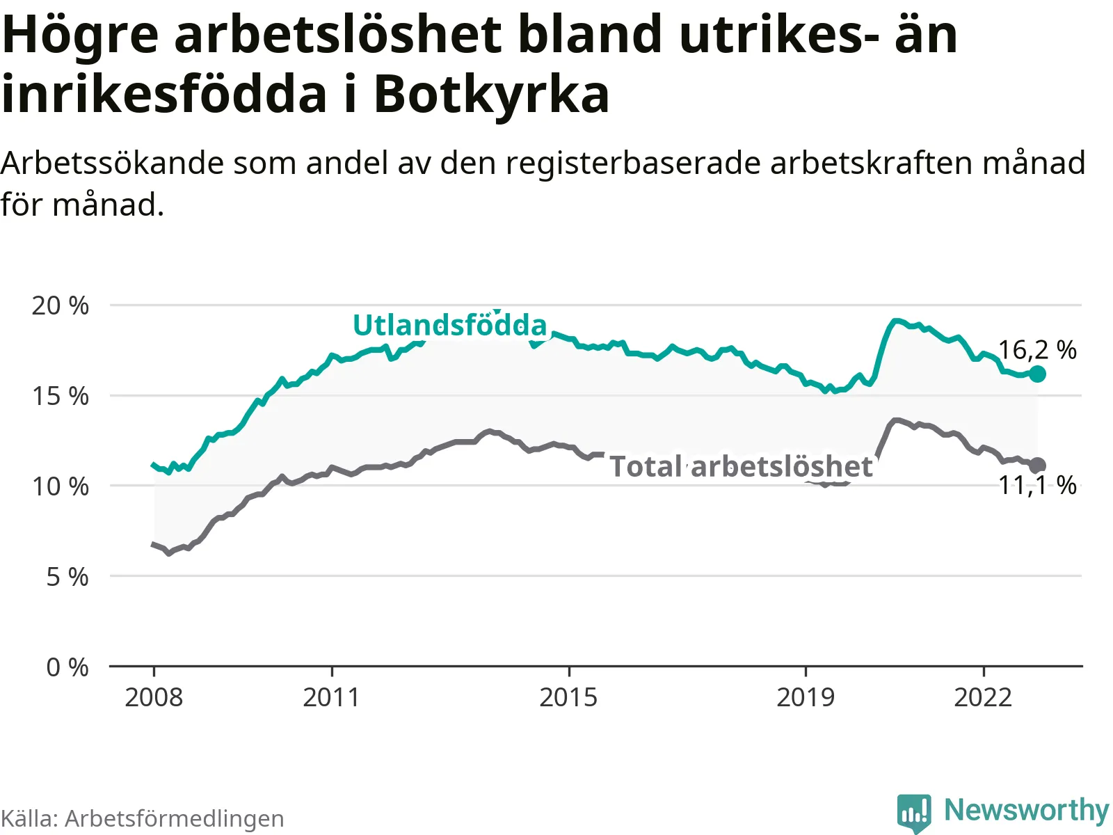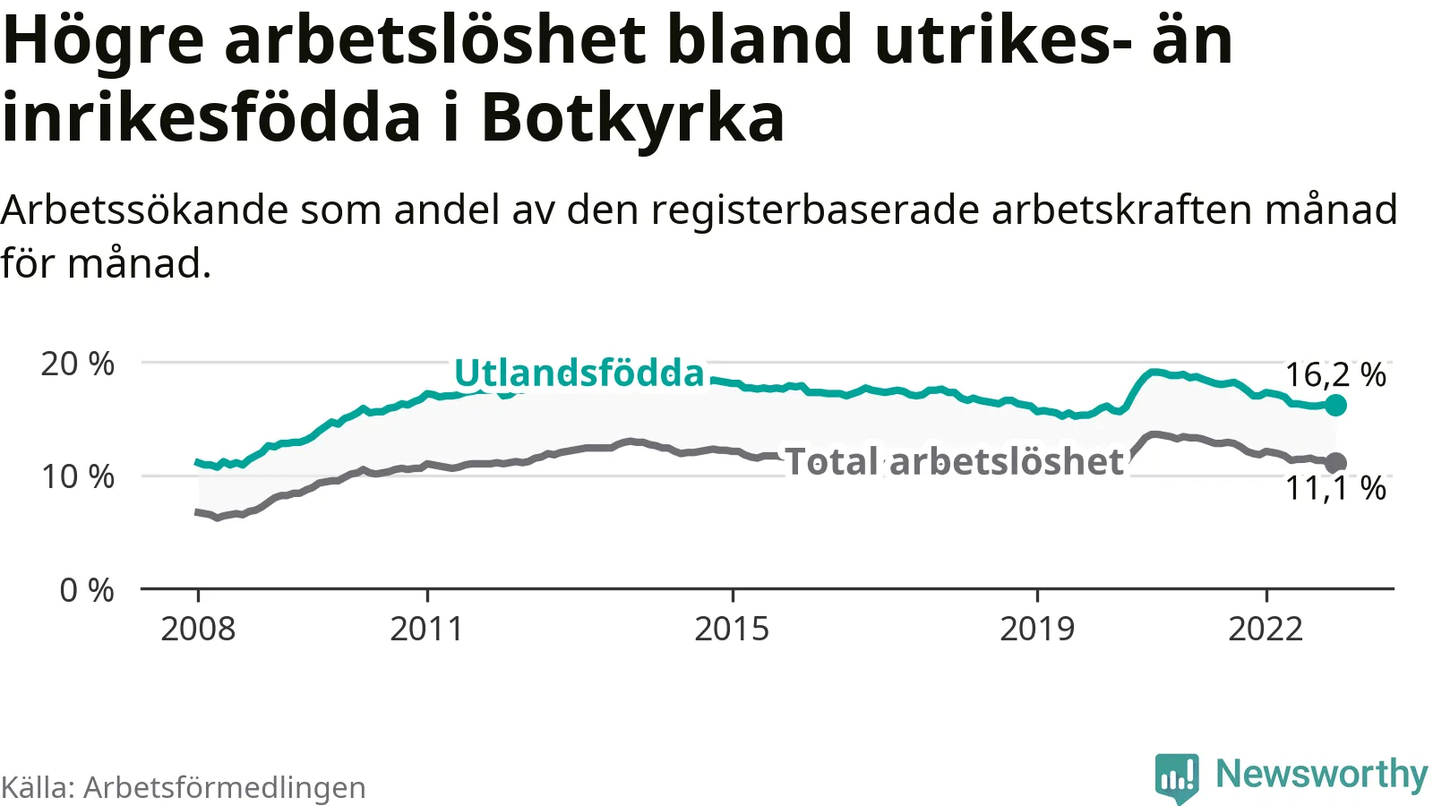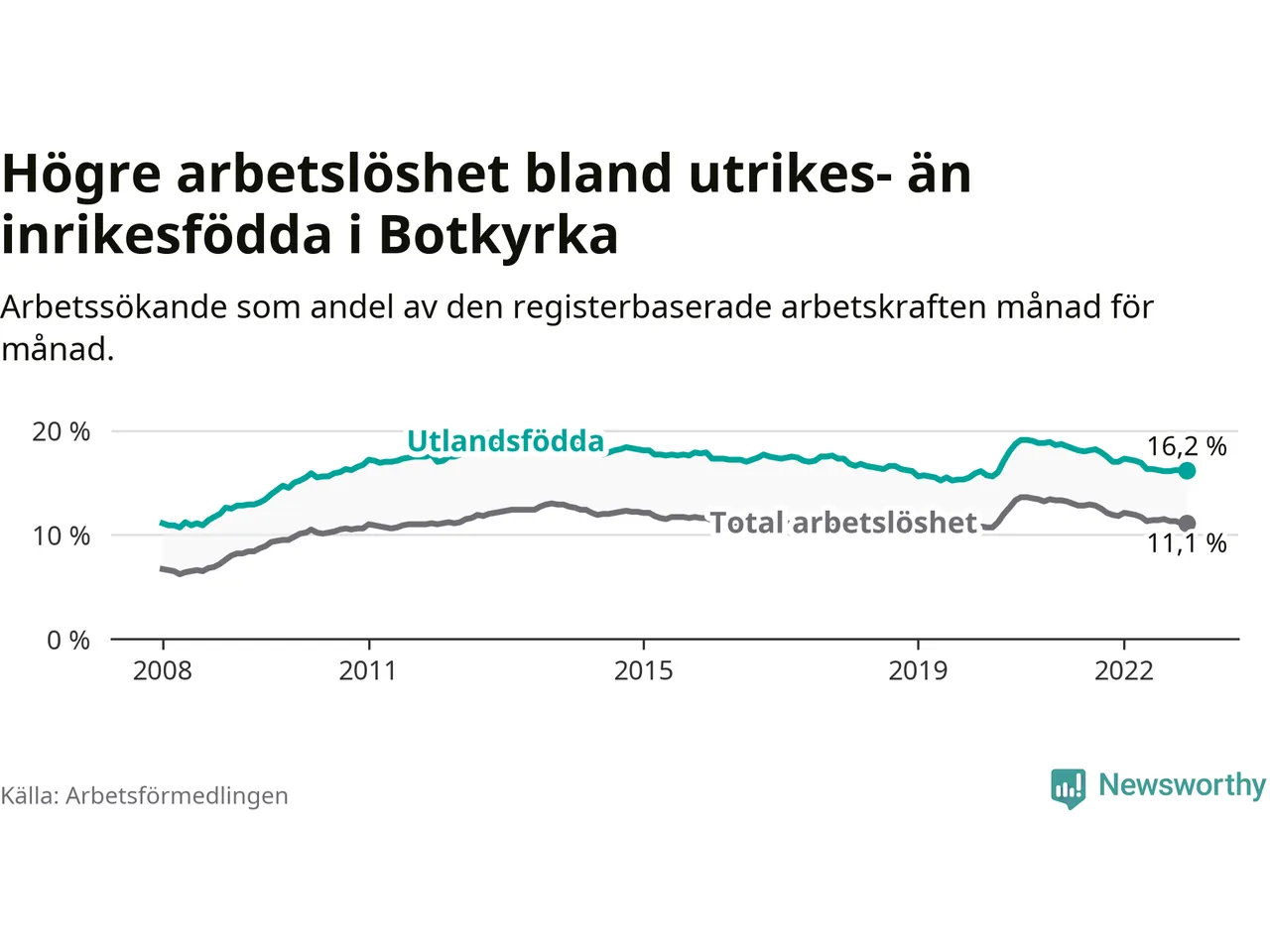 Arbetslösheten bland utlandsfödda var 16,2 procent i Botkyrka under december månad, motsvarande 4 133 av 25 512 personer. Det är 0,8 procentenheter färre än vid samma tidpunkt i fjol (−334 om man räknar personer). Därmed är de utlandsföddas arbetslöshet lägre än vid samma tidpunkt i fjol för 19:e månaden i följd. Sedan maj 2021 har arbetslösheten bland utlandsfödda minskat från 18,1 till 16,2 procent.