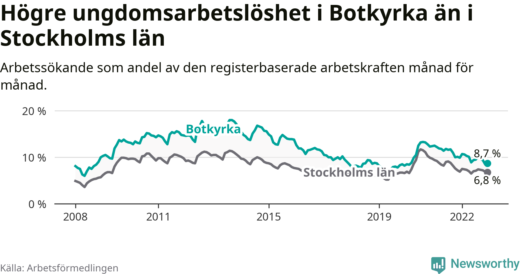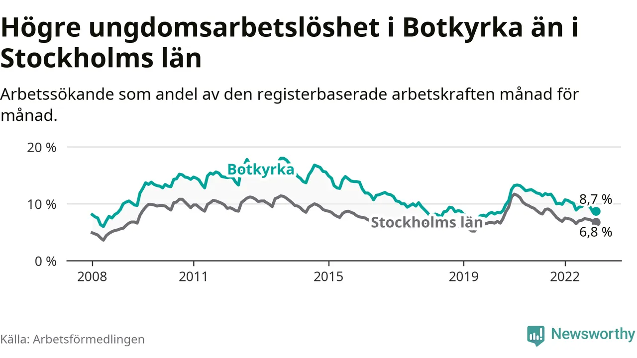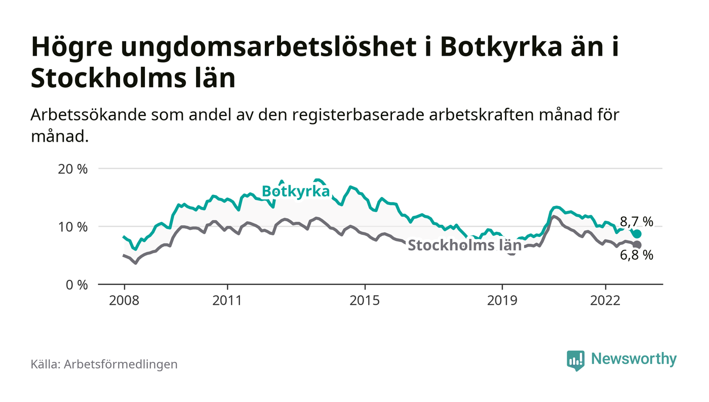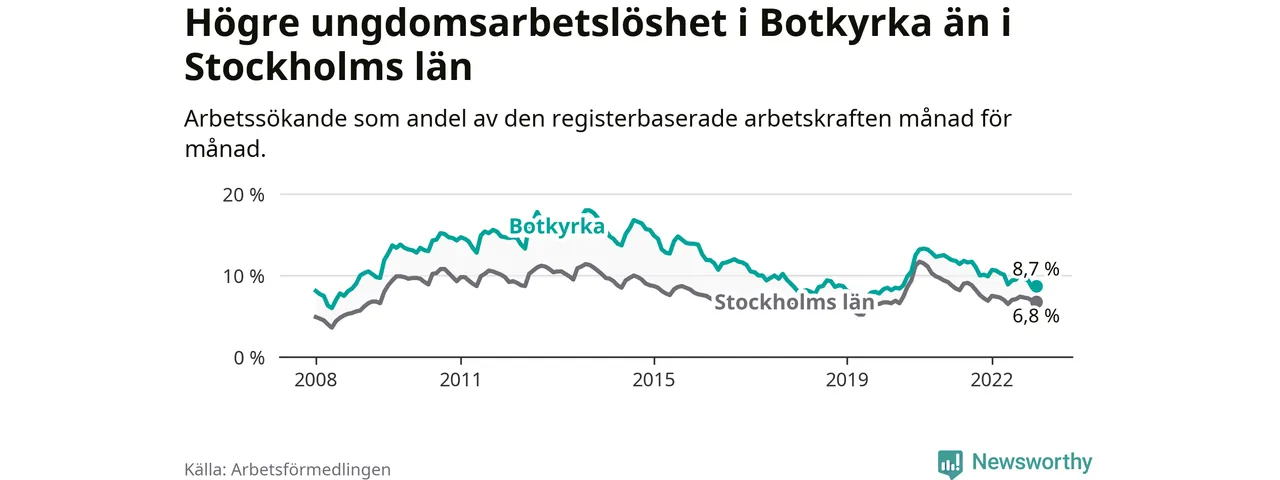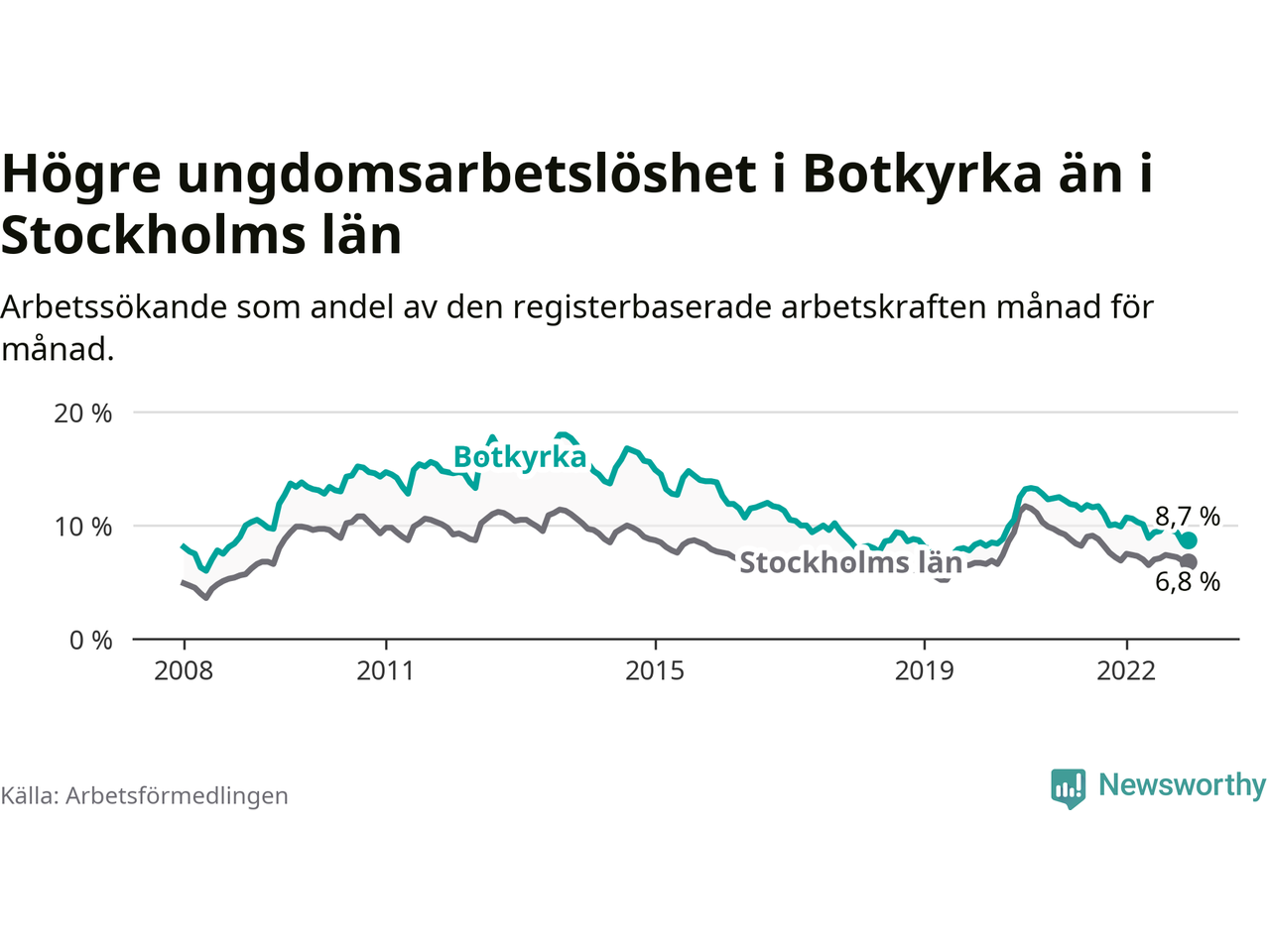 Precis som den totala arbetslösheten ligger ungdomsarbetslösheten i Botkyrka högre än i Stockholms län som helhet. Skillnaden mellan kommunen och länet är 1,9 procentenheter.